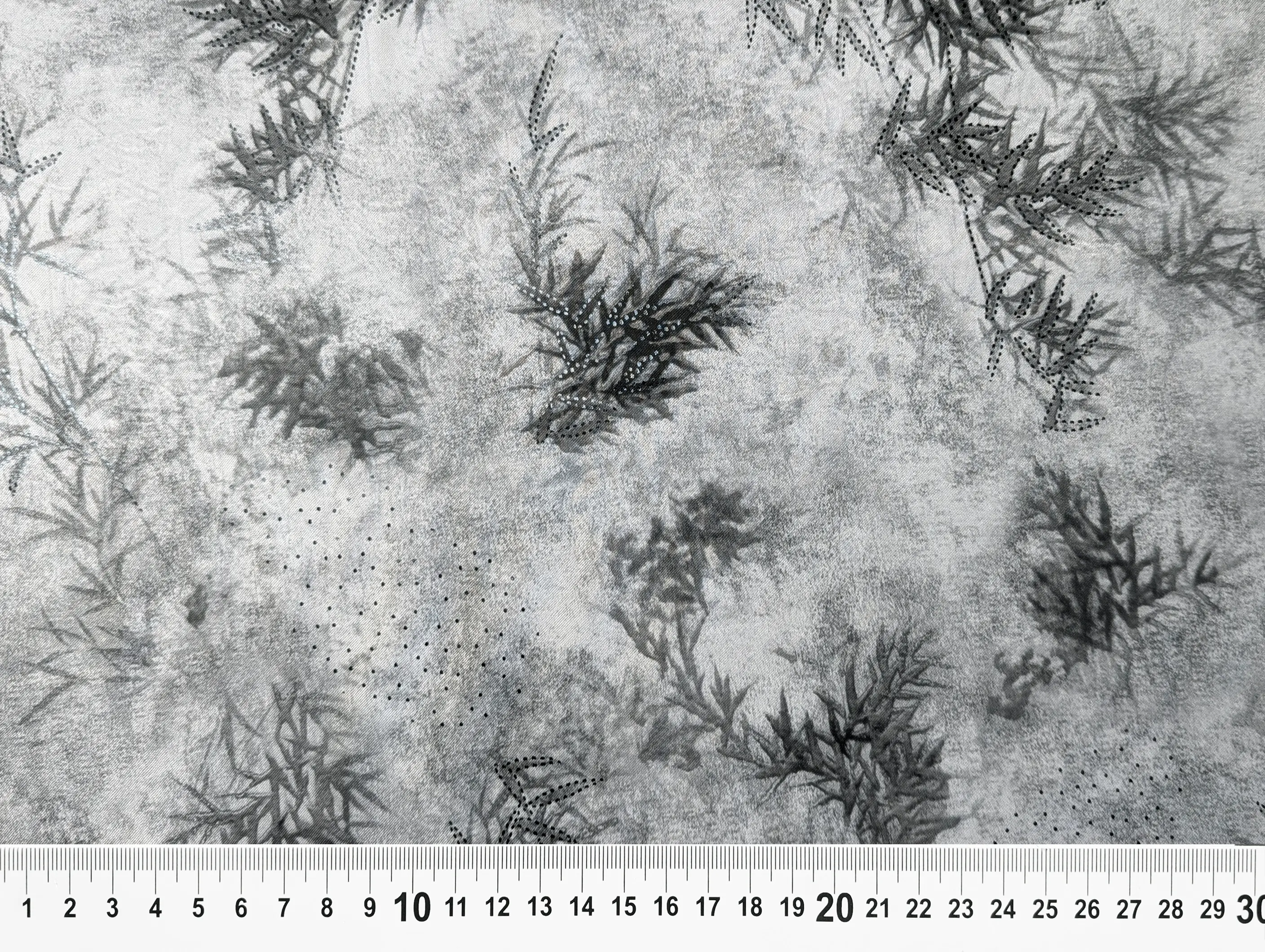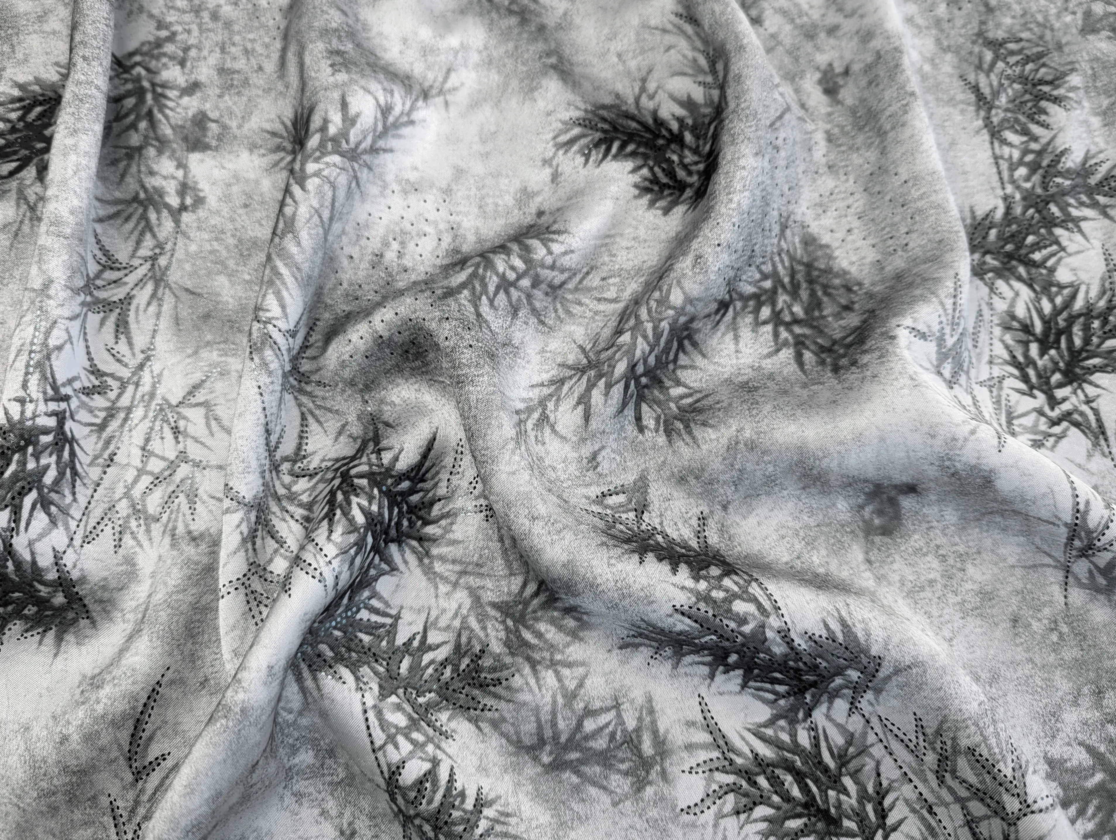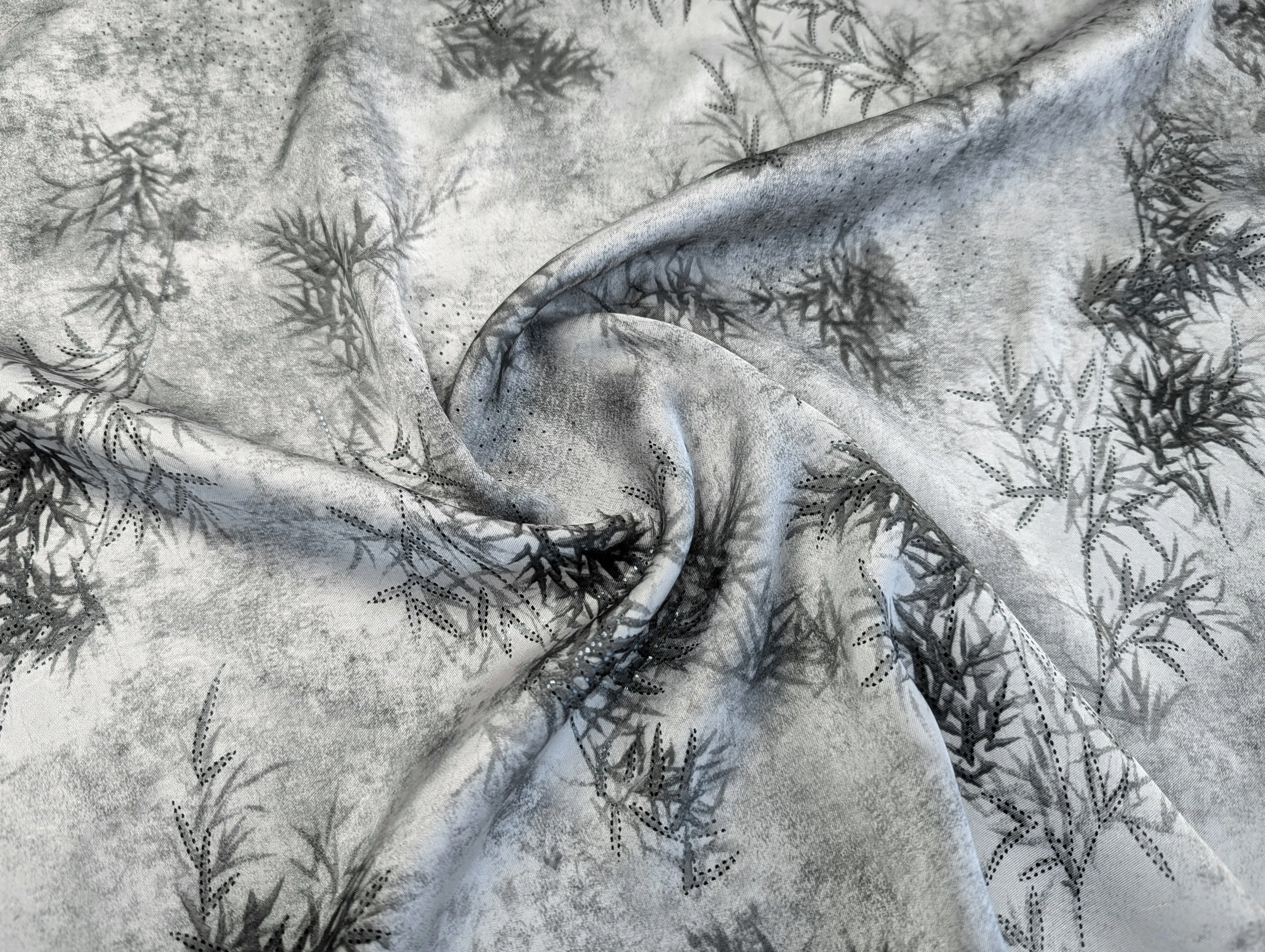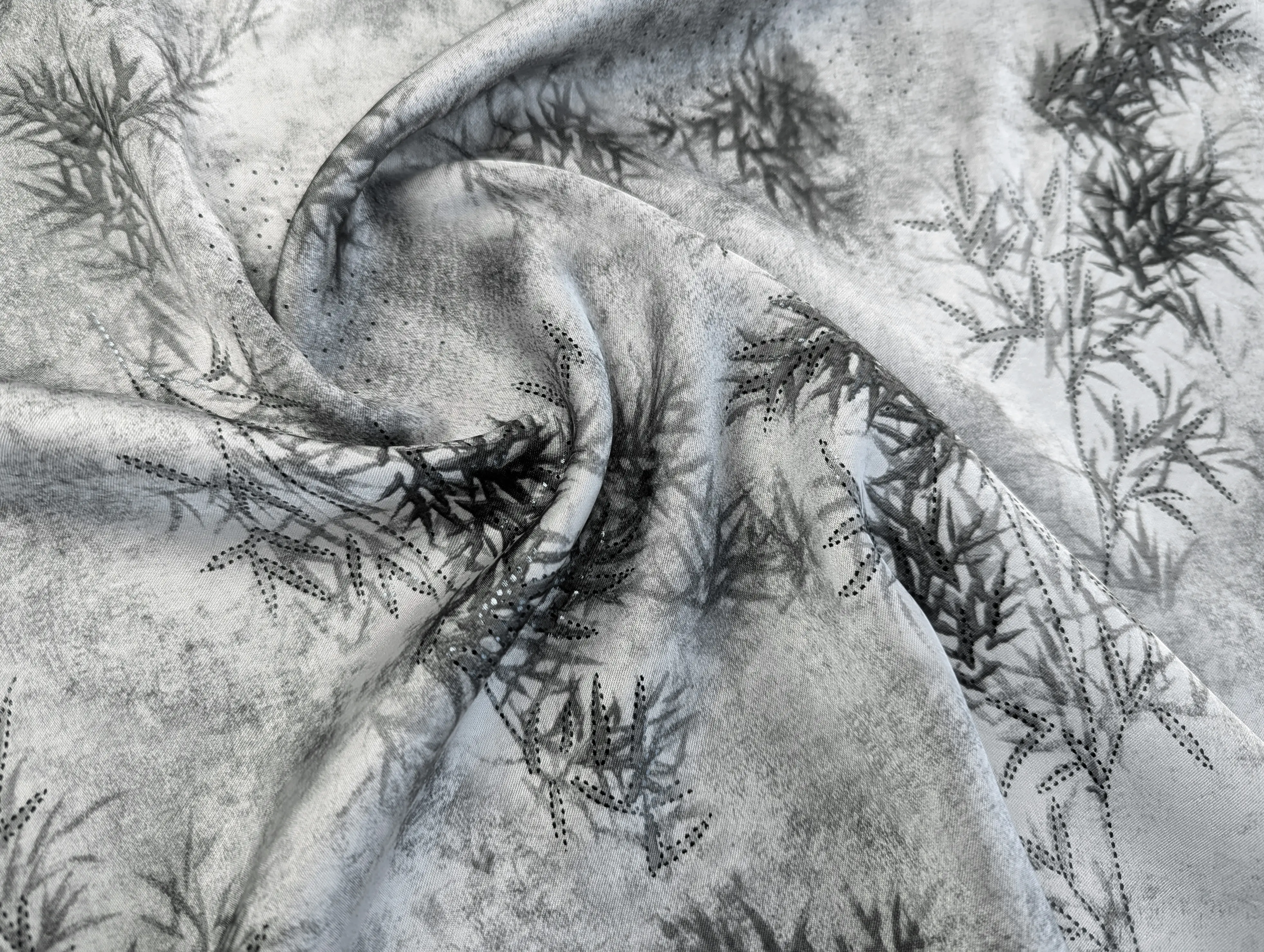 Полотно украшено изысканным 3D-принтом, который придаёт изделиям глубину и объём, а также мелкими точками из фольги черного цвета , которые изящно мерцают при освещении. Такой декоративный эффект добавляет ткани роскошный и праздничный вид.
