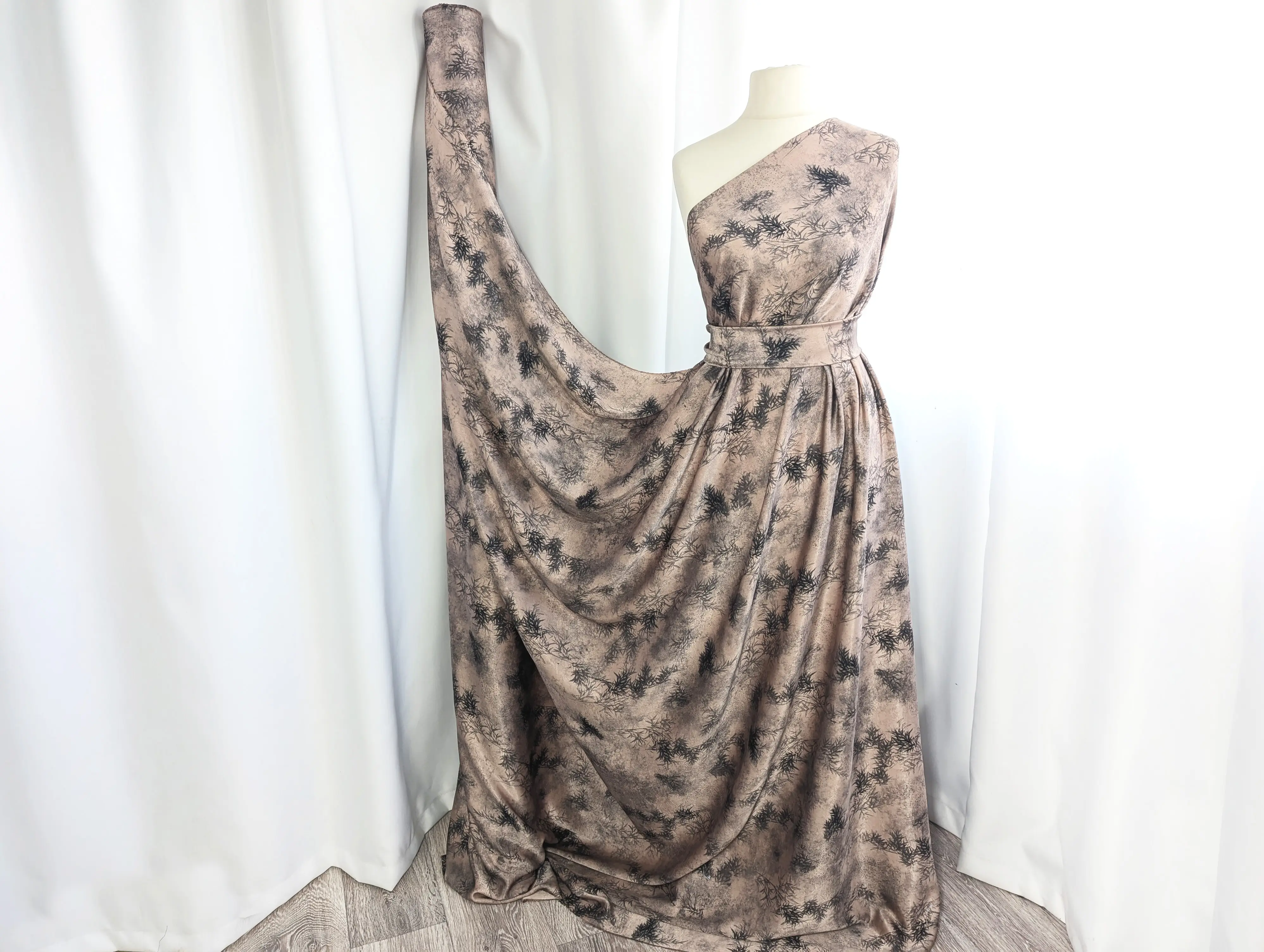 Полотно украшено изысканным 3D-принтом, который придаёт изделиям глубину и объём, а также мелкими точками из фольги черного цвета , которые изящно мерцают при освещении. Такой декоративный эффект добавляет ткани роскошный и праздничный вид.
