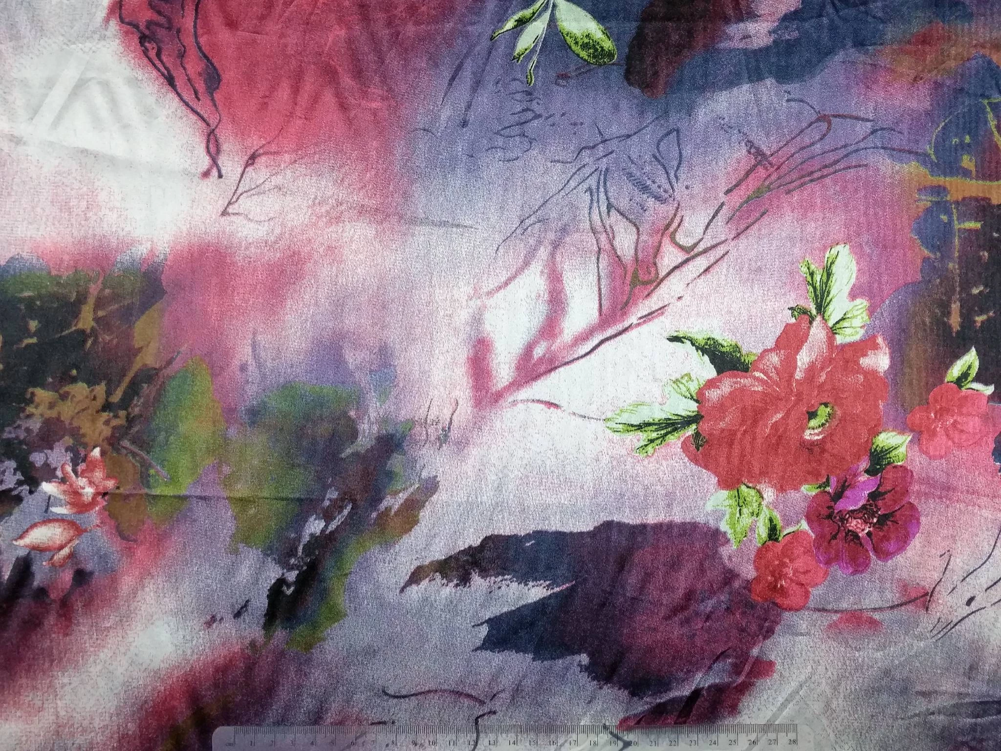 Атлас стрейчевый цветочная акварель, красный (с24, 1208014A, д3 цв3)