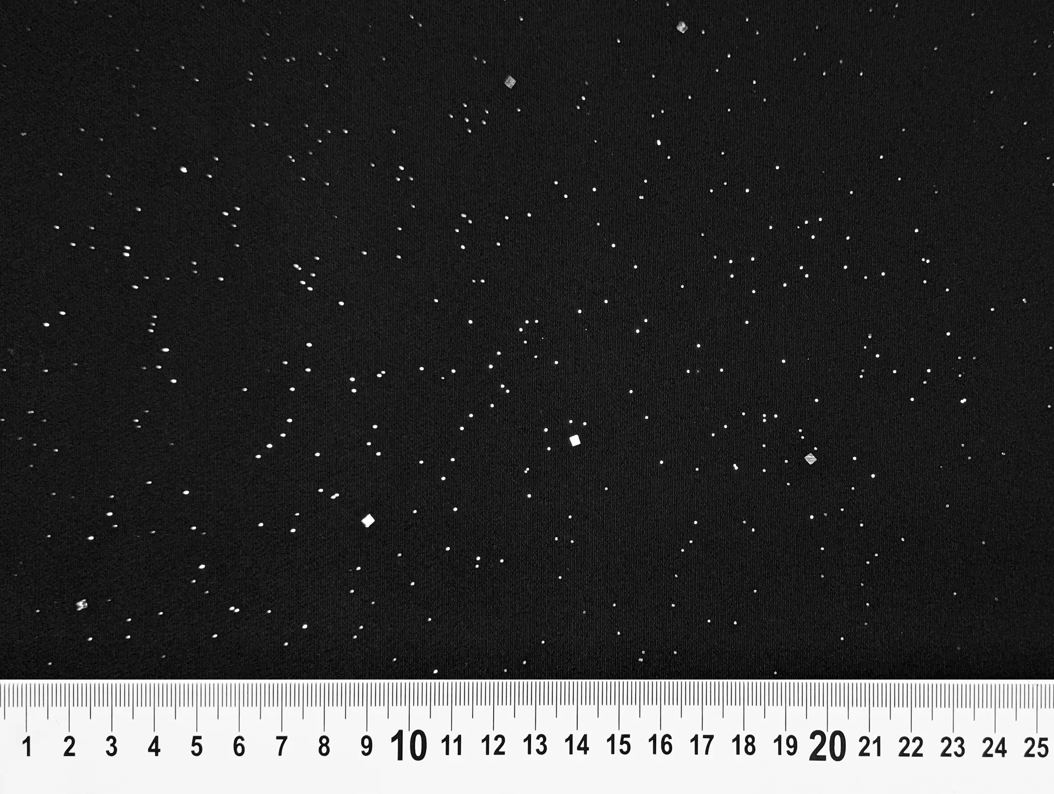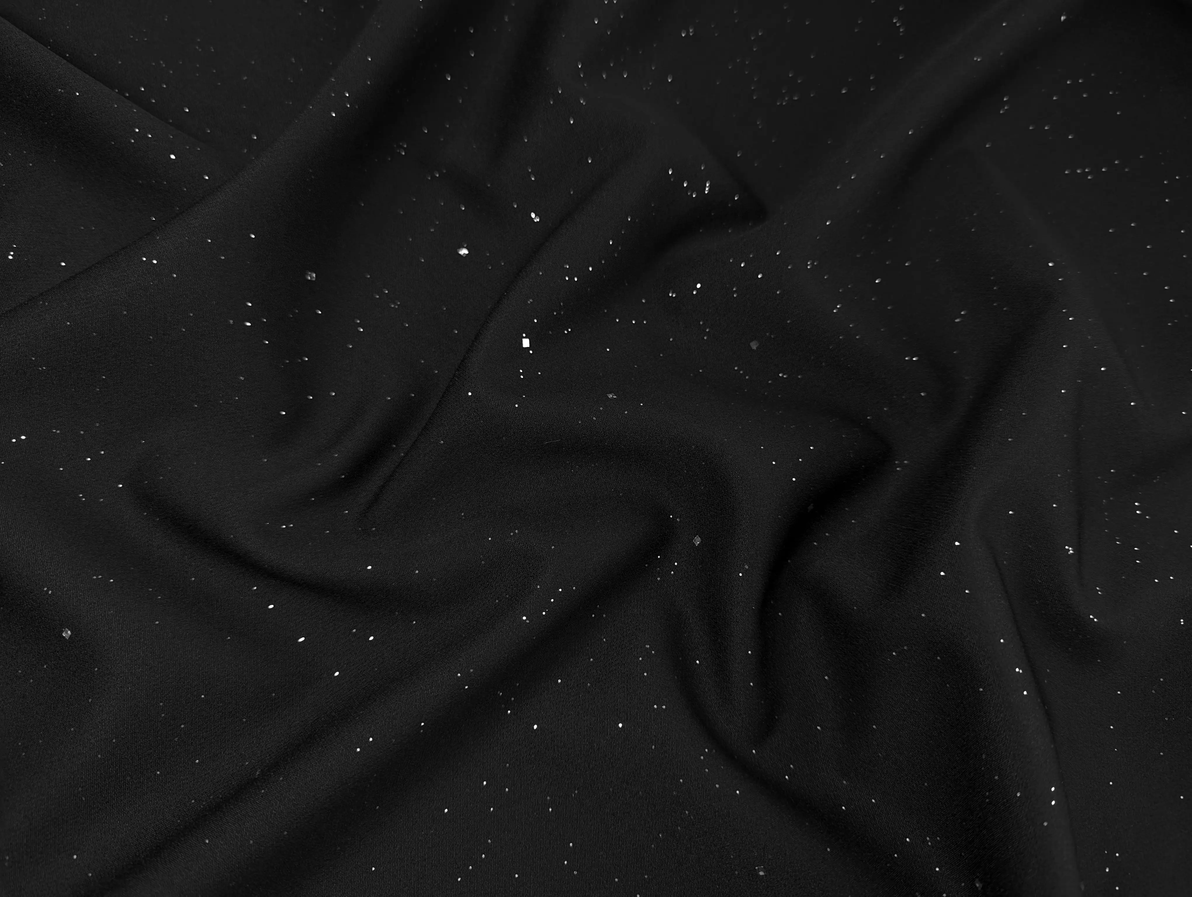 Дополнительно ткань украшена мелким глиттером в виде звёздного неба, который придаёт ей изысканное мерцание. Блёстки надёжно закреплены в материале и не осыпаются, что делает её не только эффектной, но и практичной в использовании.