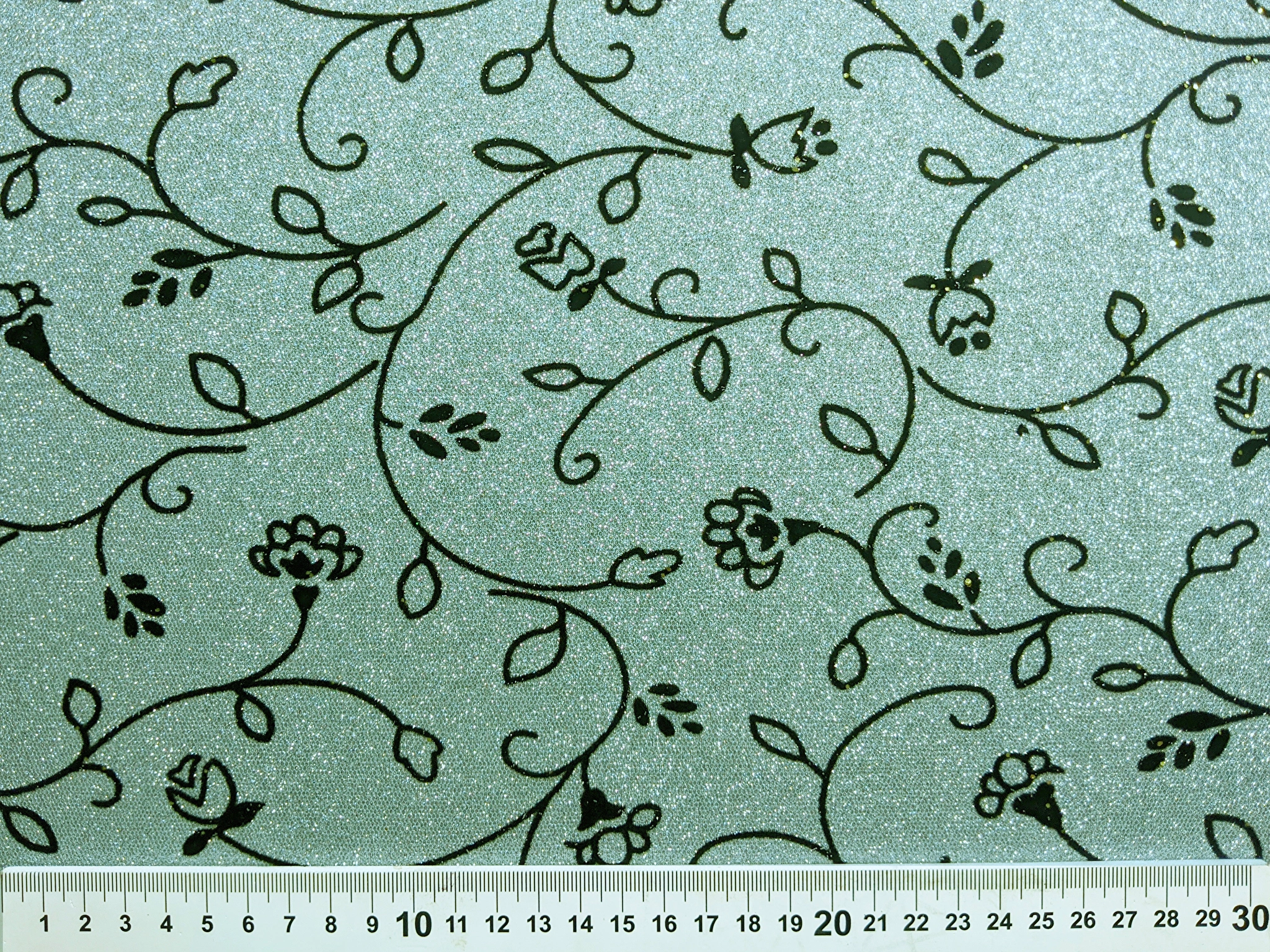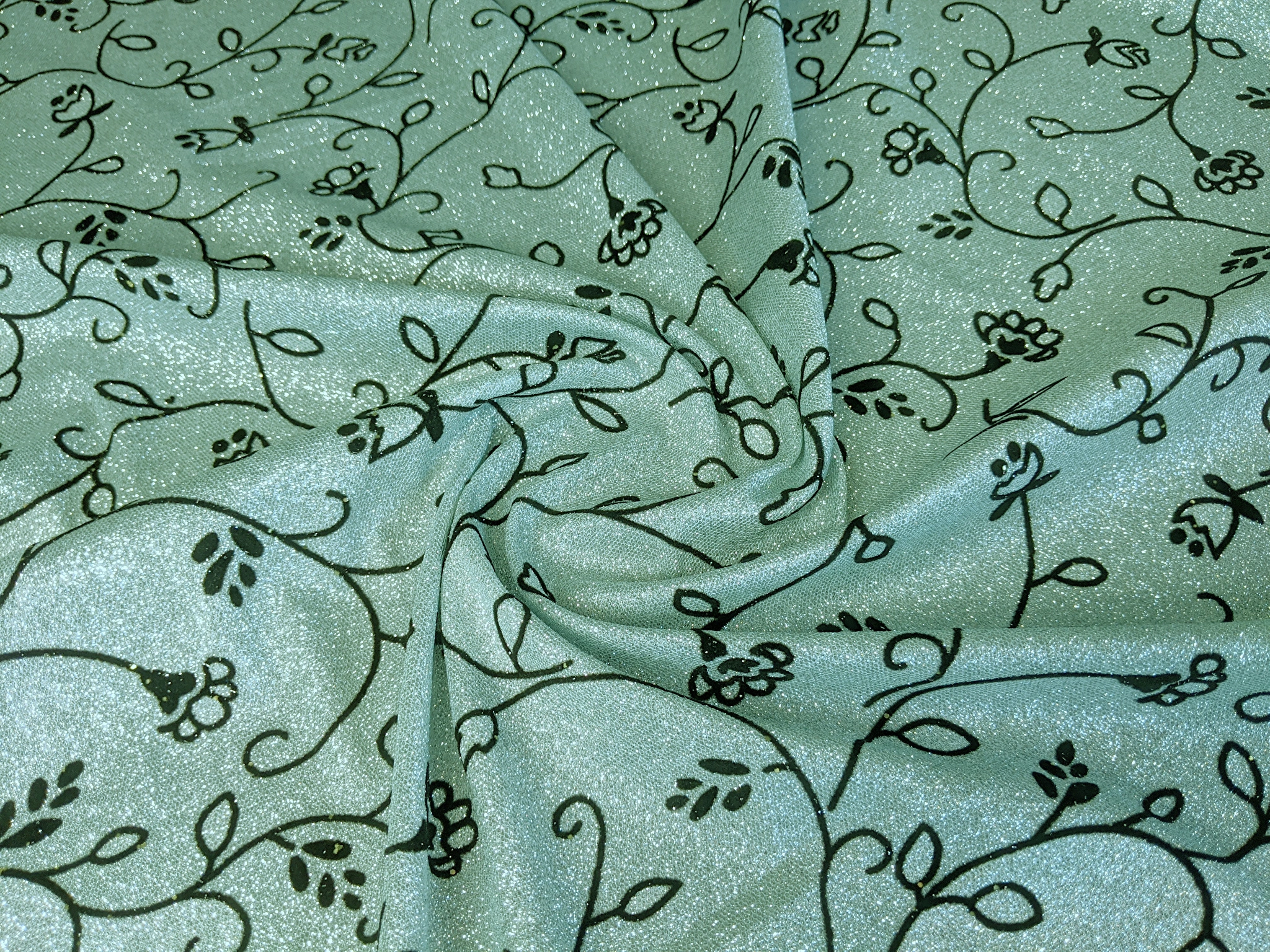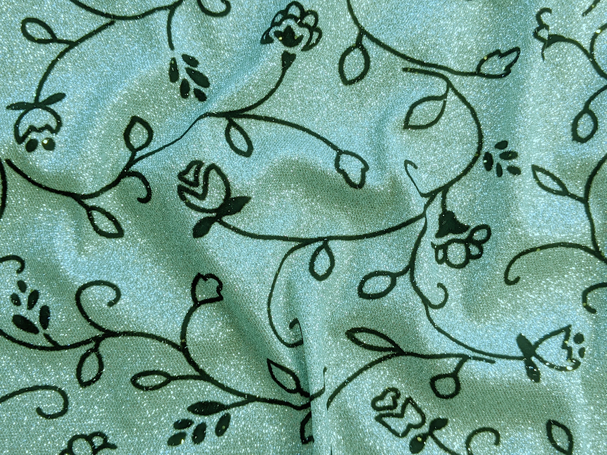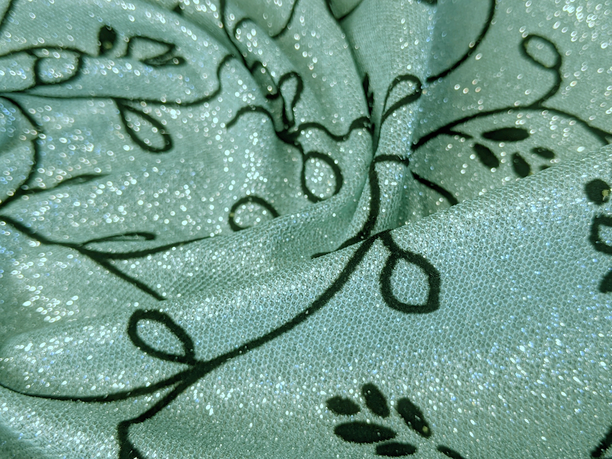 Диско флок - это блестящее трикотажное полотно с напылением. С лицевой стороны нанесен нежный цветочный узор из бархатного напыления, а изнаночная сторона гладкая. Полотно не светится, немного тянется.