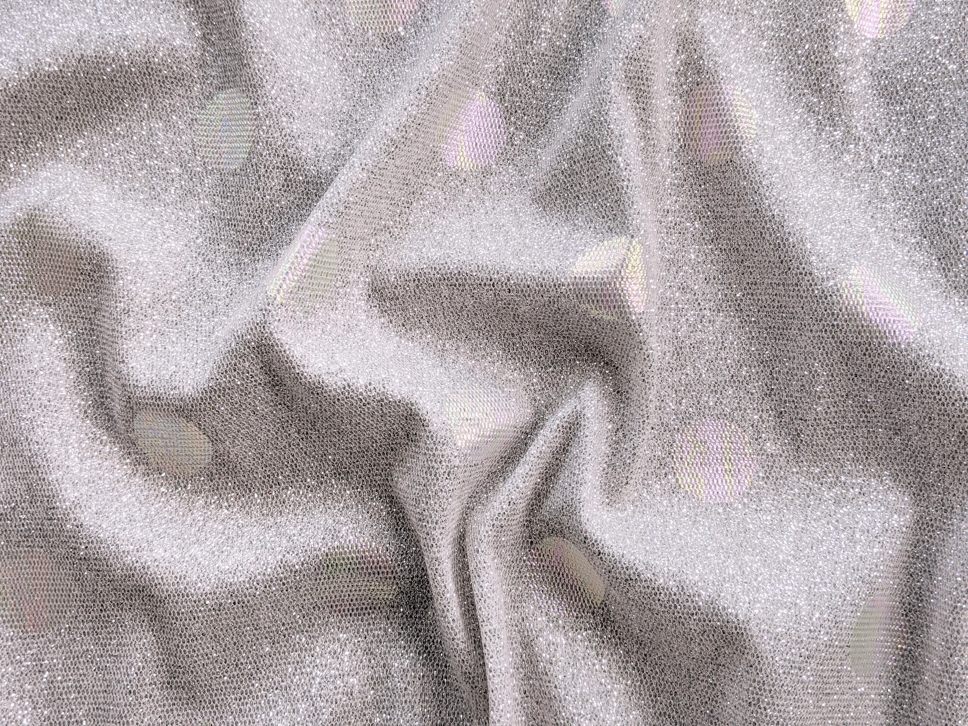 Трикотаж диско с горошками - это блестящее трикотажное полотно с напылением. С лицевой стороны горошки с радужным окрасом, а изнаночная сторона гладкая. Полотно немного тянется, не светится, не мнется.