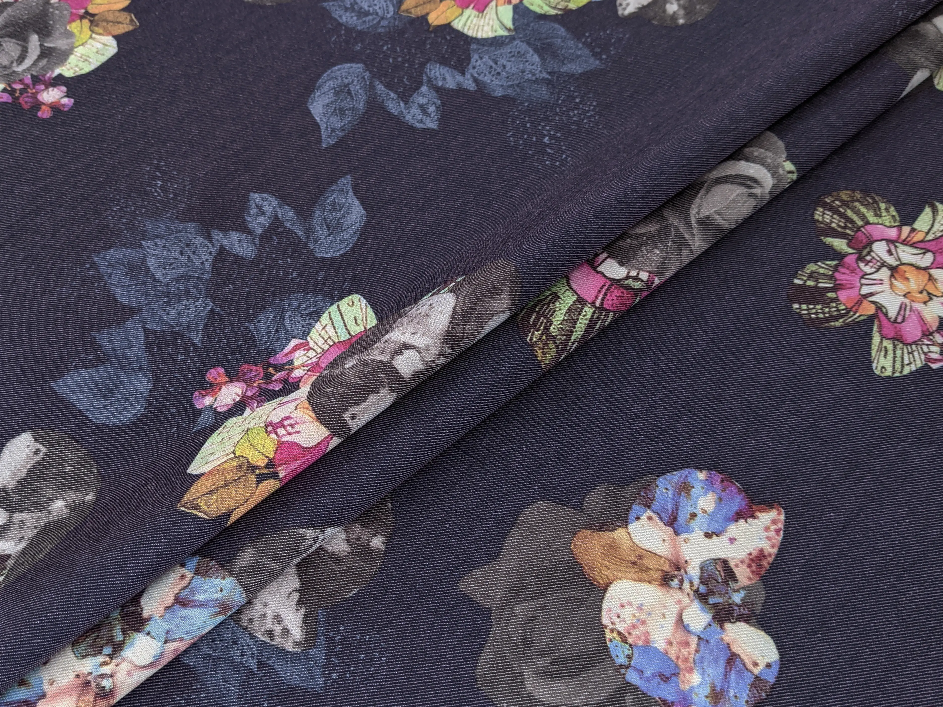 Плотная джинсовая ткань с нанесенным цветочным рисунком. Имеет диагональное плетение на лицевой стороне, немного эластичный. Не просвечивается и не сминается. В составе имеет коттон и немного спандекса. Полиэстер делает ткань практичной и износоустойчивой. Применяется для пошива летних платьев, рубашек, жакетов и эко сумок.