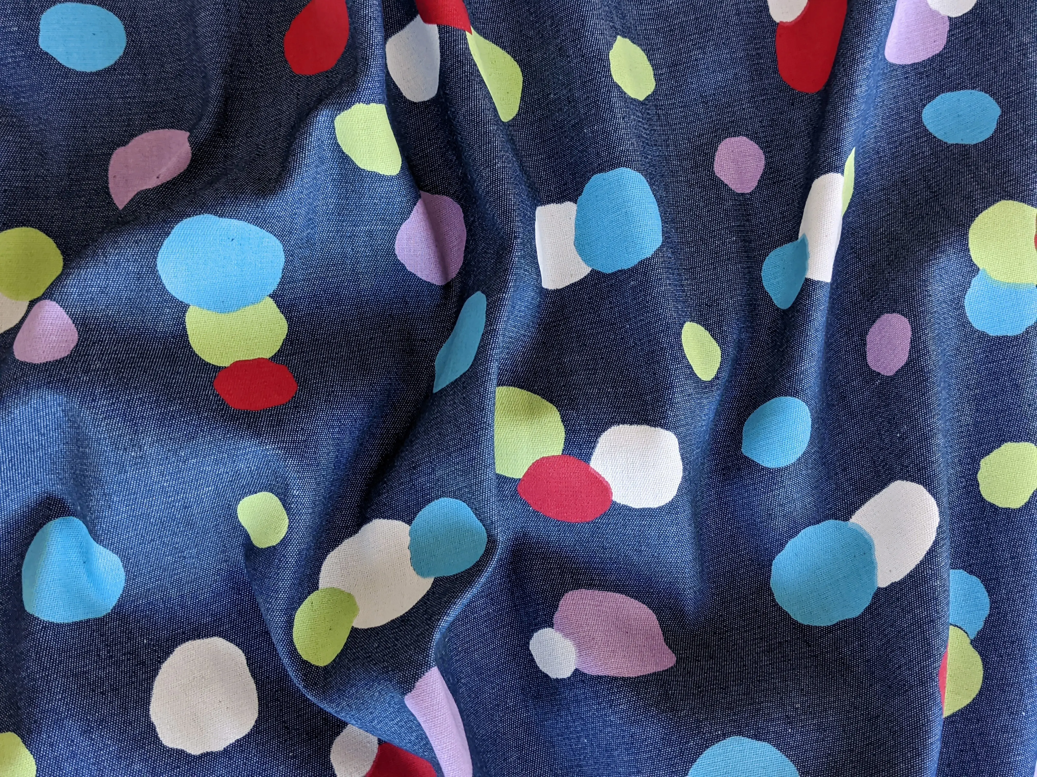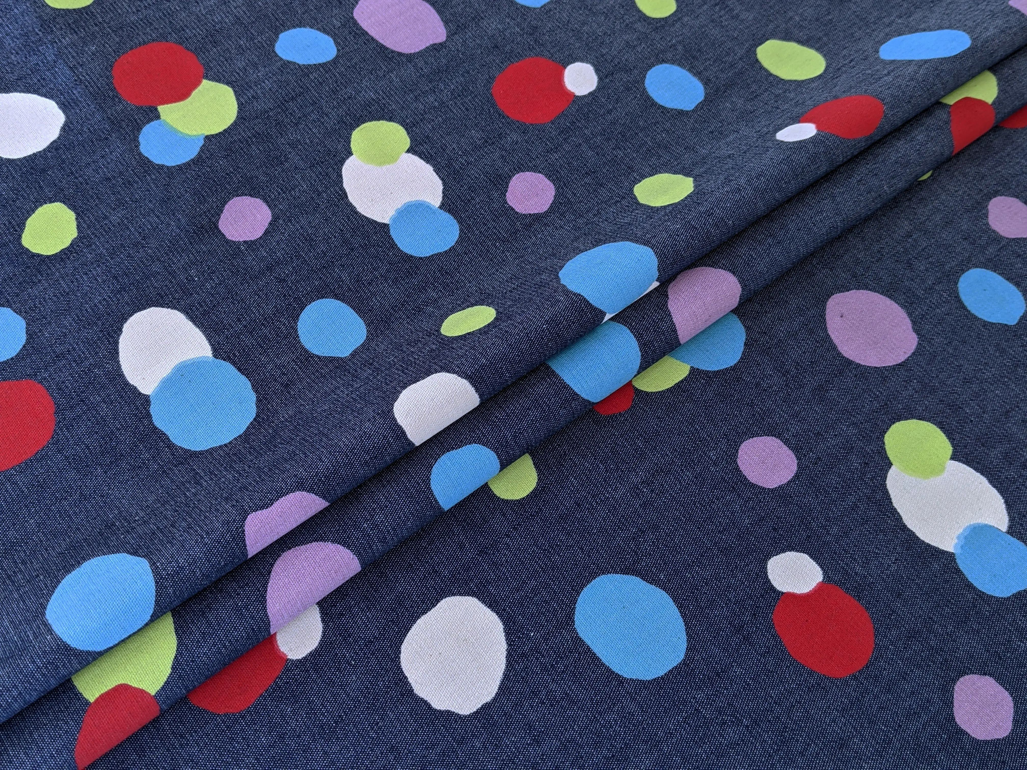 Джинс коттон яркие горохи с красным, темно-голубой (отрез 0,5 м)