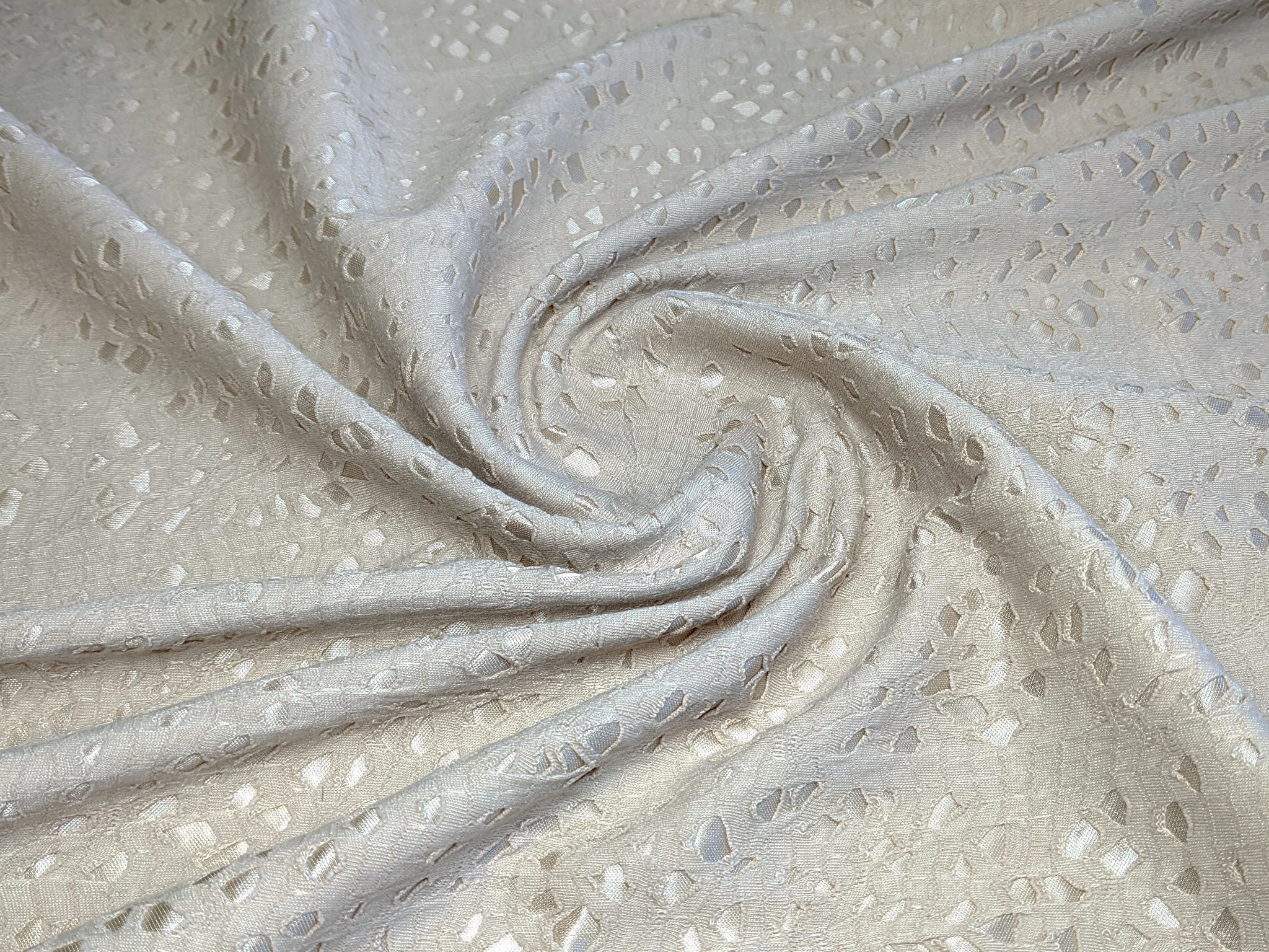 Ажурная трикотажная ткань с плетением в виде сетчатого рисунка. Материал средней плотности, несминаемый, приятный на ощупь, эластичный по ширине, хорошо держит форму, не прозрачный на теле. Применяется для пошива платьев, юбок, топов, блуз.
