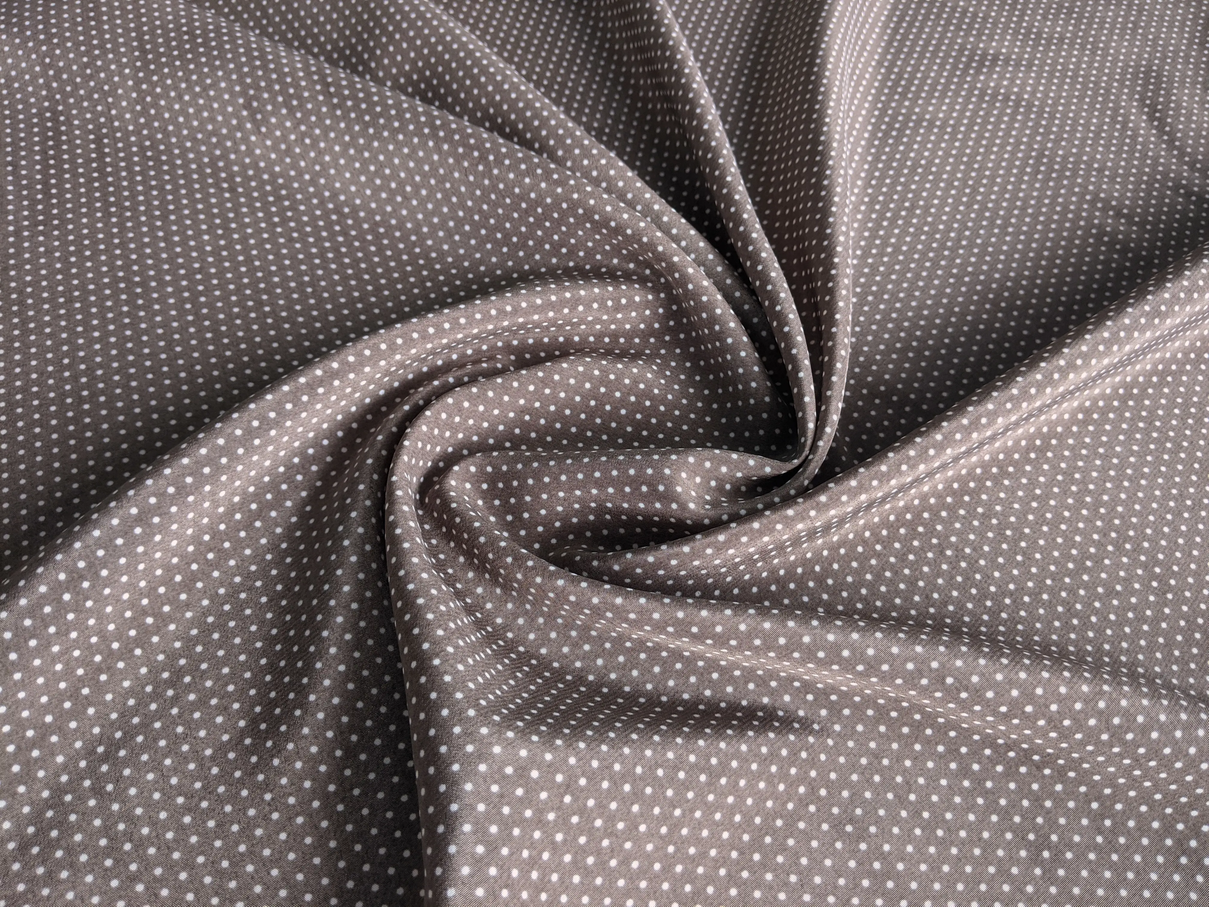 Ткань кашибо бежевого цвета с классическим принтом горох применяется для пошива праздничных нарядов - юбок и платьев.
