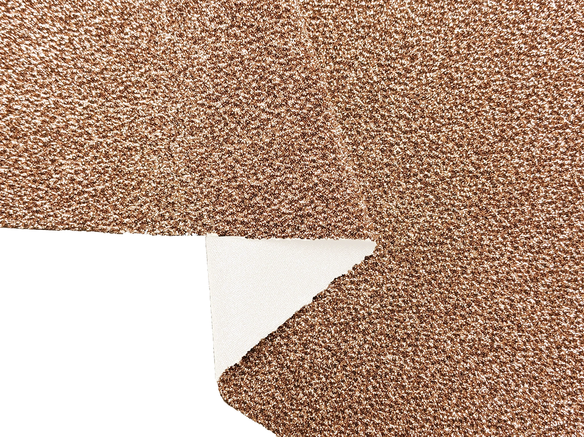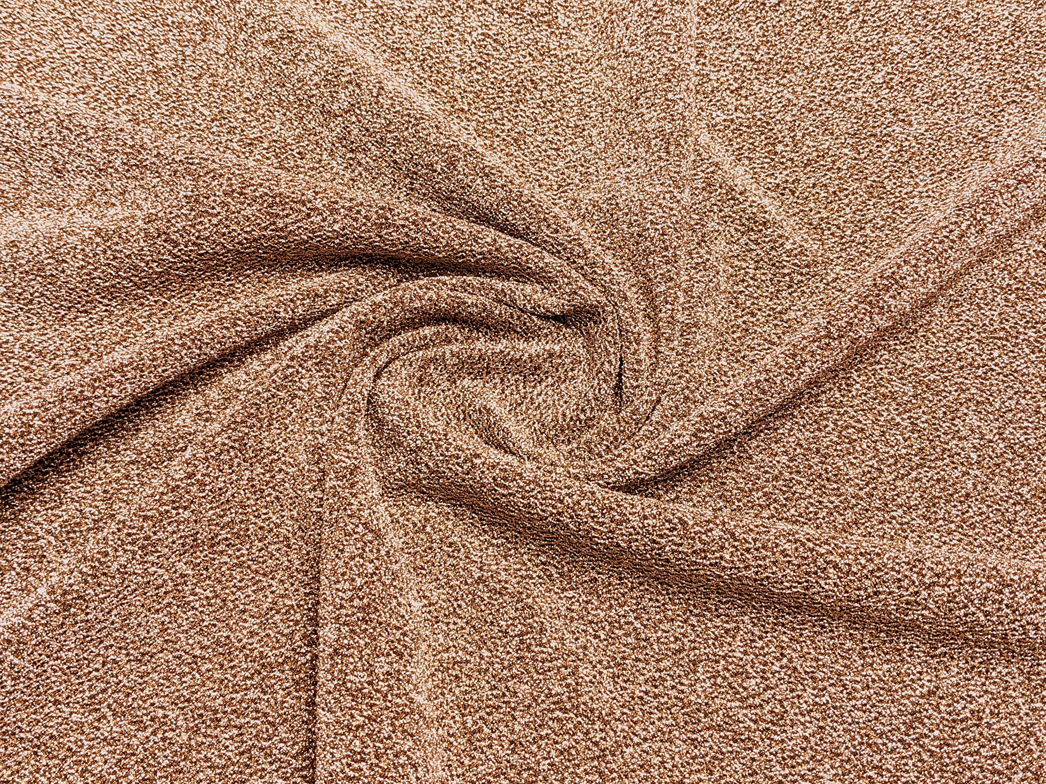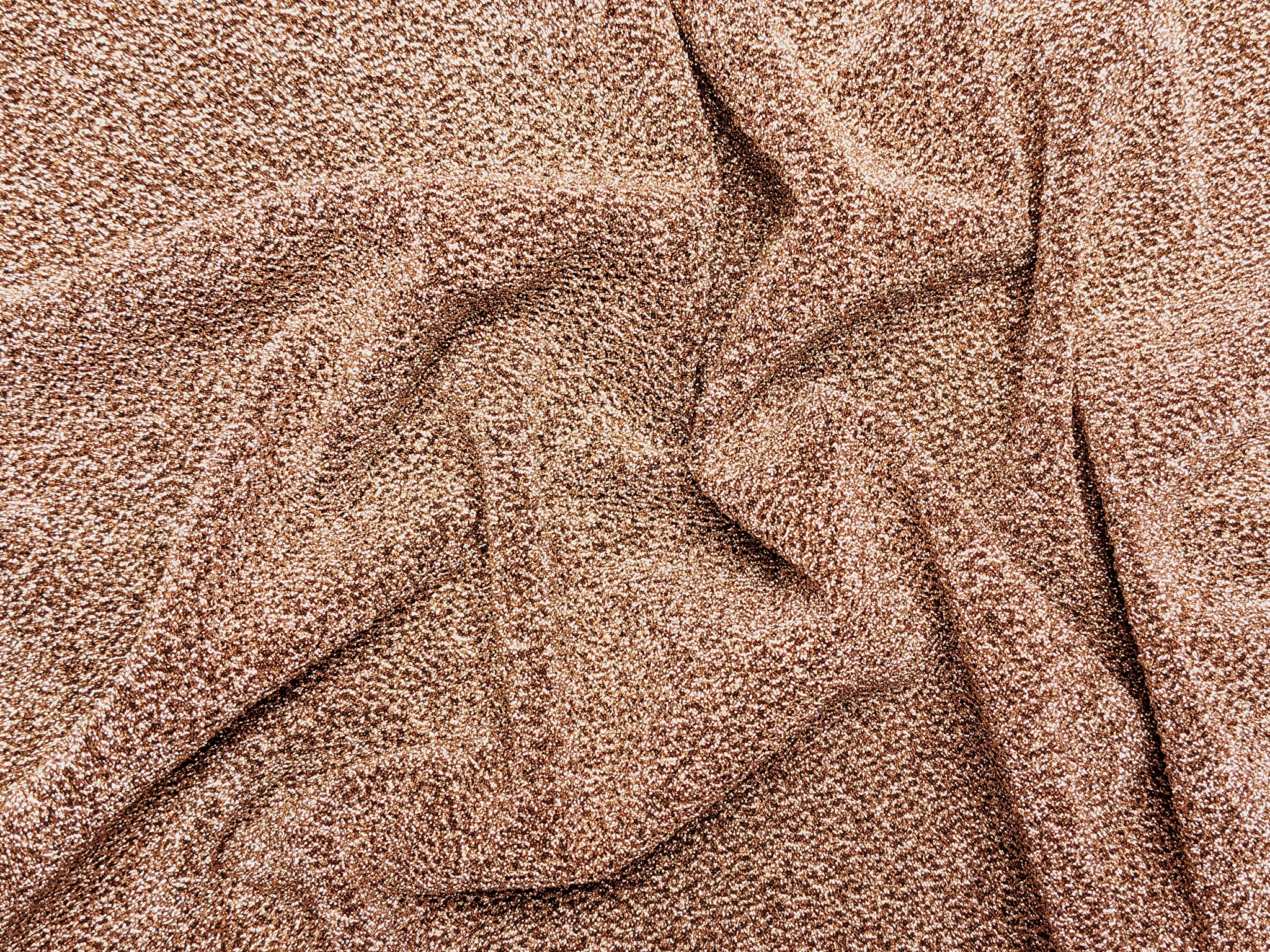 Киви люрекс - это трикотажное полотно средней плотности. Лицевая сторона имеет зернистую структуру из-за часто вплетенных люрексовых нитей, которые образуют фактурный ворс и мерцающий блеск, изнанка - гладкая. Ткань эластичная, имеет хорошую растяжимость в обе стороны, не сминается, в складки ложится мягко, непрозрачная на теле.