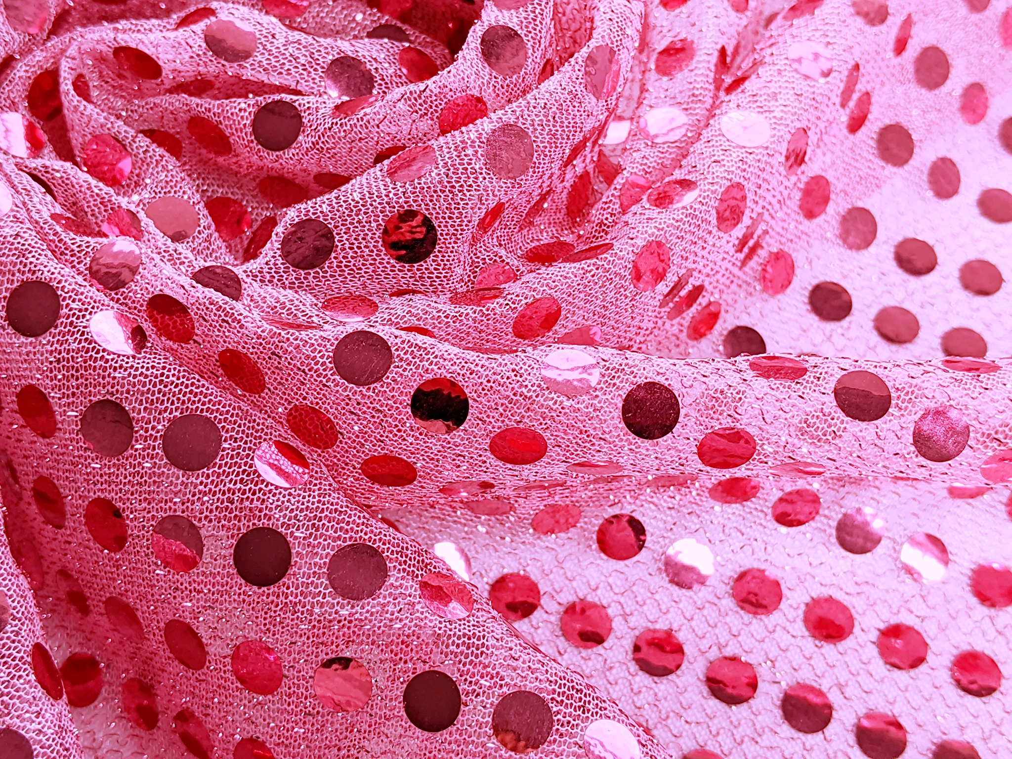 Круглые пайетки нанесены линией на сетчатую основу по всему полотну. Ткань не тянется, блестит и имеет просвет, поэтому для пошива платьев или юбок требуется дополнительная подкладочная ткань. Пайетки плотно прилегают к сетке и не осыпаются. Ткань не сминается и требует деликатного ухода. Применяется для пошива изделий танцевально-карнавального направления.