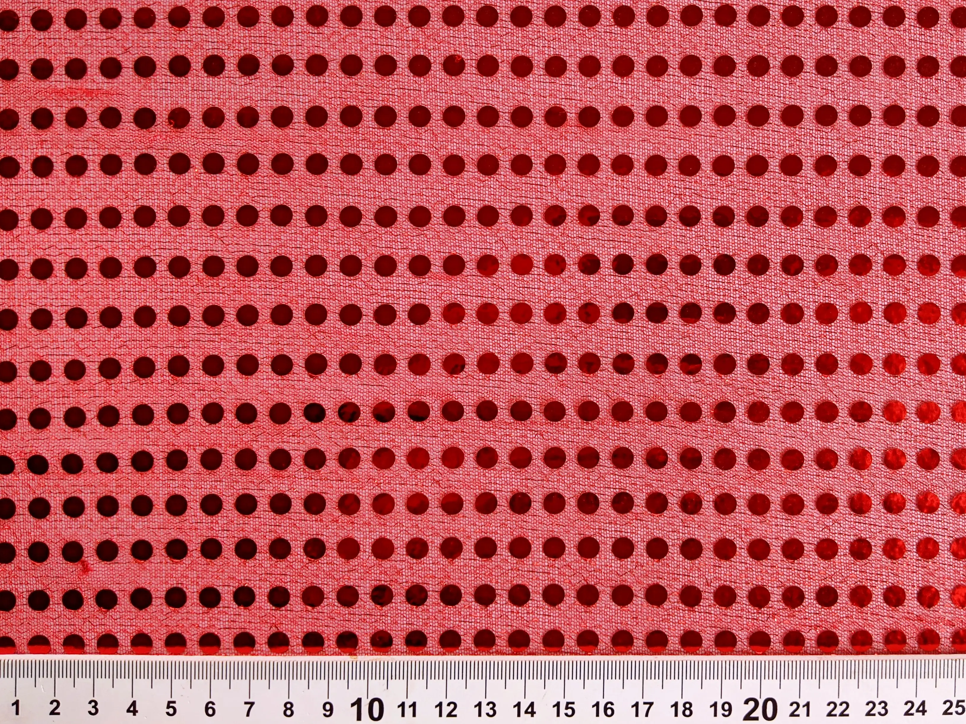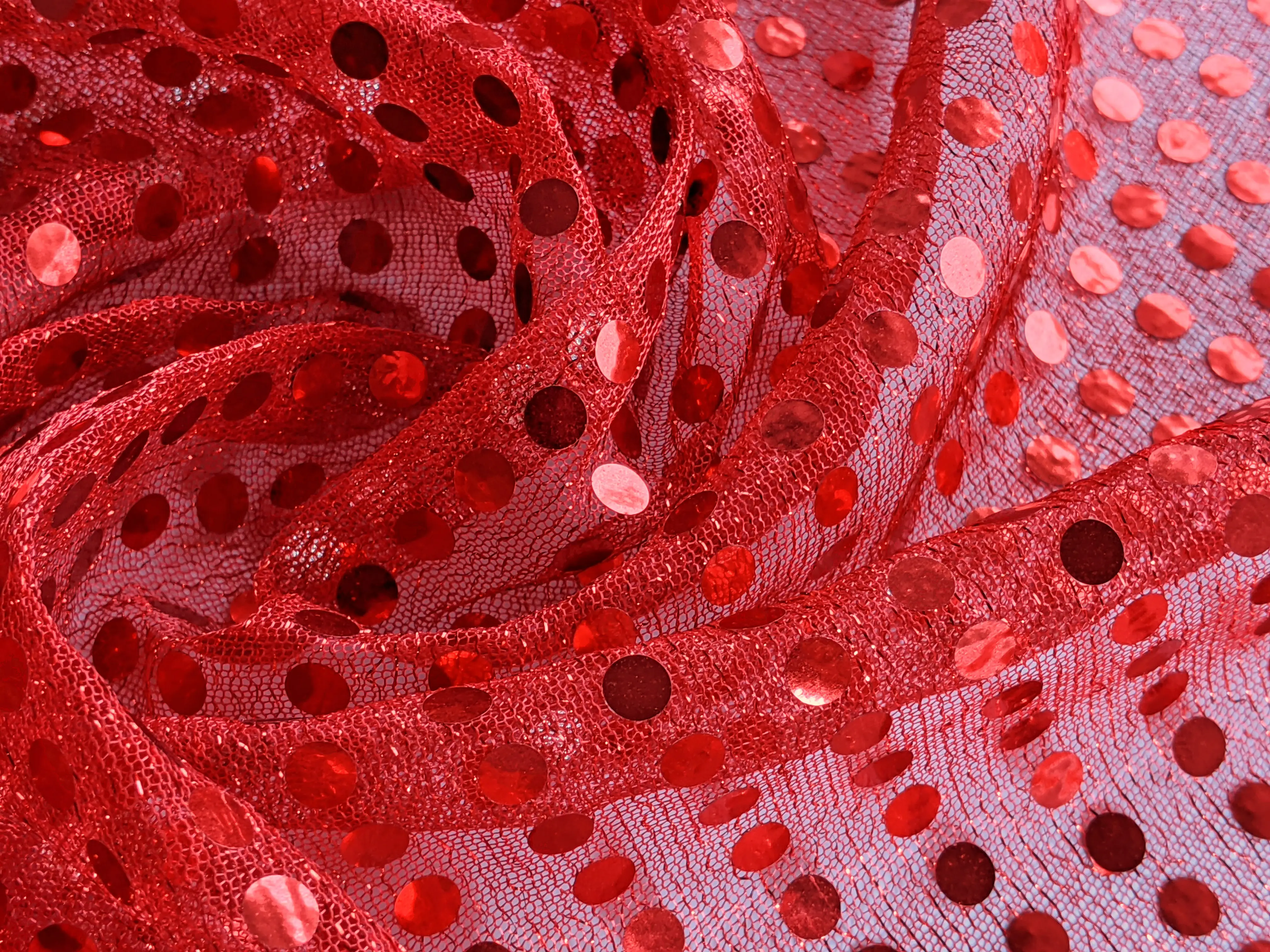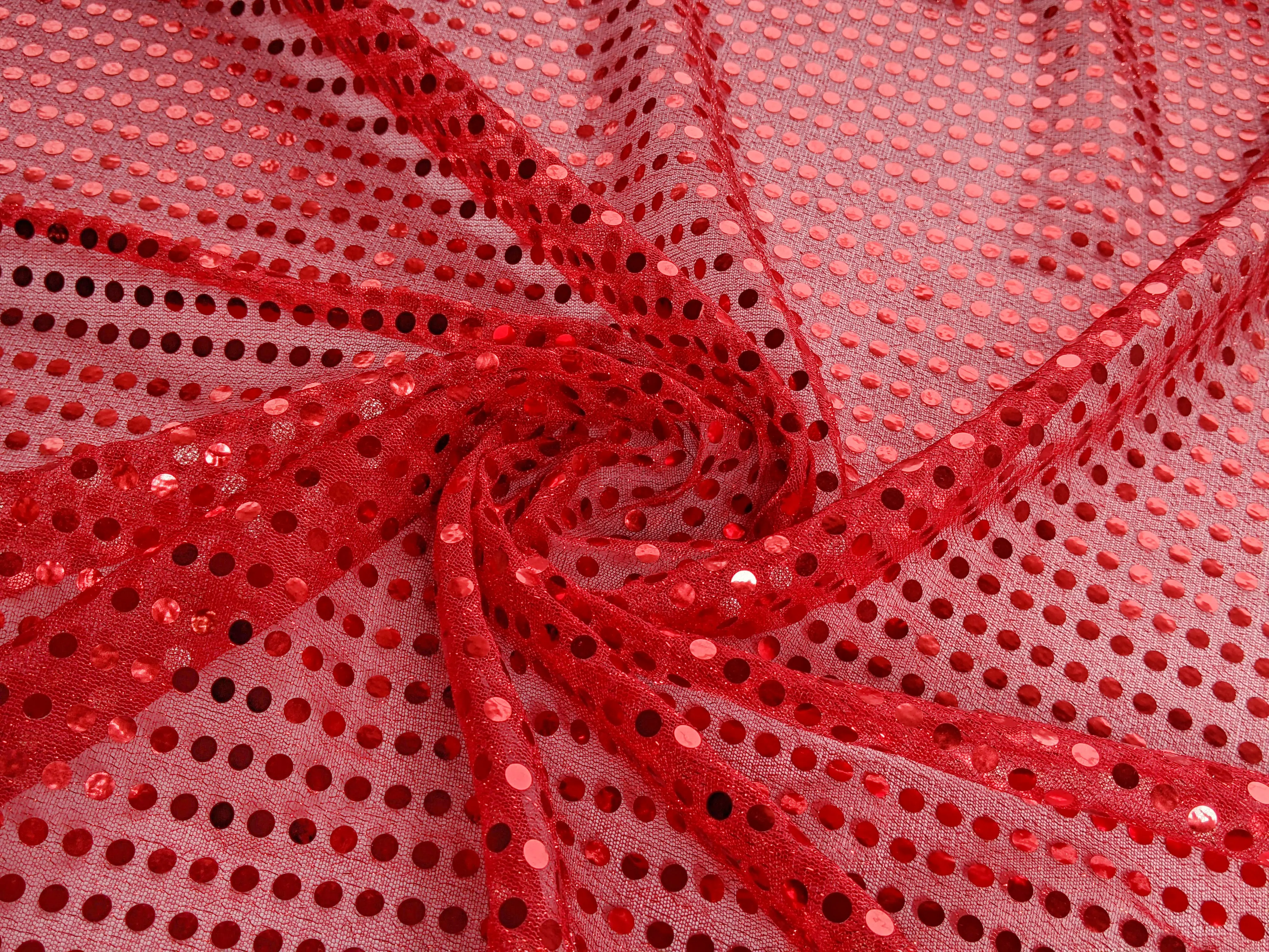 Круглые пайетки нанесены линией на сетчатую основу по всему полотну. Ткань не тянется, блестит и имеет просвет, поэтому для пошива платьев или юбок требуется дополнительная подкладочная ткань. Пайетки плотно прилегают к сетке и не осыпаются. Ткань не сминается и требует деликатного ухода. Применяется для пошива изделий танцевально-карнавального направления.