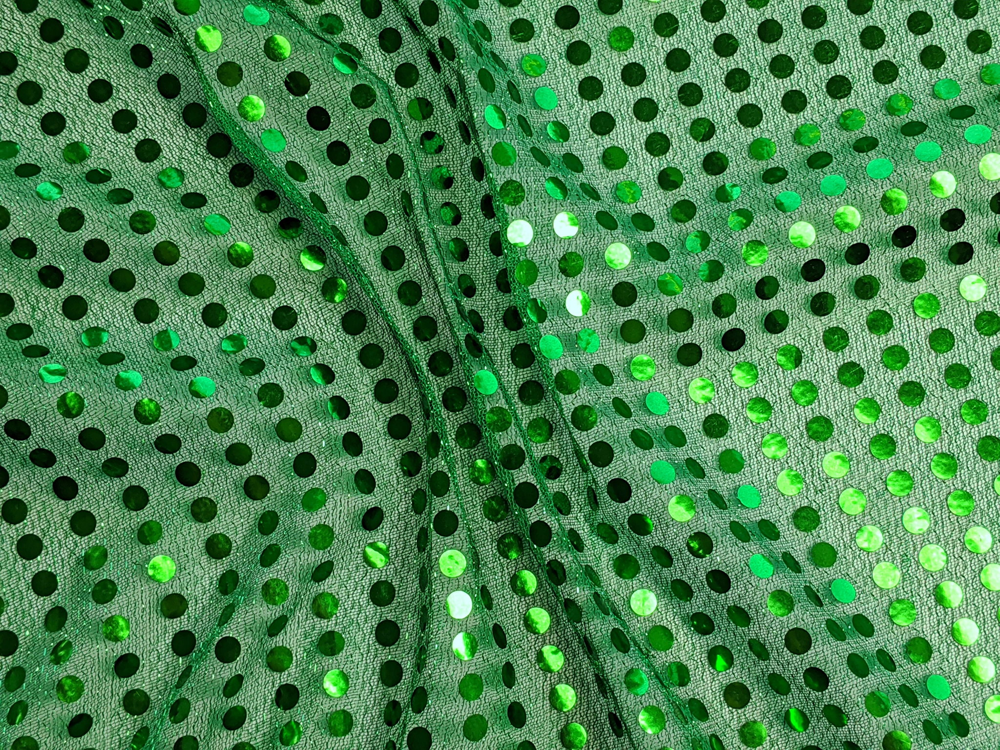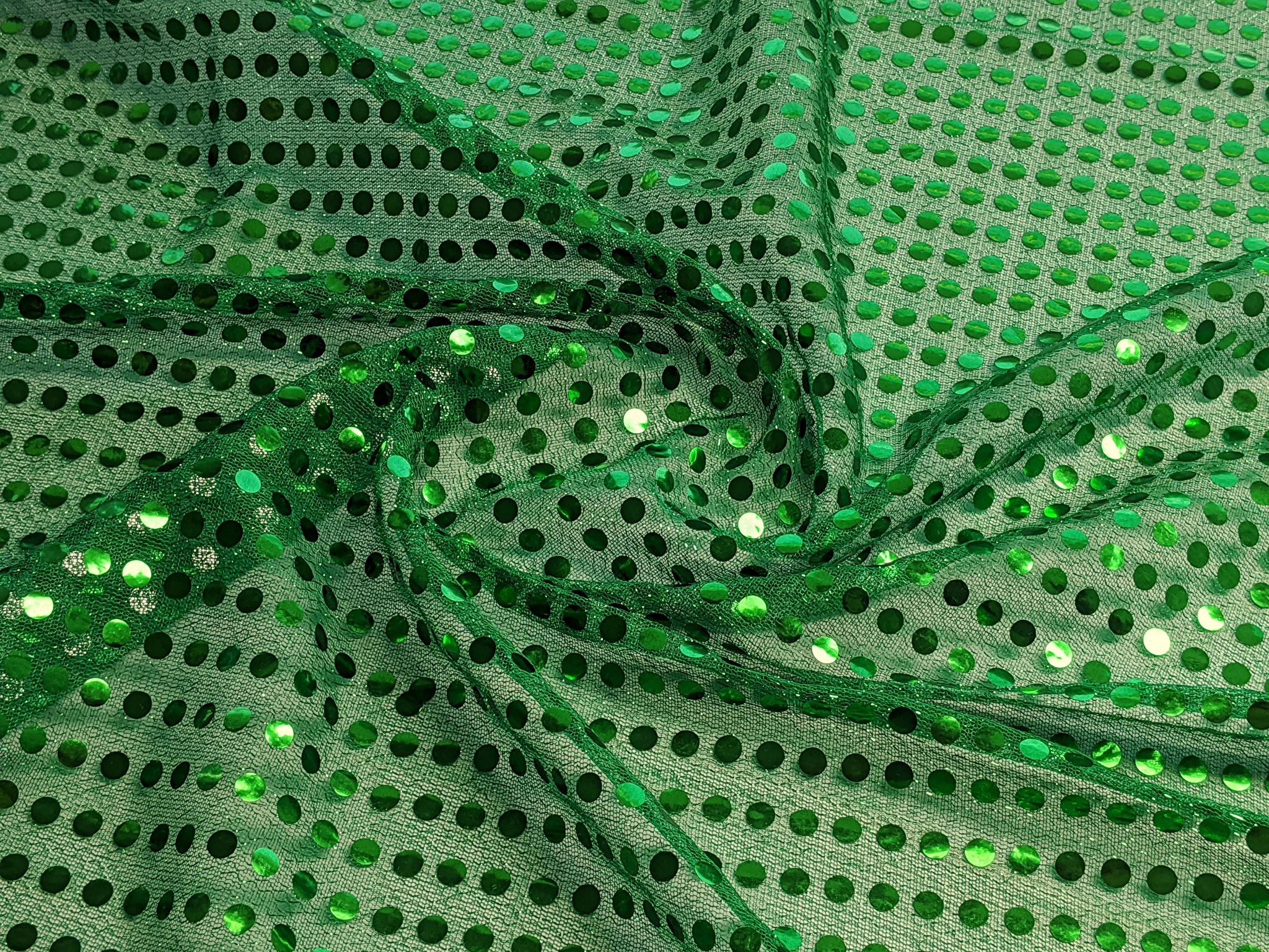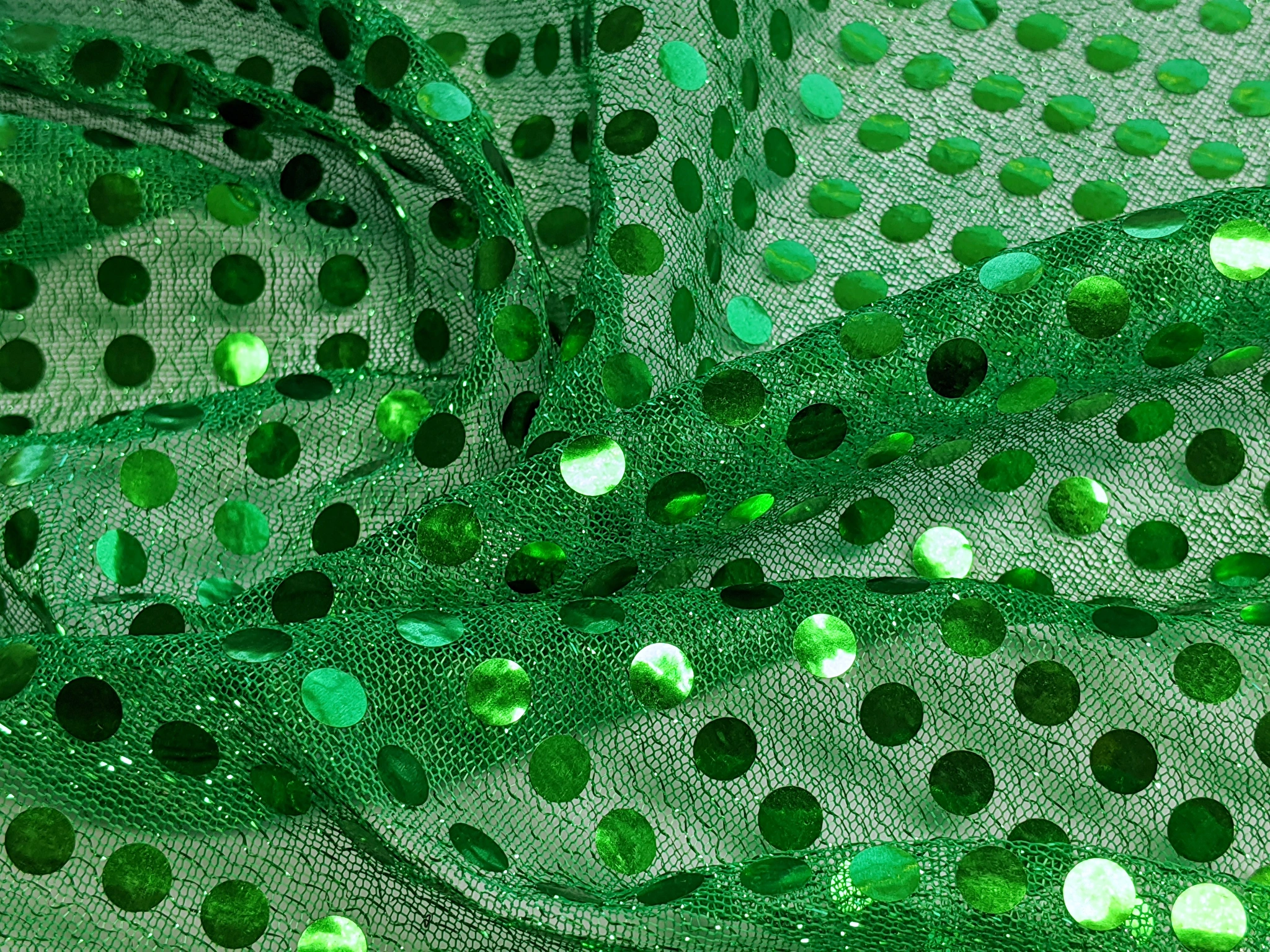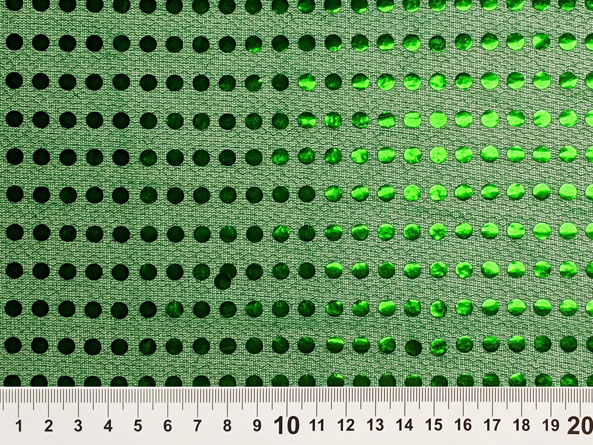 Круглые пайетки нанесены линией на сетчатую основу по всему полотну. Ткань не тянется, блестит и имеет просвет, поэтому для пошива платьев или юбок требуется дополнительная подкладочная ткань. Пайетки плотно прилегают к сетке и не осыпаются. Ткань не сминается и требует деликатного ухода. Применяется для пошива изделий танцевально-карнавального направления.