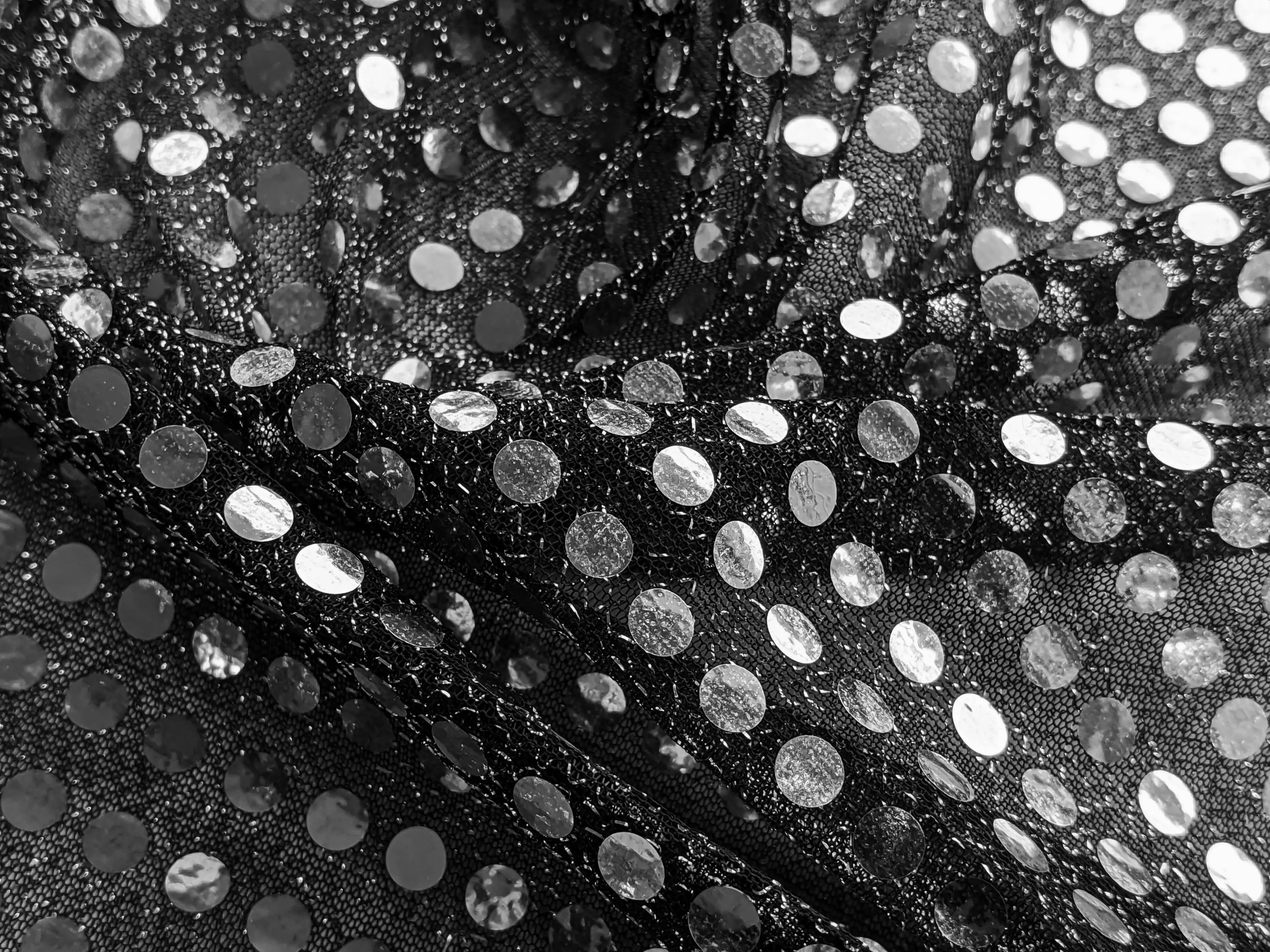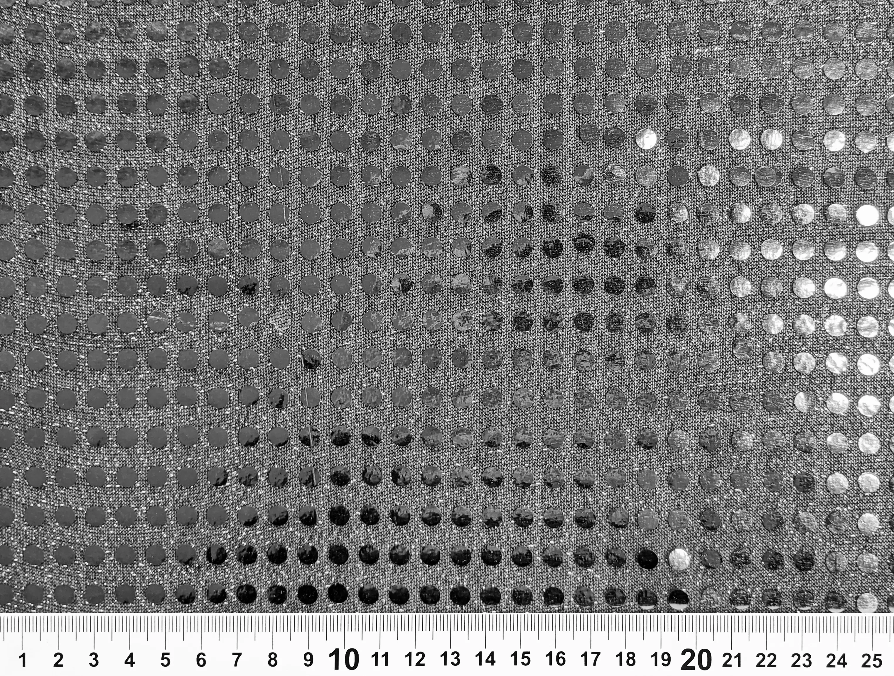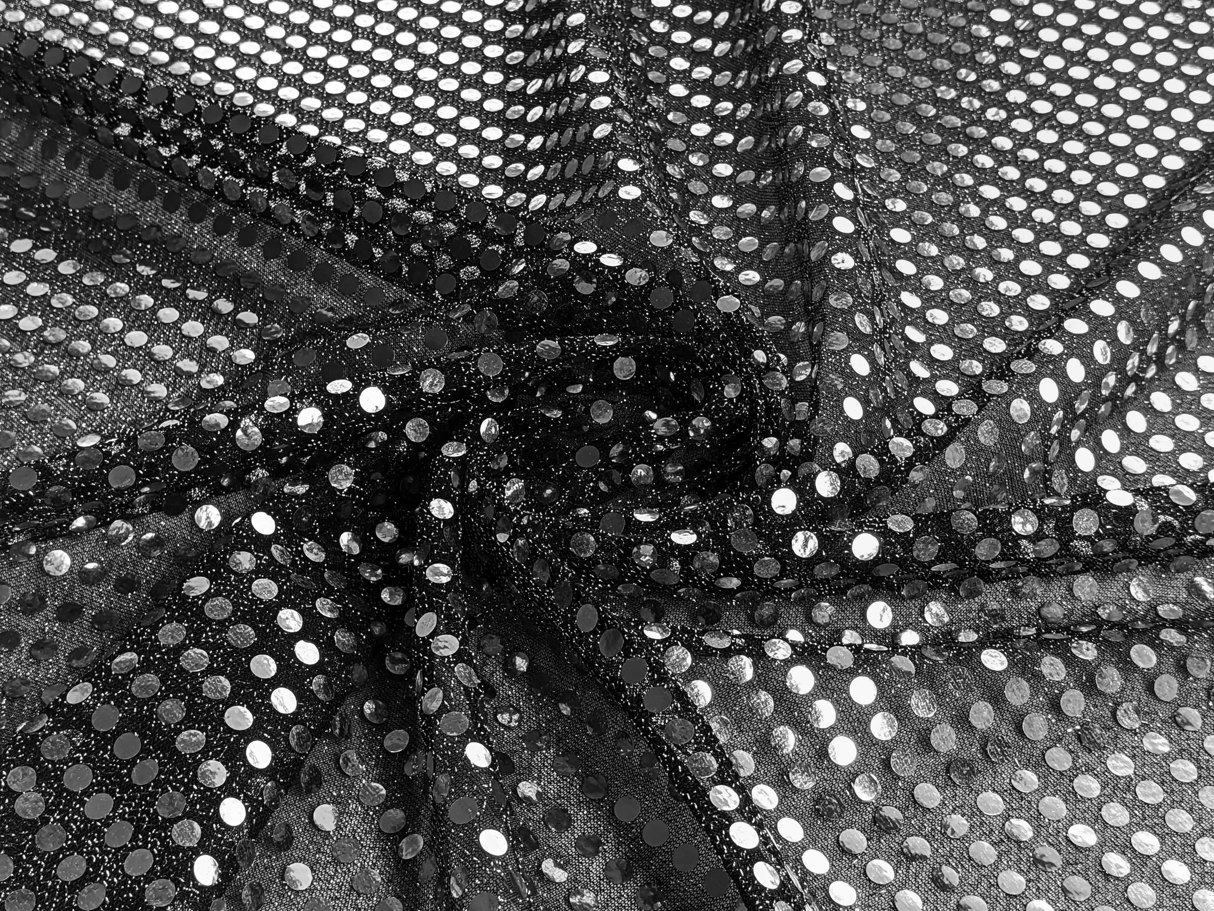Круглые пайетки нанесены линией на сетчатую основу по всему полотну. Ткань не тянется, блестит и имеет просвет, поэтому для пошива платьев или юбок требуется дополнительная подкладочная ткань. Пайетки плотно прилегают к сетке и не осыпаются. Ткань не сминается и требует деликатного ухода. Применяется для пошива изделий танцевально-карнавального направления.