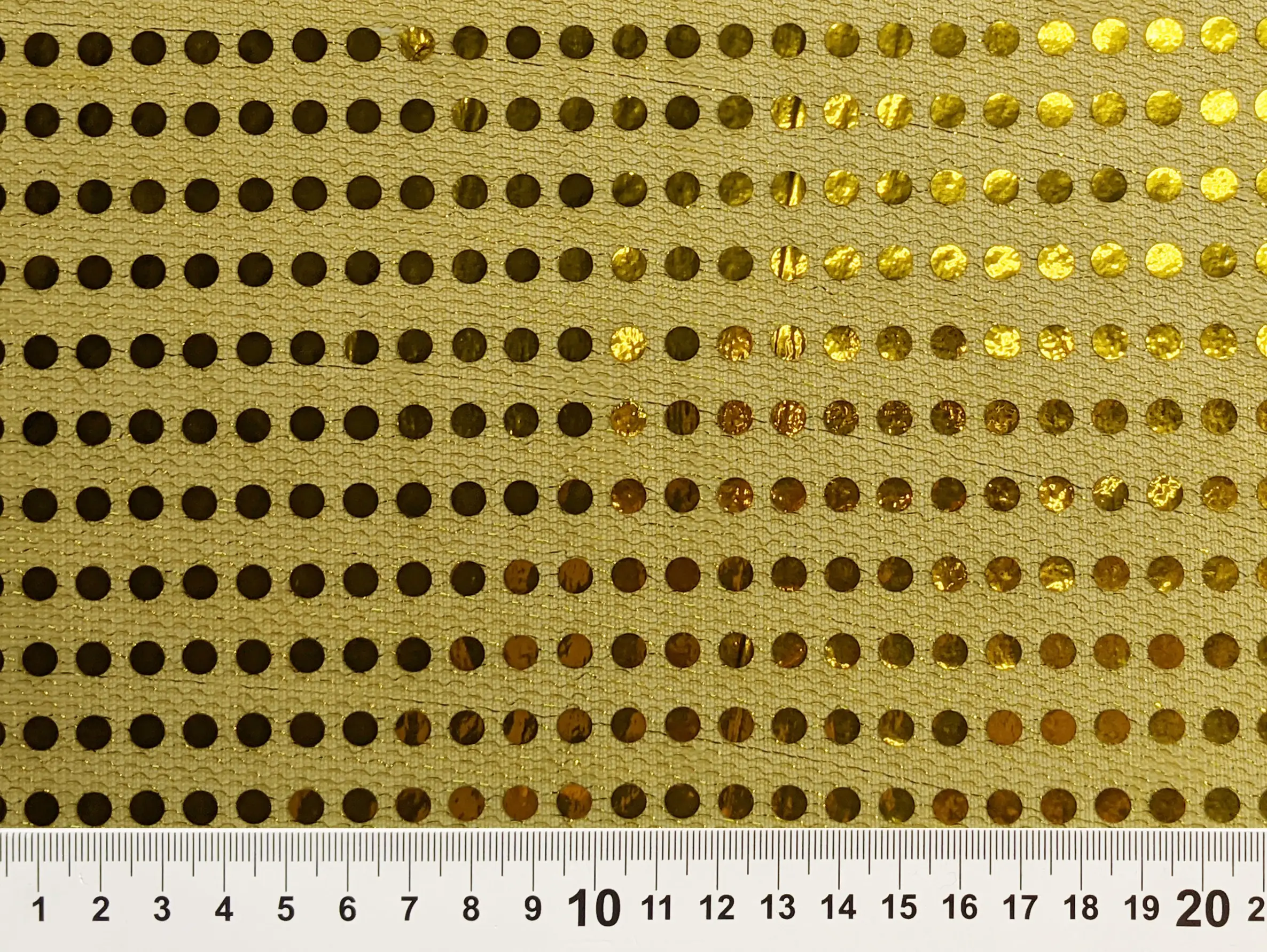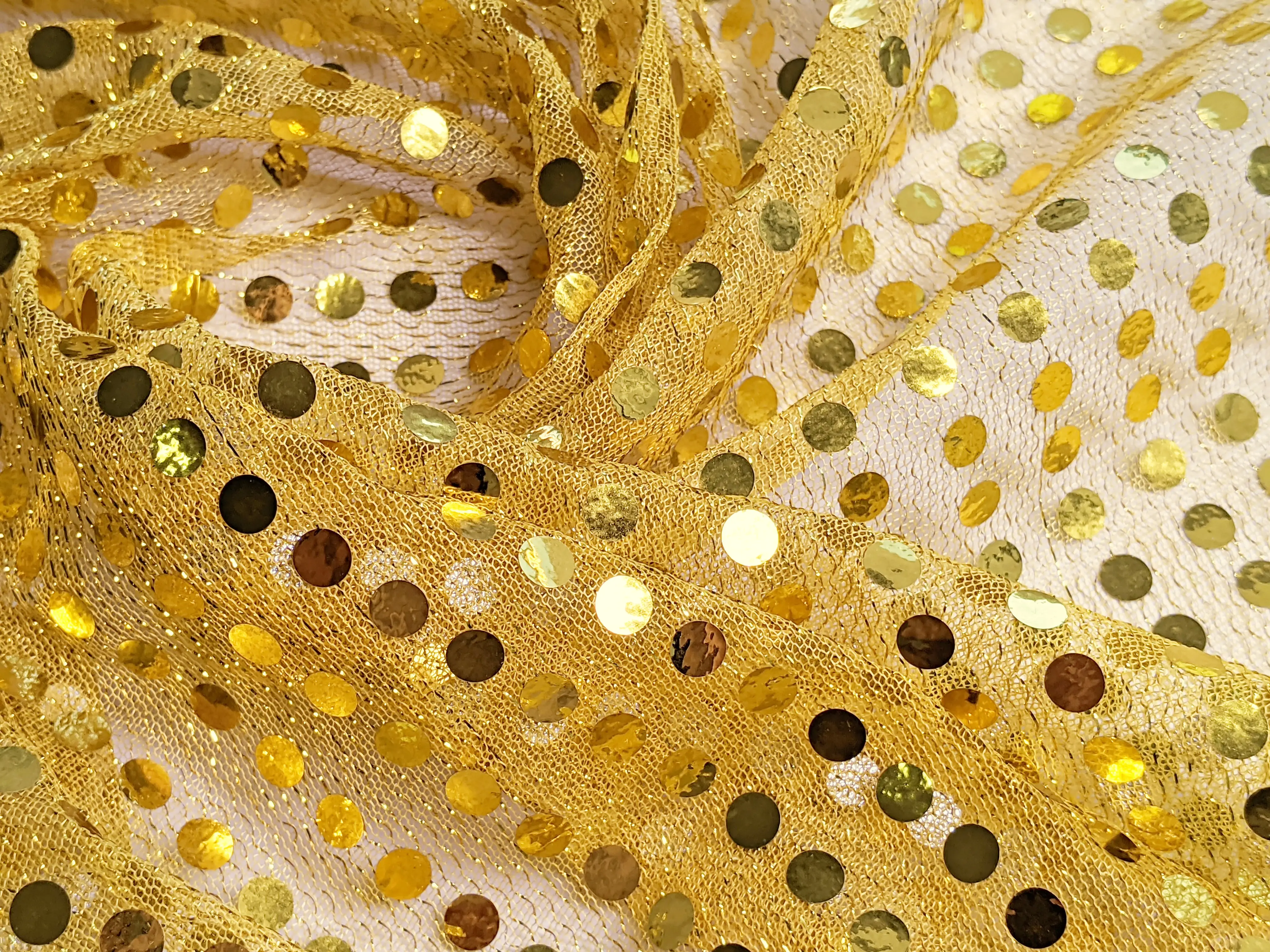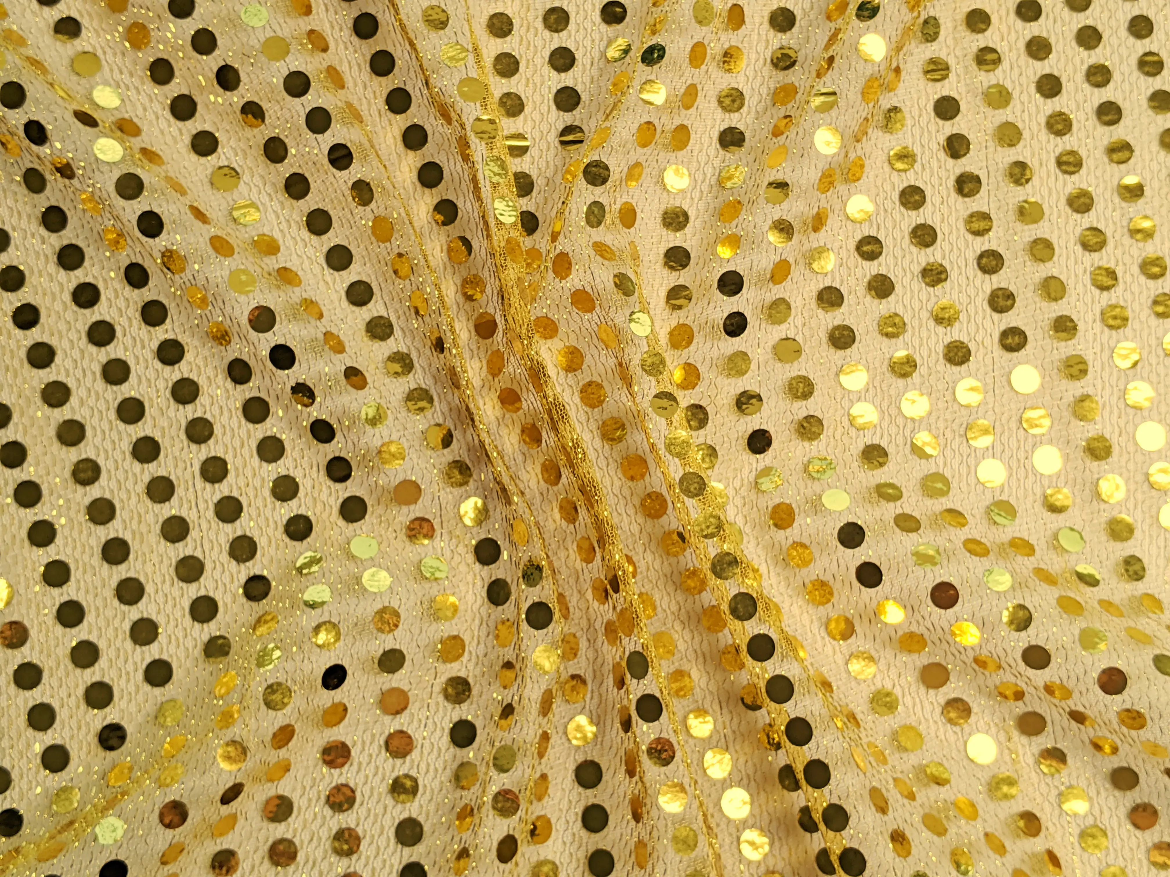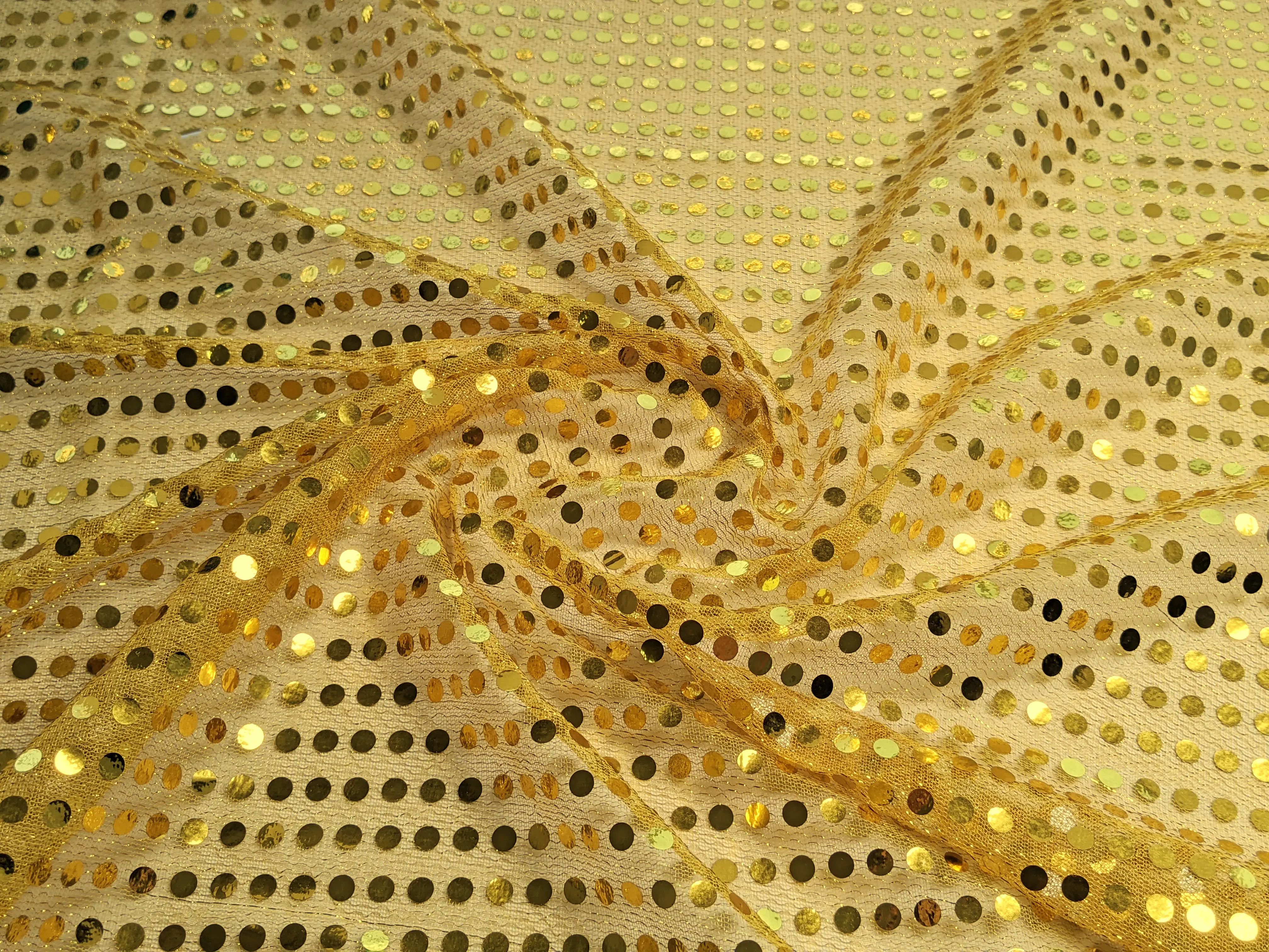 Круглые пайетки нанесены линией на сетчатую основу по всему полотну. Ткань не тянется, блестит и имеет просвет, поэтому для пошива платьев или юбок требуется дополнительная подкладочная ткань. Пайетки плотно прилегают к сетке и не осыпаются. Ткань не сминается и требует деликатного ухода. Применяется для пошива изделий танцевально-карнавального направления.