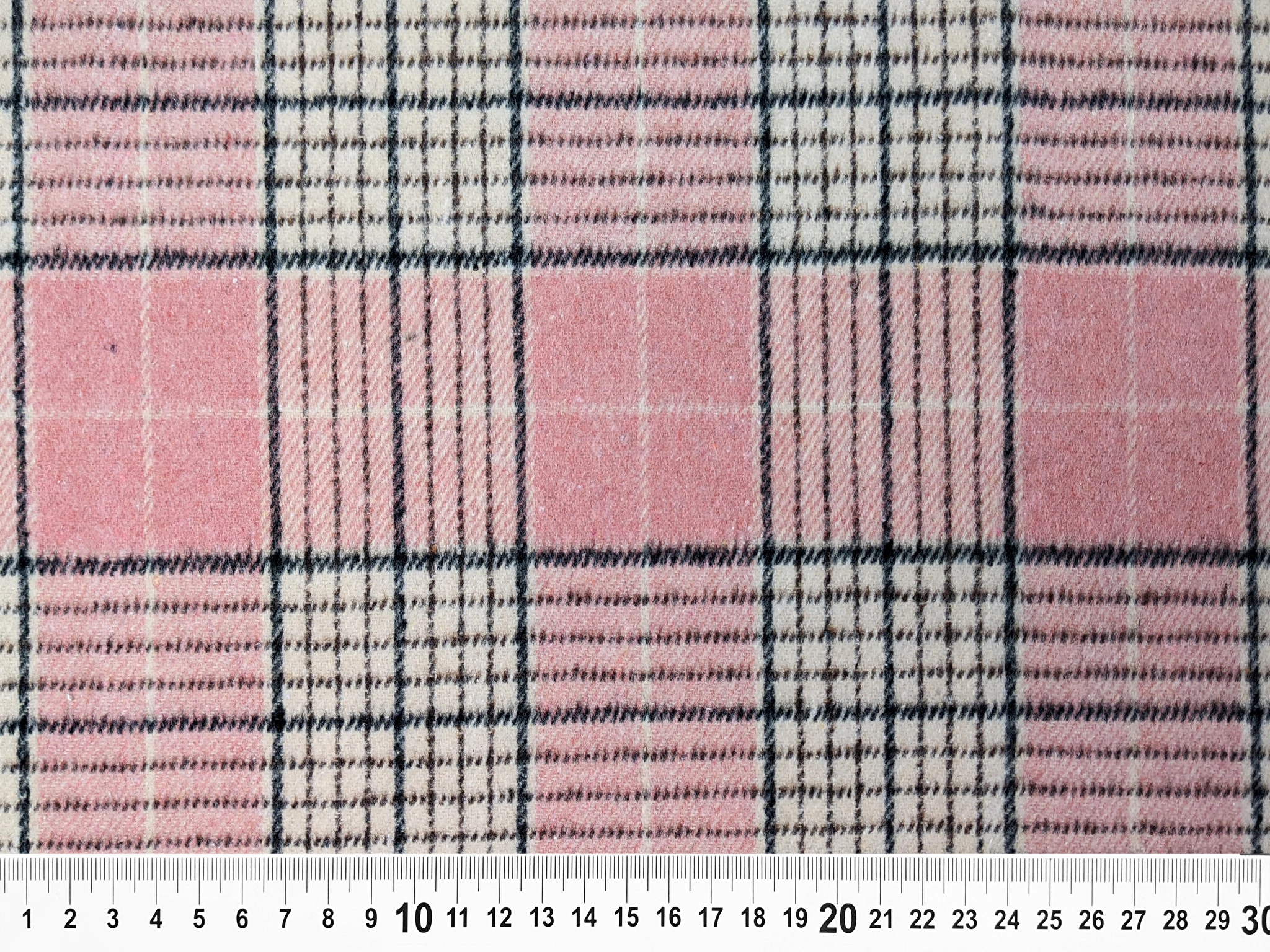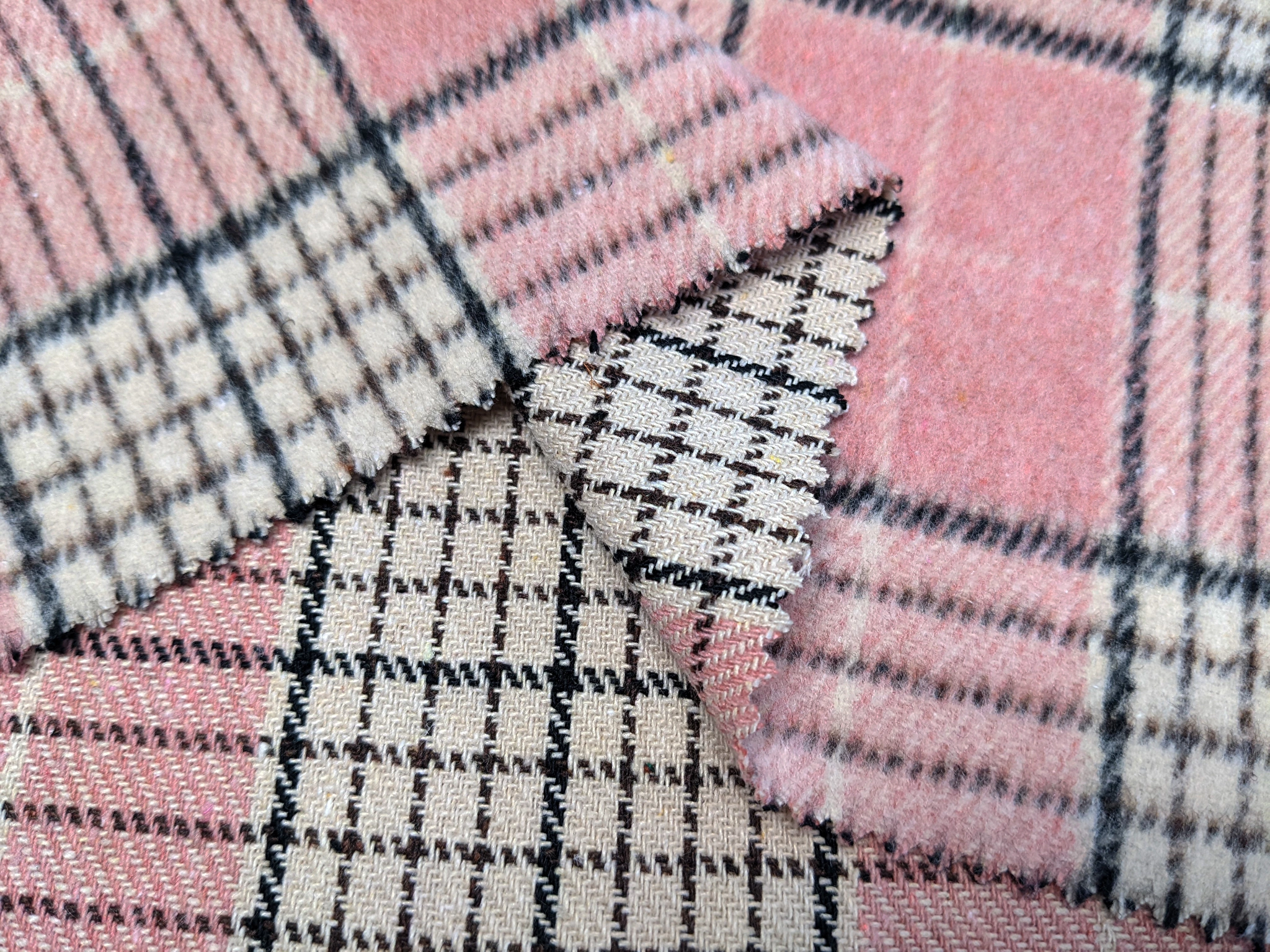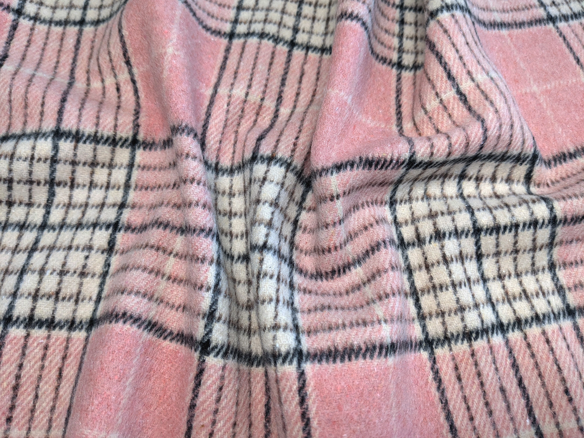 Клетка Шенон - плотное, костюмное полотно, поверхность которого покрыта мягким, нежным ворсом. Ткань комфортная, не колкая, мягкая и приятная на ощупь. Материал не тянется, хорошо драпируется, слегка сминается.