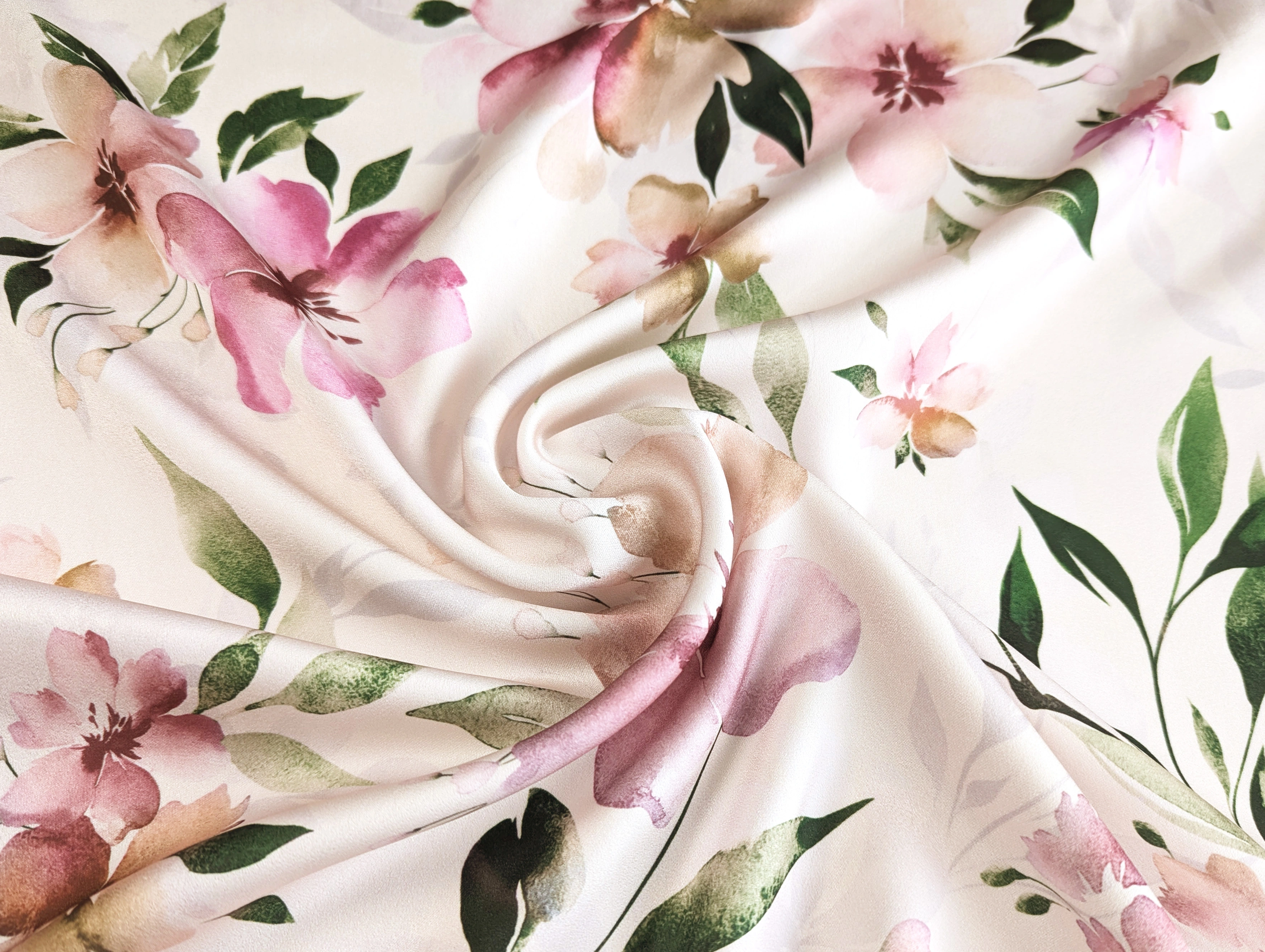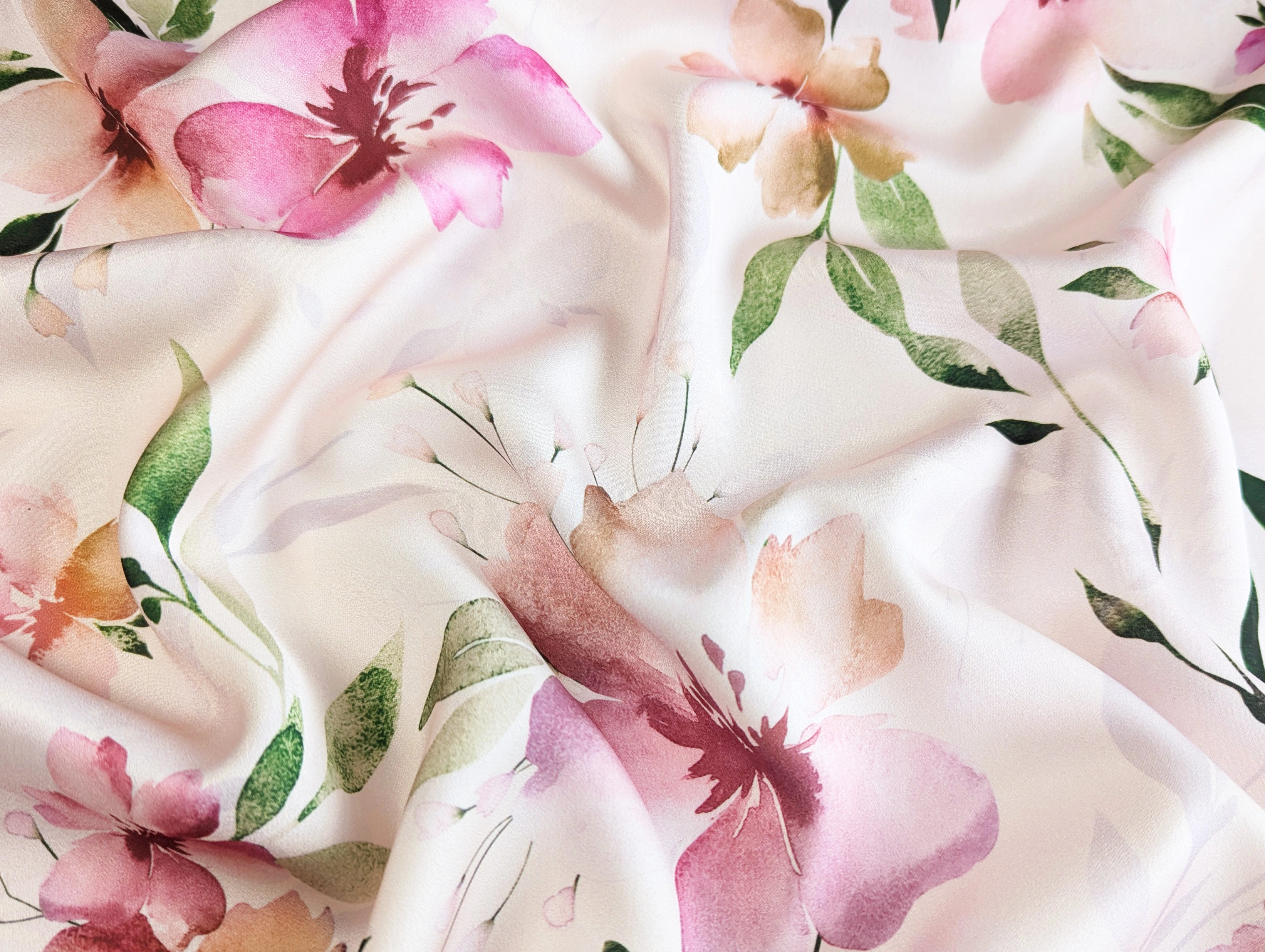 Ткань мягкая на ощупь, не прозрачная на теле (кроме белый и молочных цветов), не сминается, присутствует легкая эластичность по ширине полотна. Материал скользящий, шелковистый, легко драпируется образуя легкие складки.