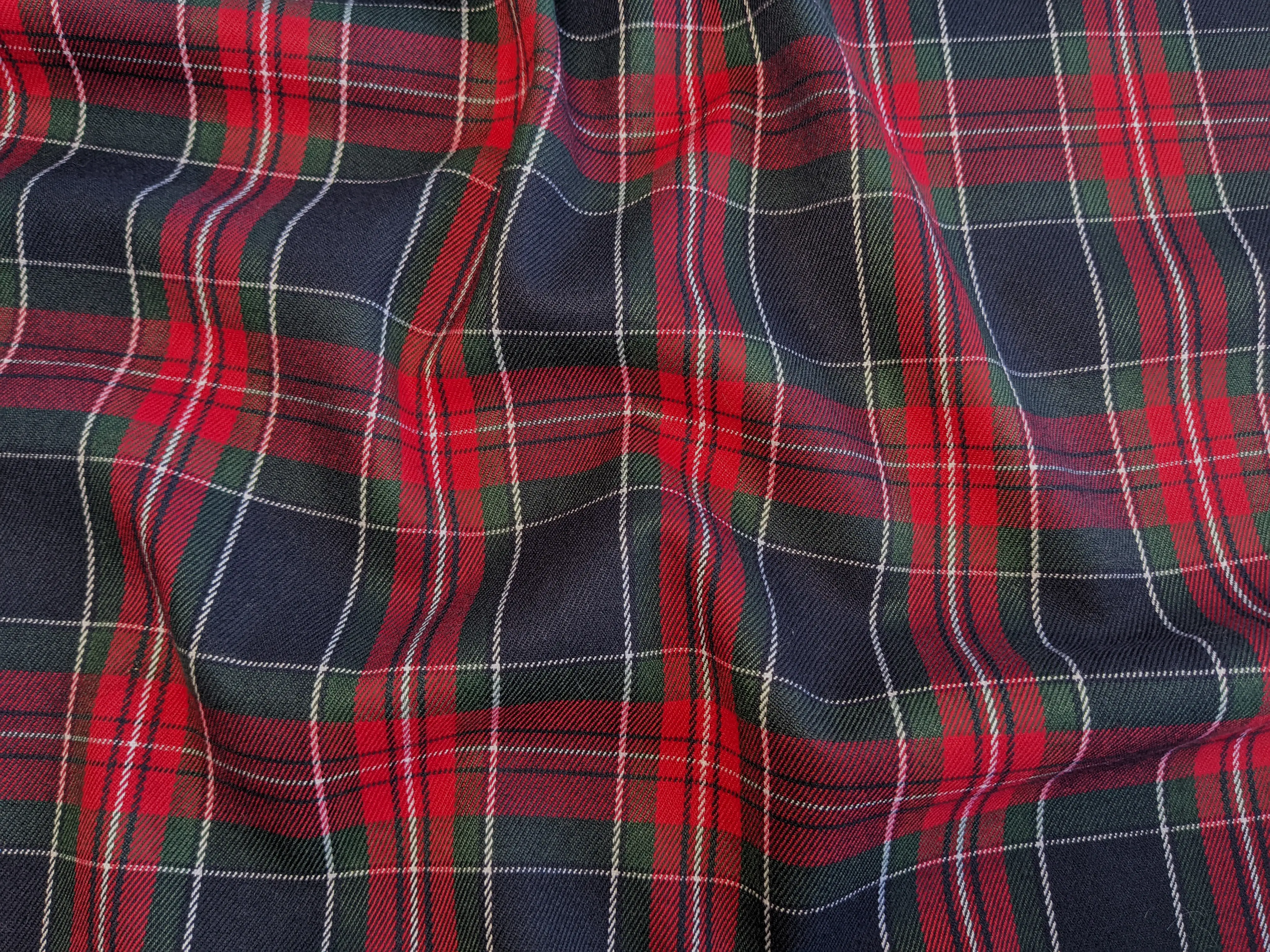 Клетка Шотландия - костюмная ткань средней плотности. На ощупь мягкая, имеет слегка шершавую фактуру и мелкий диагональный рубчик. В составе материала присутствуют натуральные и синтетические волокна. Костюмный тиар имеет легкую эластичность по ширине полотна, не сминается, хорошо драпируется.