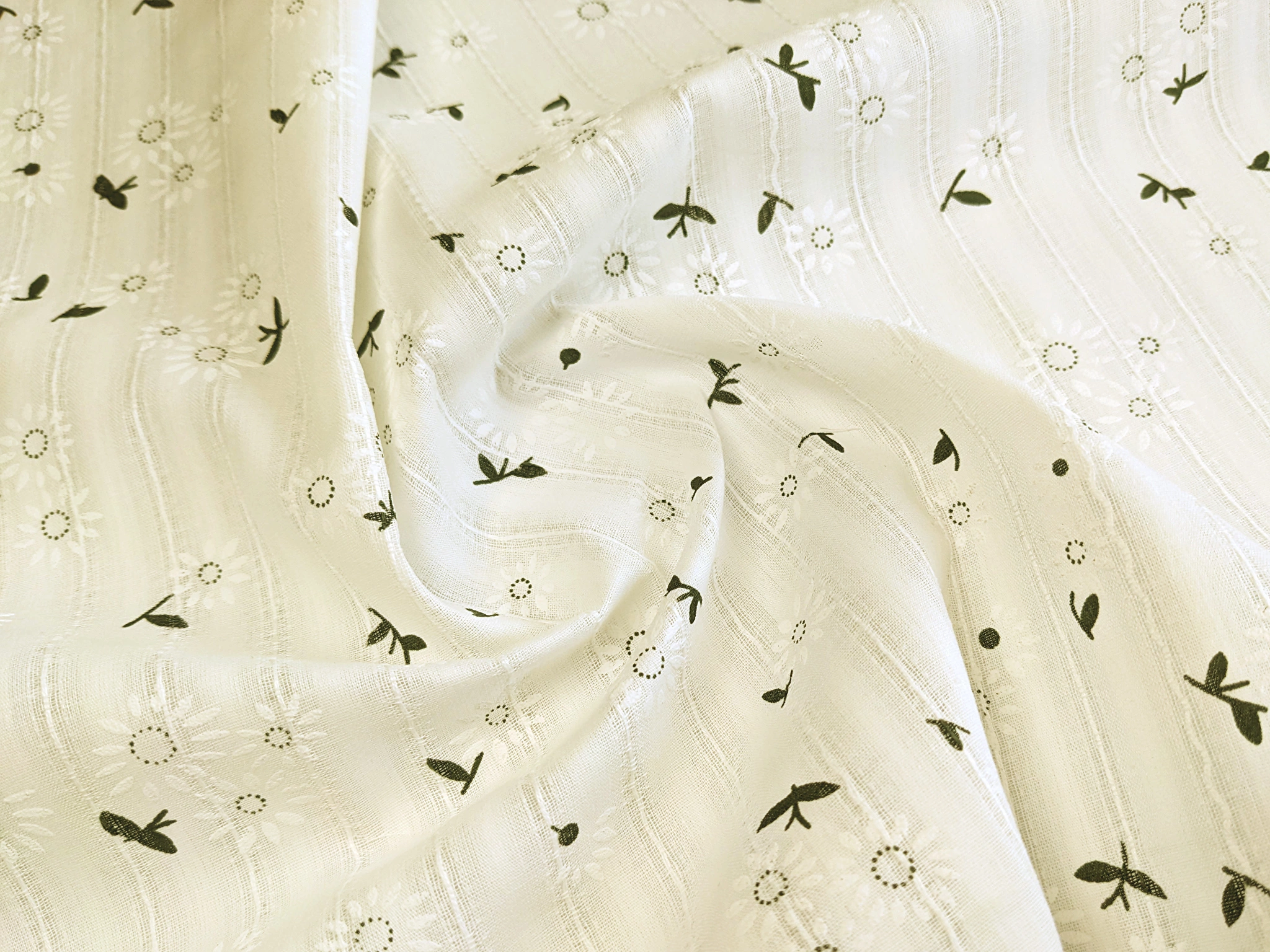 Коттон мережка - тонкий, легкий, натуральный хлопковый материал с декоративным узором мережка и цветочным принтом по всему полотну ткани. Коттон мягкий, тактильно приятный, без стрейча, сминается за счет хлопка в составе, хорошо драпируется. Ткань отлично пропускает воздух, позволяя коже дышать, хорошо впитывает влагу.