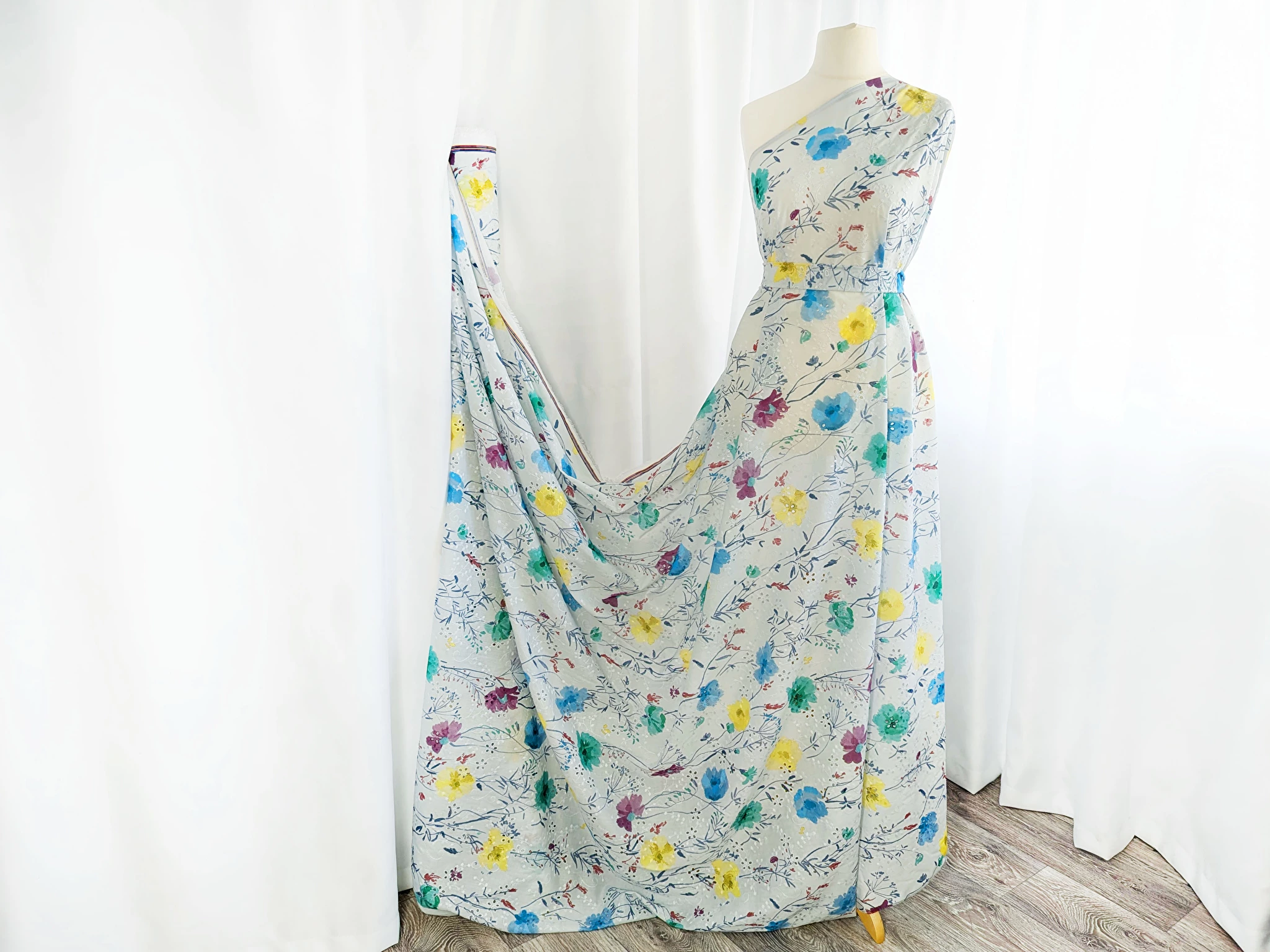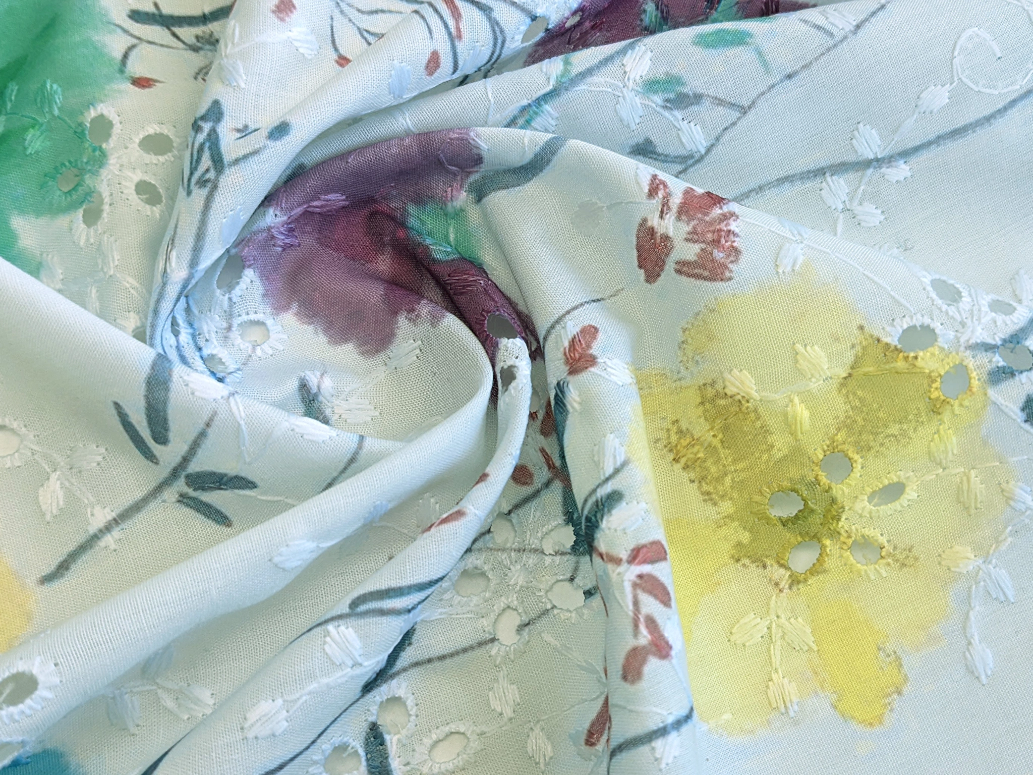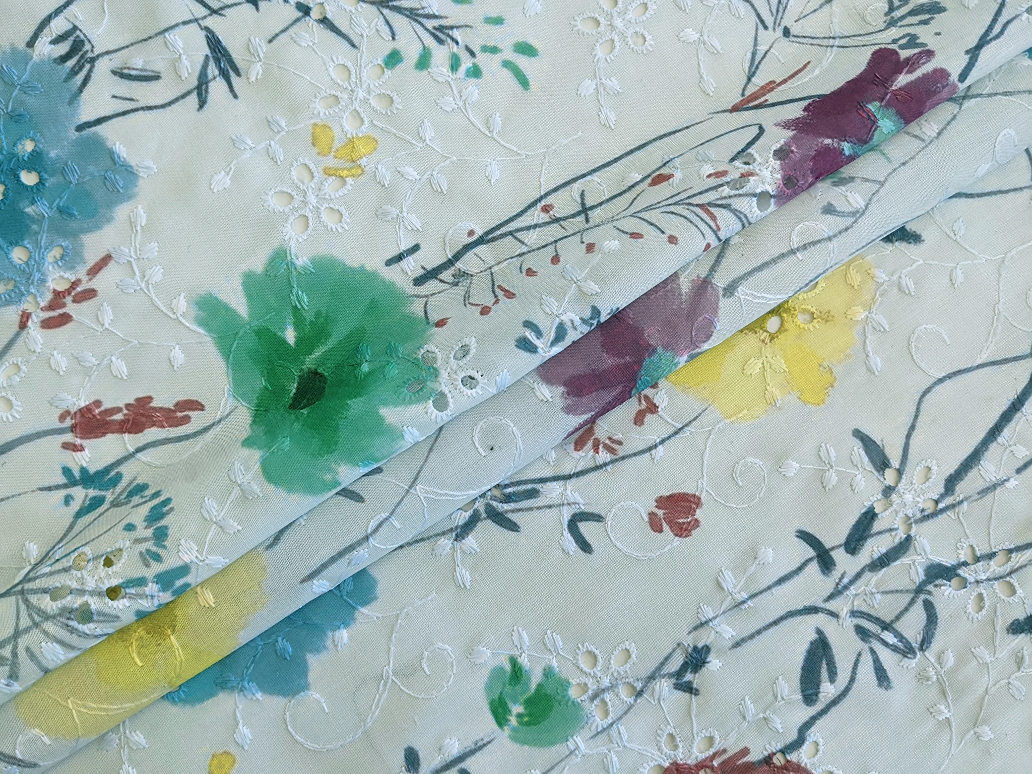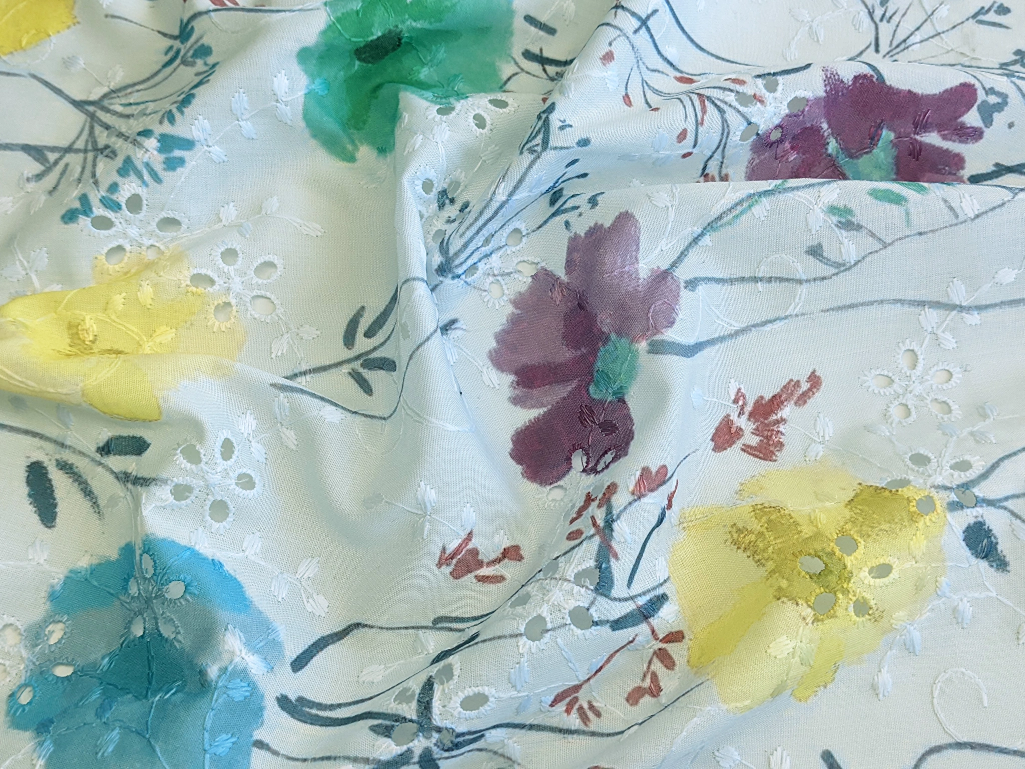 Коттон вышивка - это легкий и тонкий материал, поверхность которого расшита цветочными мотивами и украшена фигурным прорезным рисунком в виде дырочек. Ткань без эластана, несминаемая, при драпировке принимает воздушную устойчивую форму. За счет сквозной перфорации материал просвечивает, поэтому для некоторых изделий будет необходима подкладка.