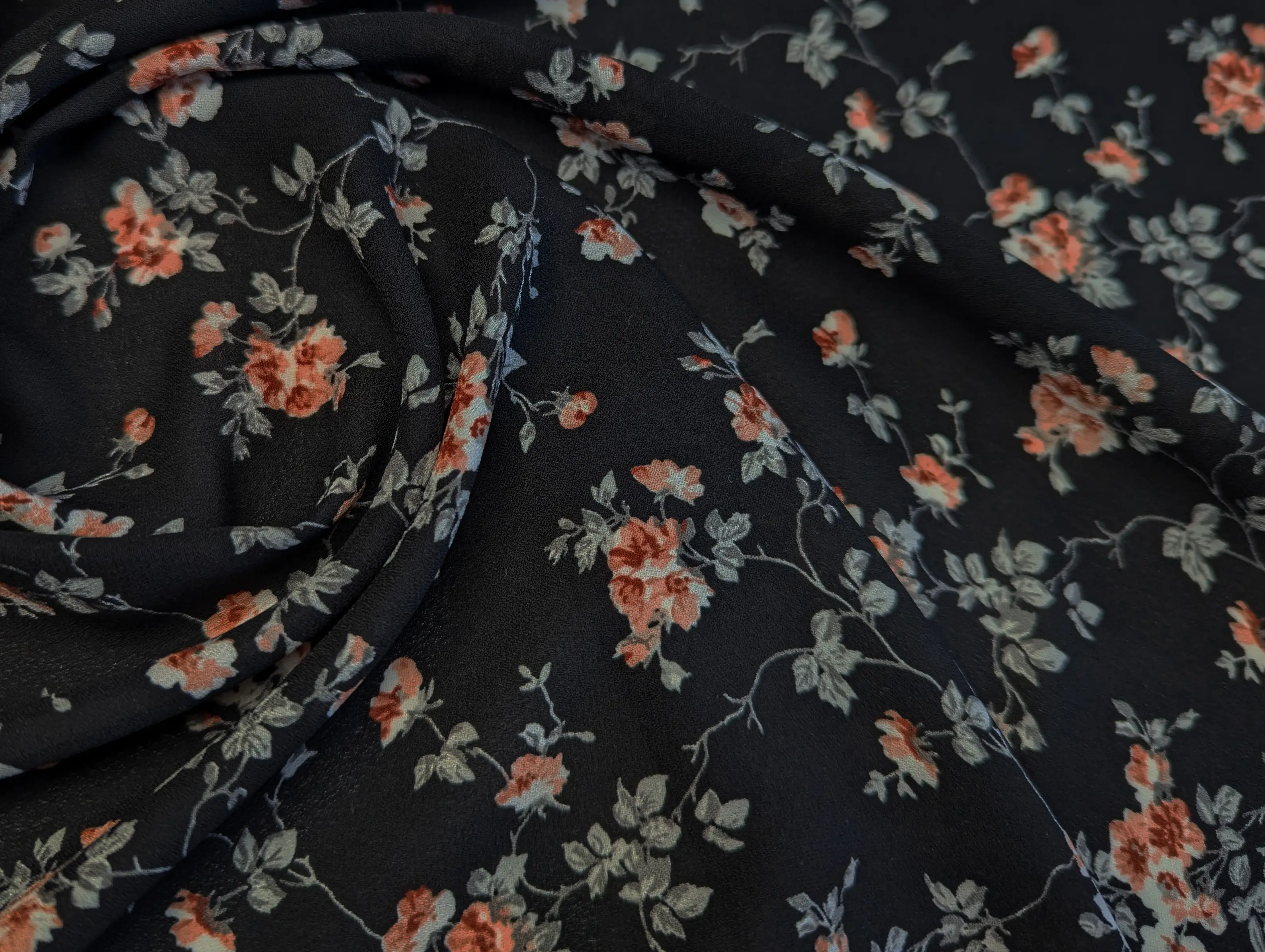 Креп шифон цветочки на веточке, черный (отрез 1,5 м)