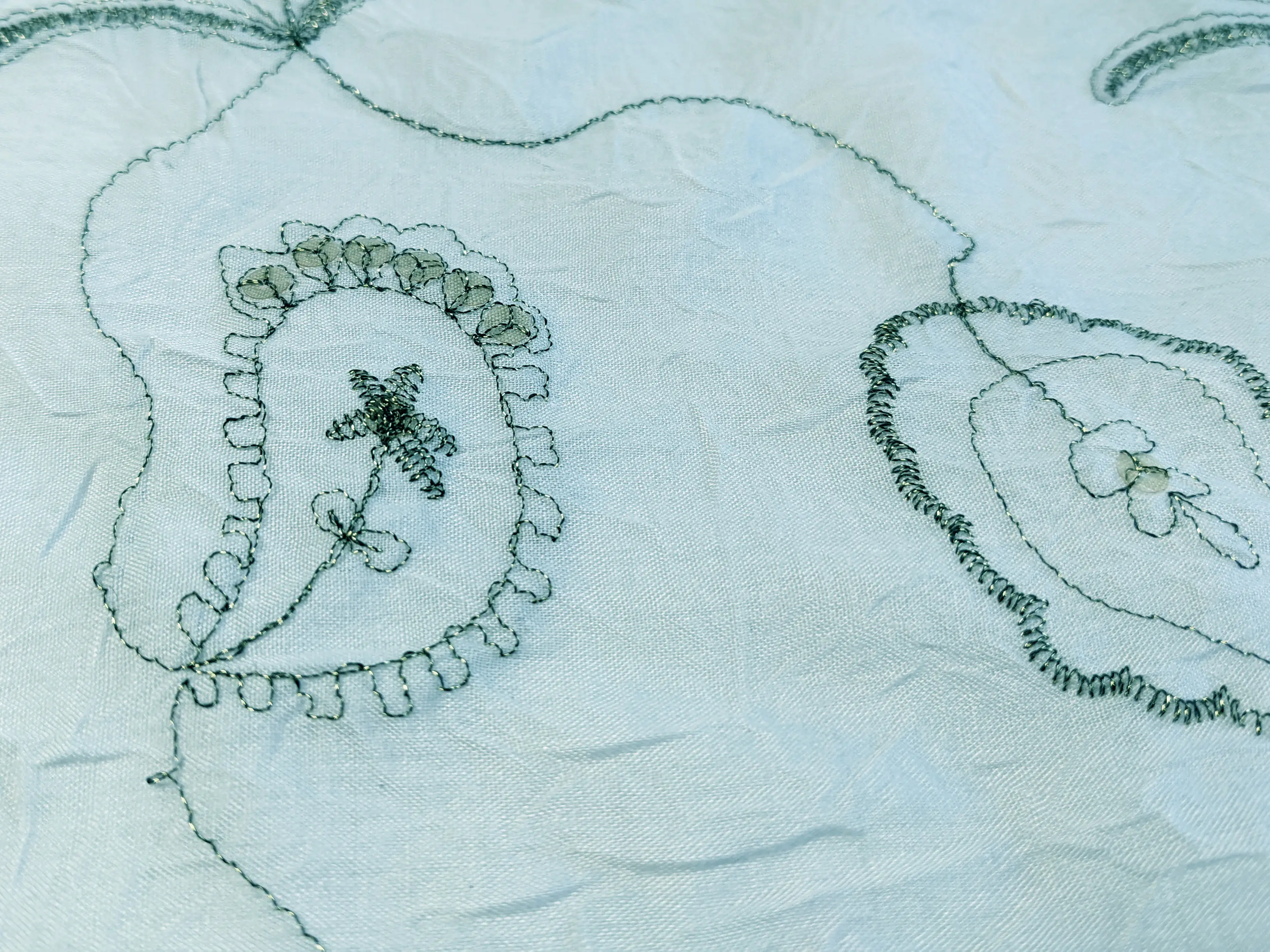 Крэш коттон - полотно, поверхность которого покрыта хаотичными заломами различной формы. Рекомендованная лицевая сторона расшита люрексовой нитью и пайетками в виде флористической абстракции. Ткань легкая, не эластичная, драпируется, не сминается, обладает легкой прозрачностью силуэта. Люрексовая нить и пайетка придают ткани легкое мерцание.