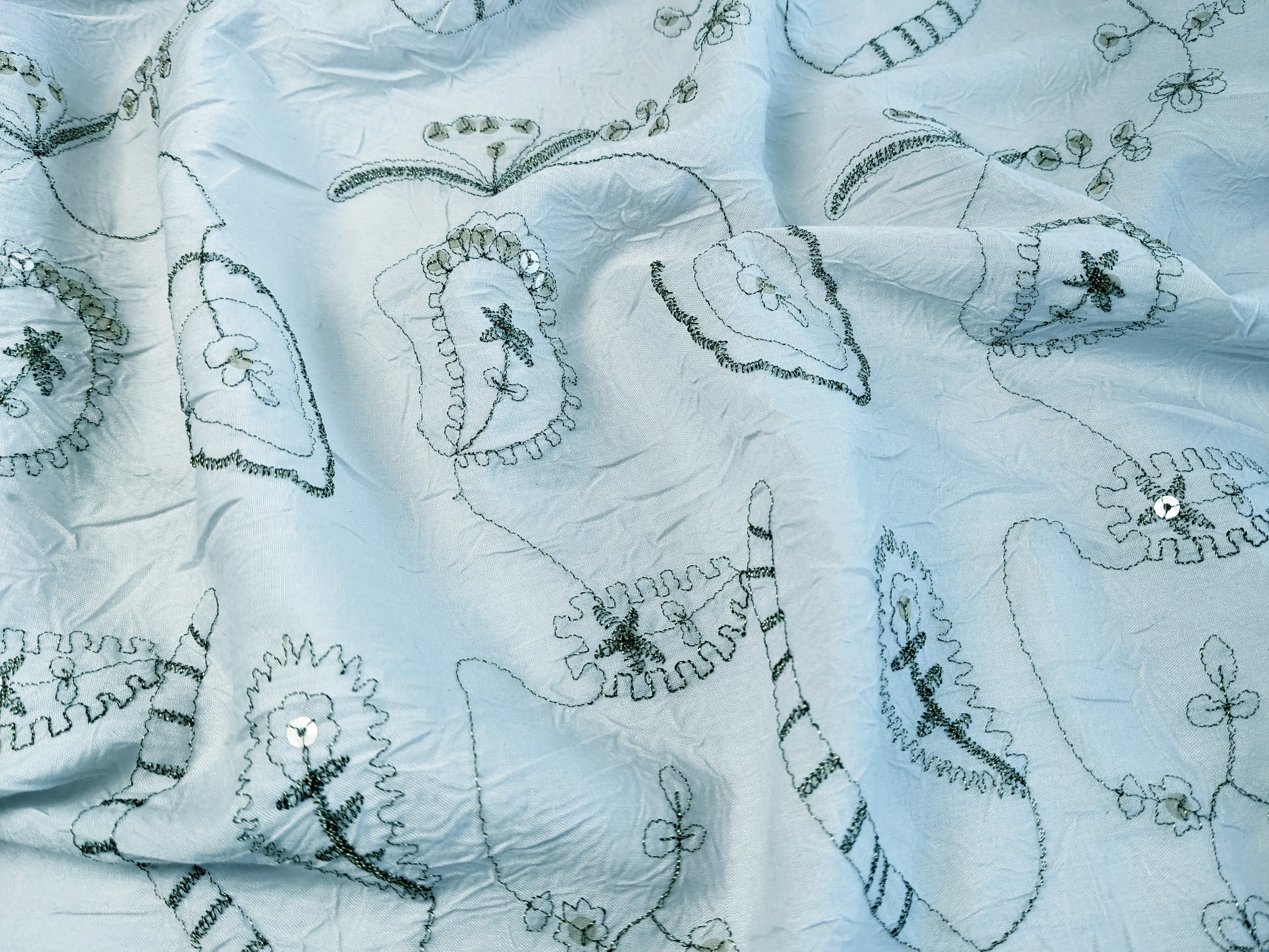Крэш коттон пайетки вышивка веточки, голубой (отрез 2 м)