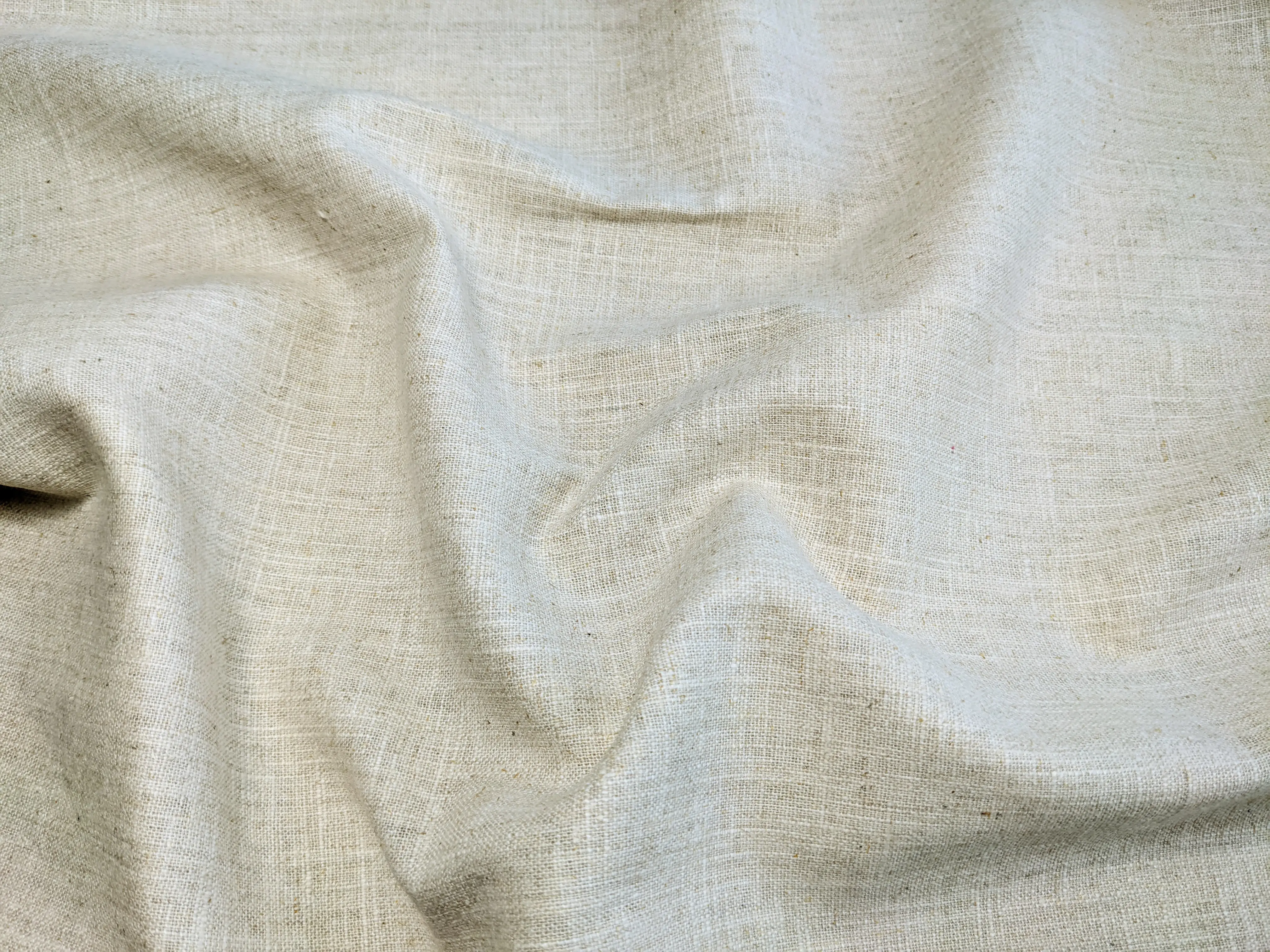 Лен Рами - материал натурального происхождения. Фактура имеет естественные уплотнения в виде штрихов из более уплотненной нити по всему полотну. Ткань средней плотности, гигроскопичная, воздухопроницаемая. Слегка эластичная по ширине полотна, непрозрачная на теле. За счет натурального состава сминается, при драпировке хорошо ложится в складки, сохраняет форму.