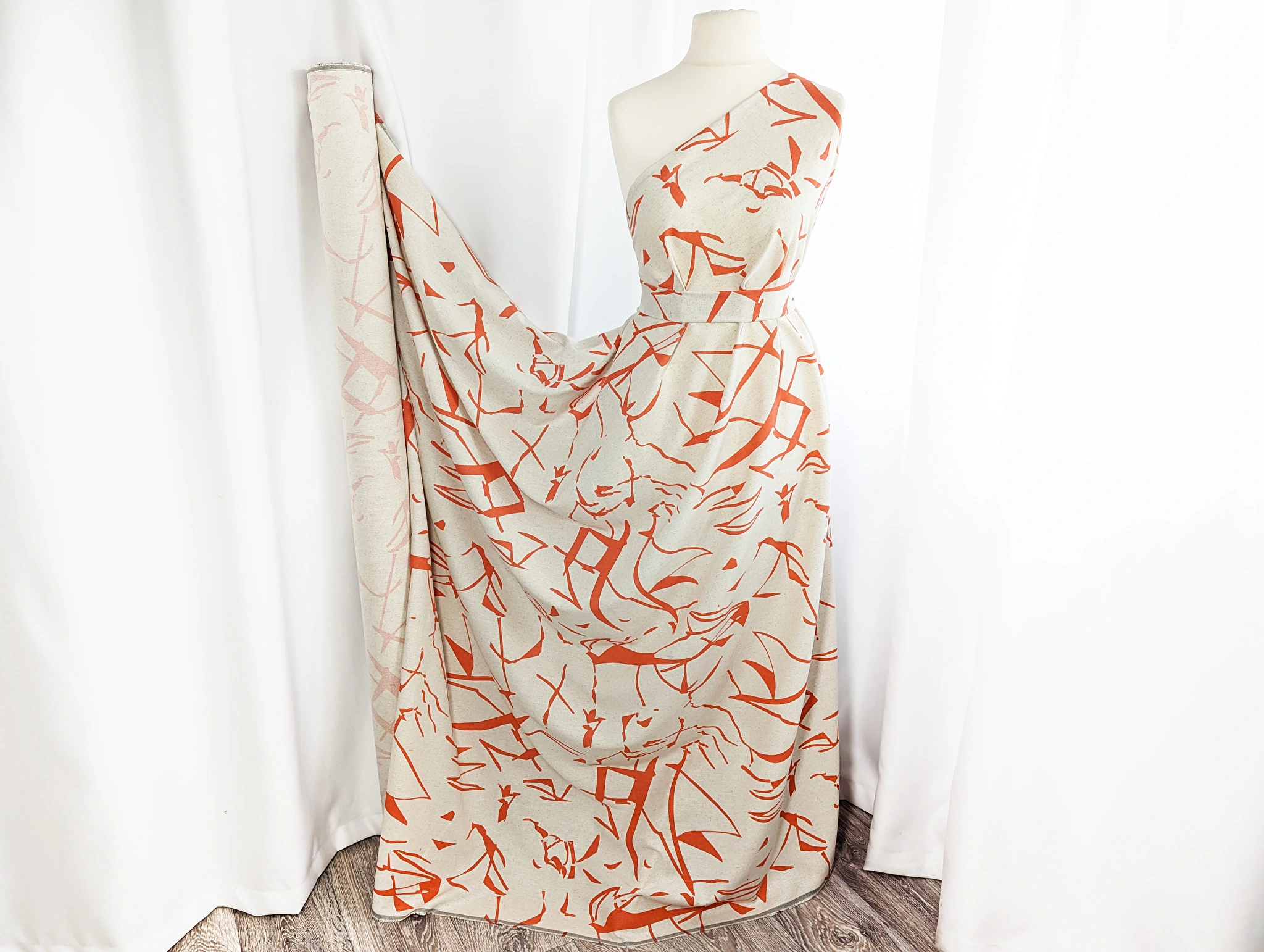 Лен с вискозой геометрическая абстракция, оранжевый на бежевом