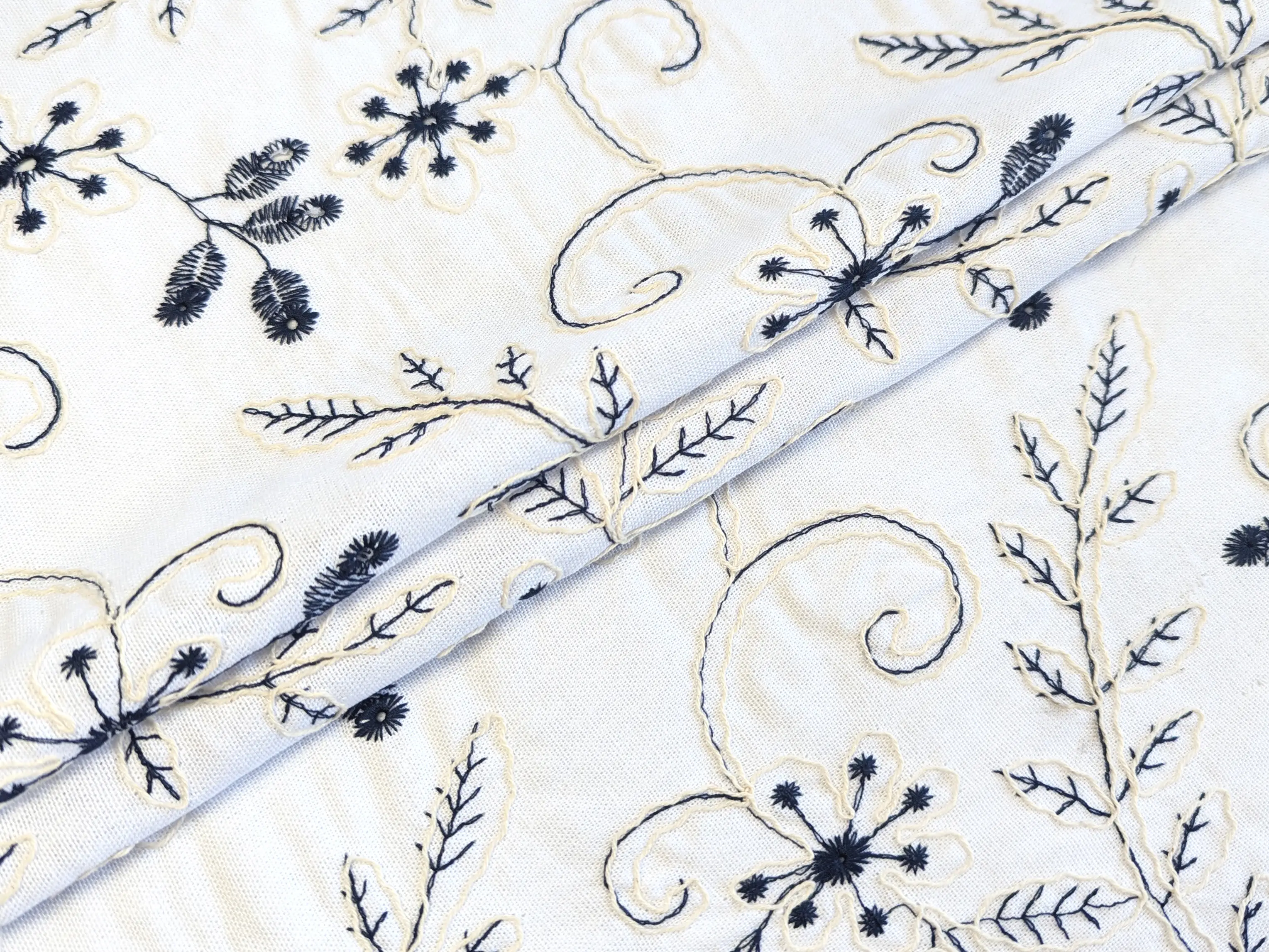 Особый шарм ткани придаёт необычная цветочная вышивка, которая украшает её поверхность. Декоративный цветочный узор делает изделия более выразительными и стильными, а также подчёркивает этнические мотивы. Ткань часто используют для создания одежды в этно-стиле и оригинальных летних образов.