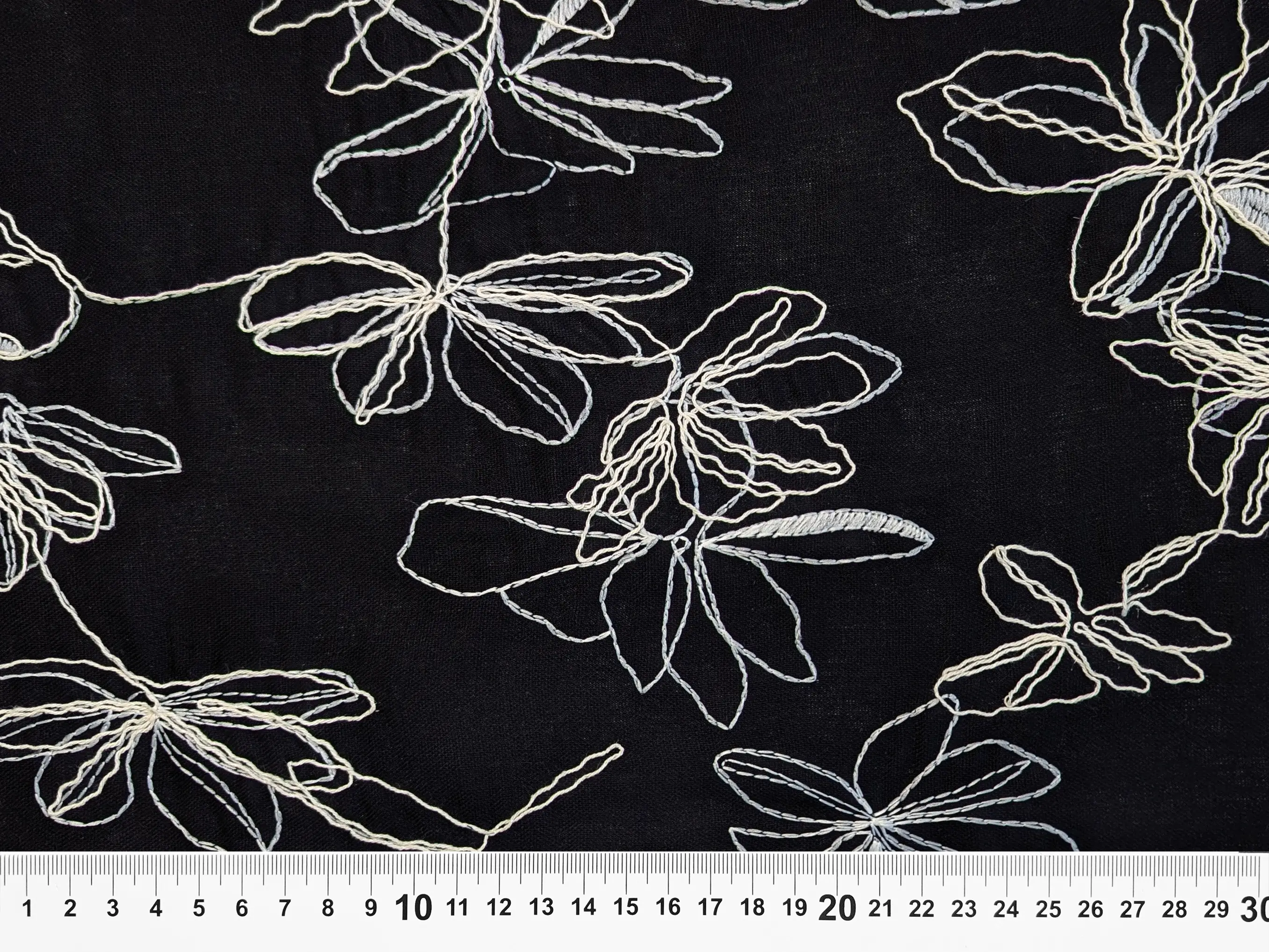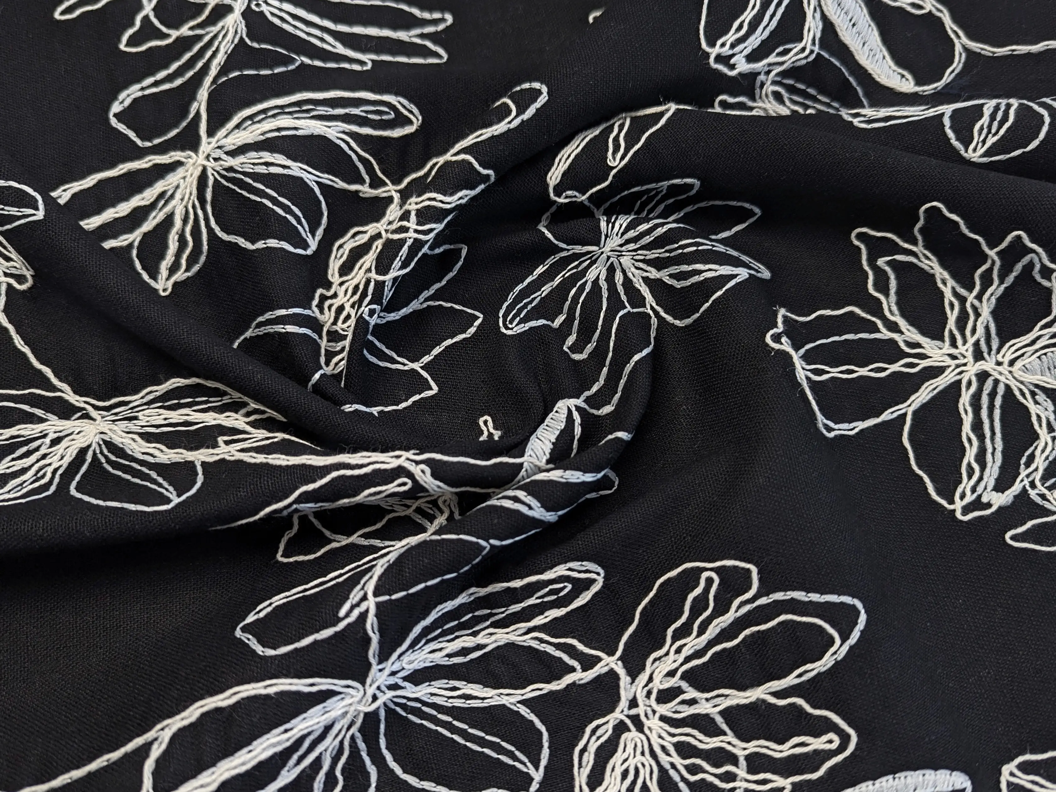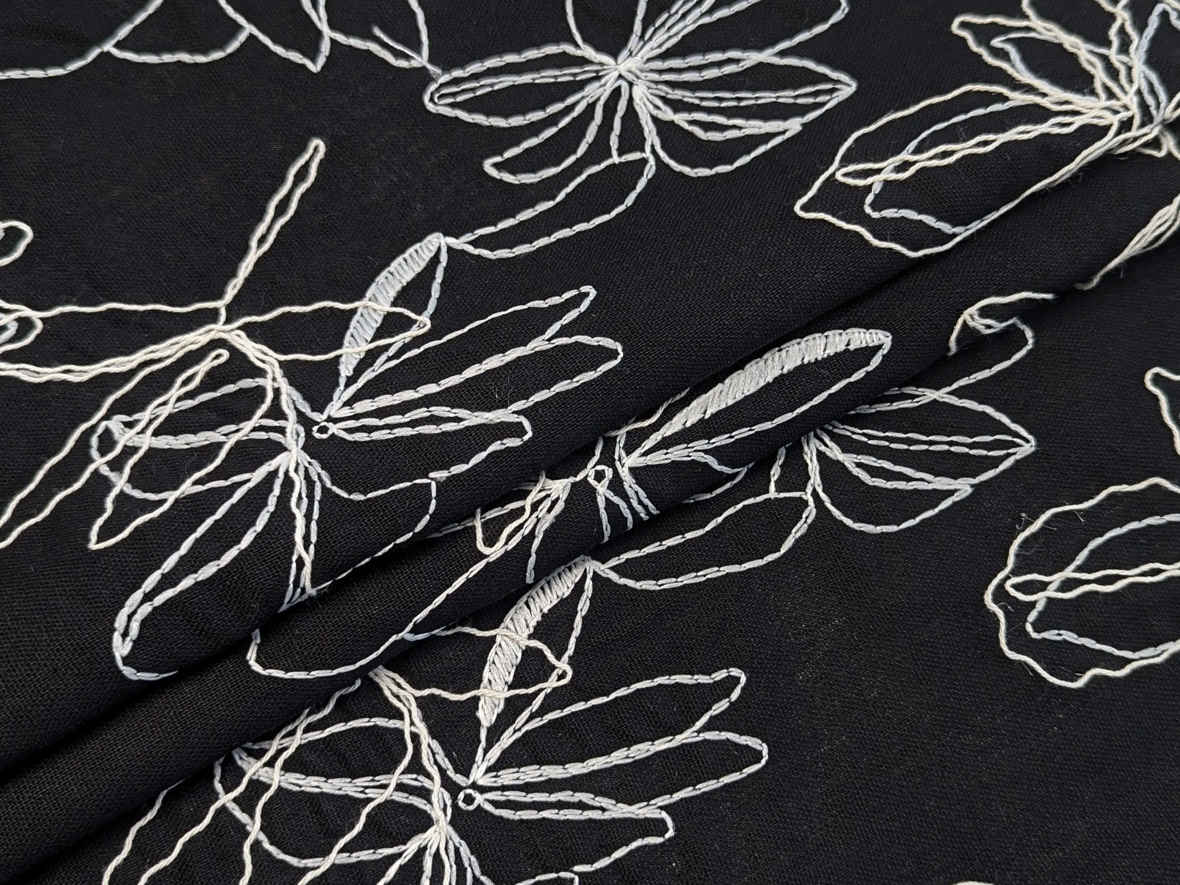 Особый шарм ткани придаёт необычная цветочная вышивка, которая украшает её поверхность. Декоративный цветочный узор делает изделия более выразительными и стильными, а также подчёркивает этнические мотивы. Ткань часто используют для создания одежды в этно-стиле и оригинальных летних образов.