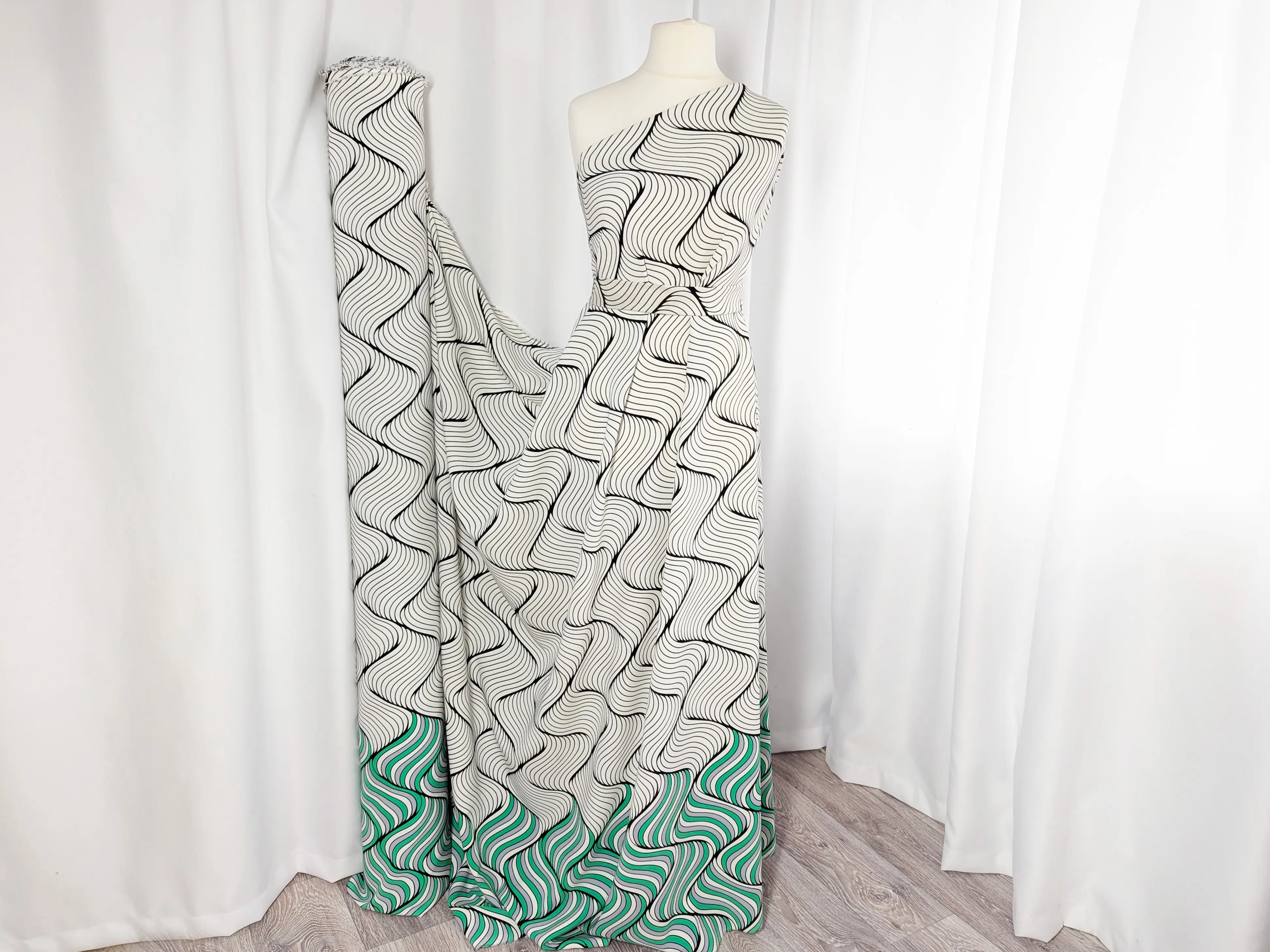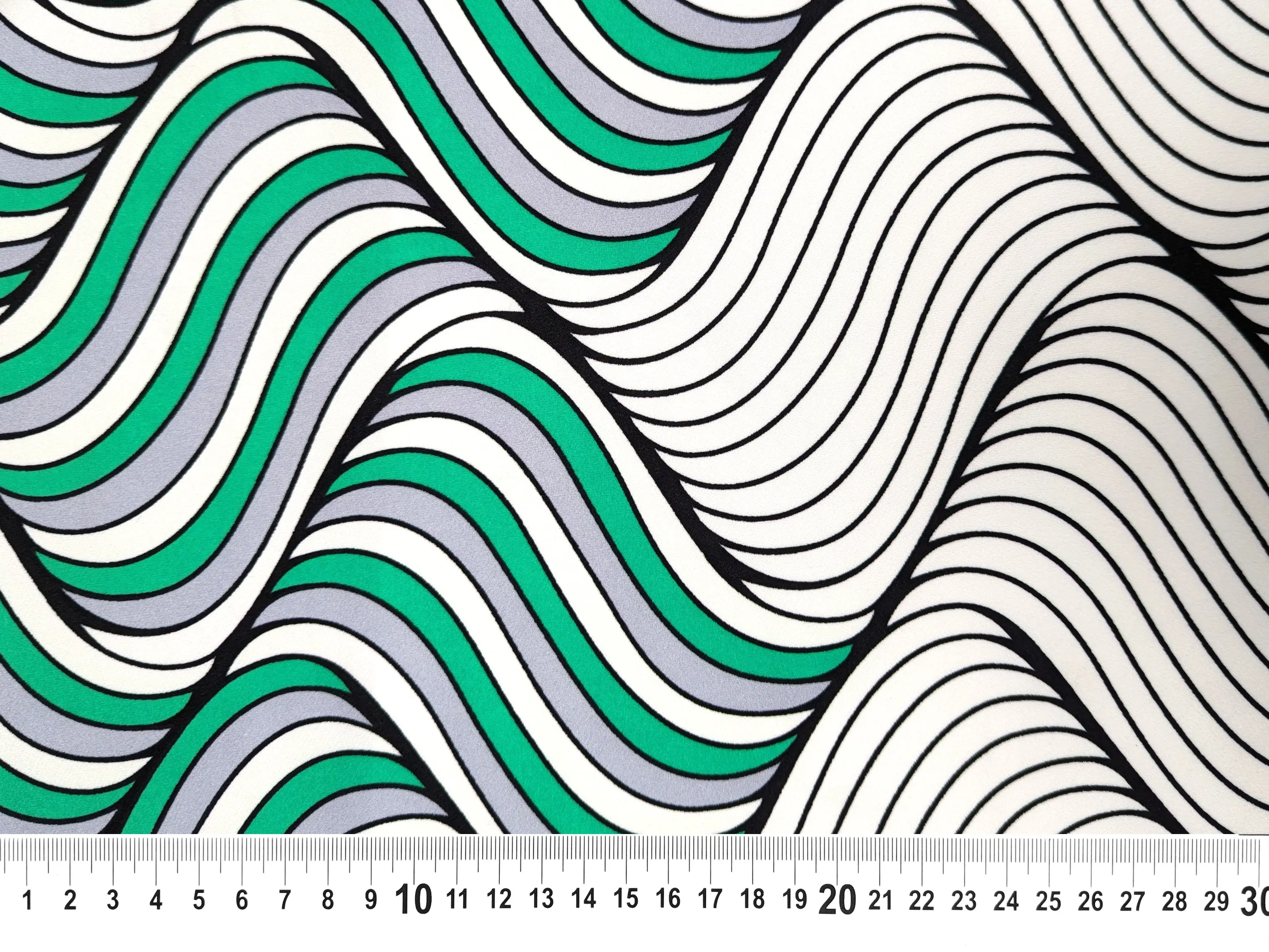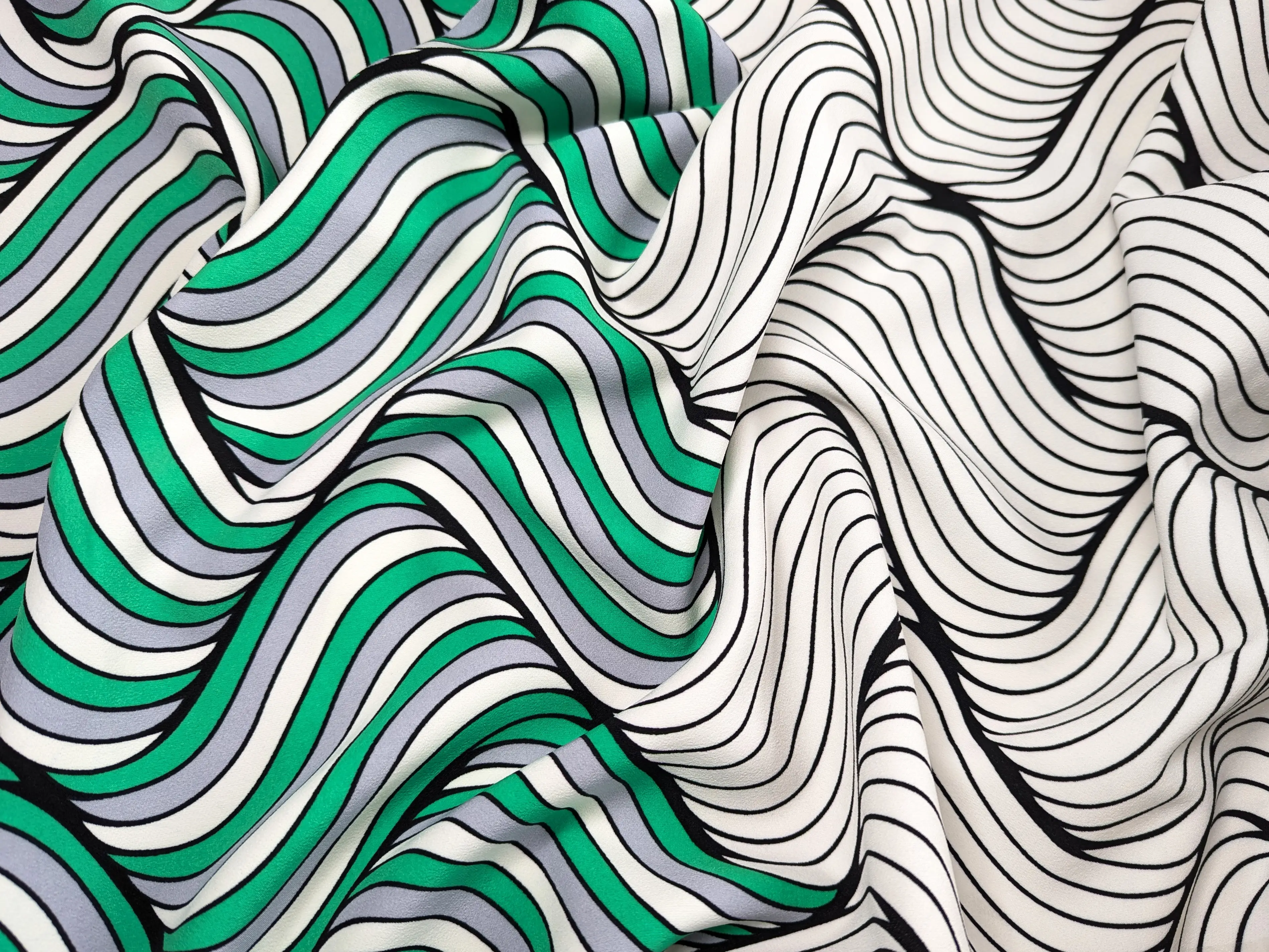 Ткань средней плотности, стрейчевая, не мнется, отлично сидит по фигуре, приятная на ощупь. По всему полотну нанесен яркий принт рапортом. Имеет диагональное плетение нитей по лицевой стороне. Применяется для пошива костюмов и платьев.