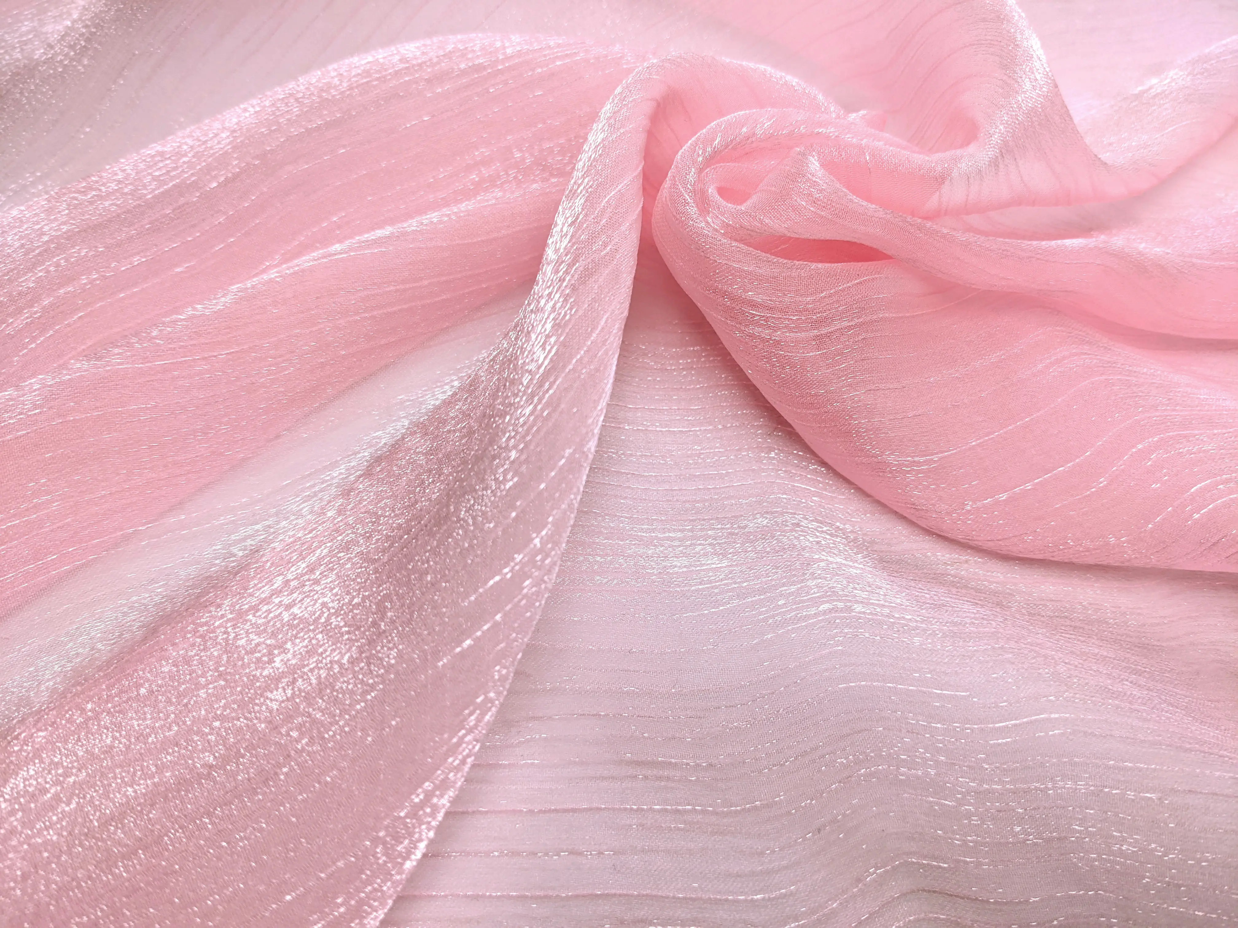 Органза крэш - тонкий, прозрачный, легкий материал с переливчатой поверхностью и эффектом крэш. Поверхность фактурная, с полосатой структурой и благородным легким блеском. Органза неэластичная, несминаемая, тактильно очень комфортная и приятная.