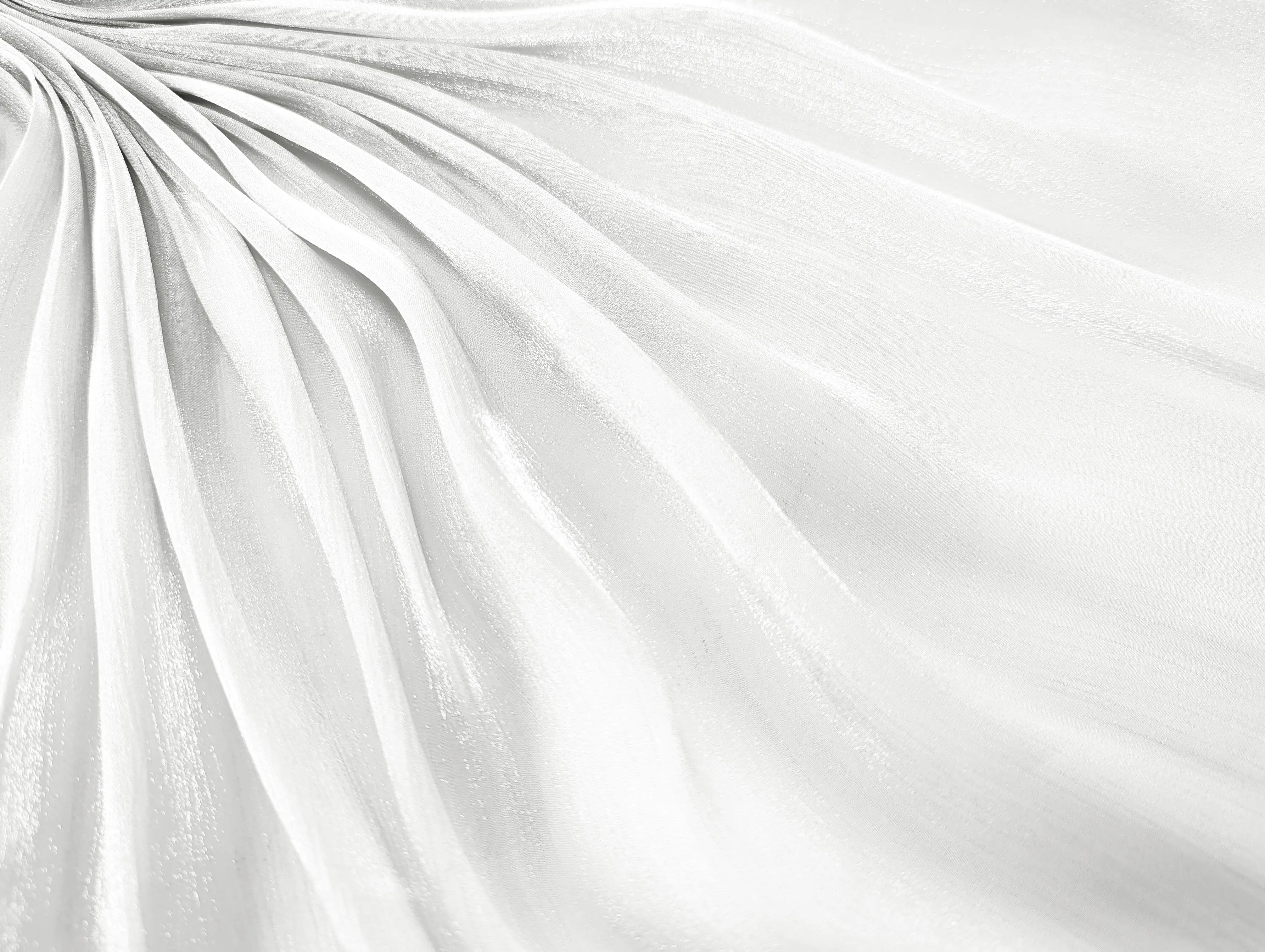 Органза с блеском жатка - невесомая, воздушная, полупрозрачная ткань с деликатным жатым эффектом и мягким, мерцающим блеском. Материал очень нежный, мягкий, тактильно приятный, шелковистый. Не тянется, при драпировке ложится в складки с мягкими изгибами. Полупрозрачная текстура и деликатное мерцание создают изысканные переливы на свету, создавая эффект глубины и движения.