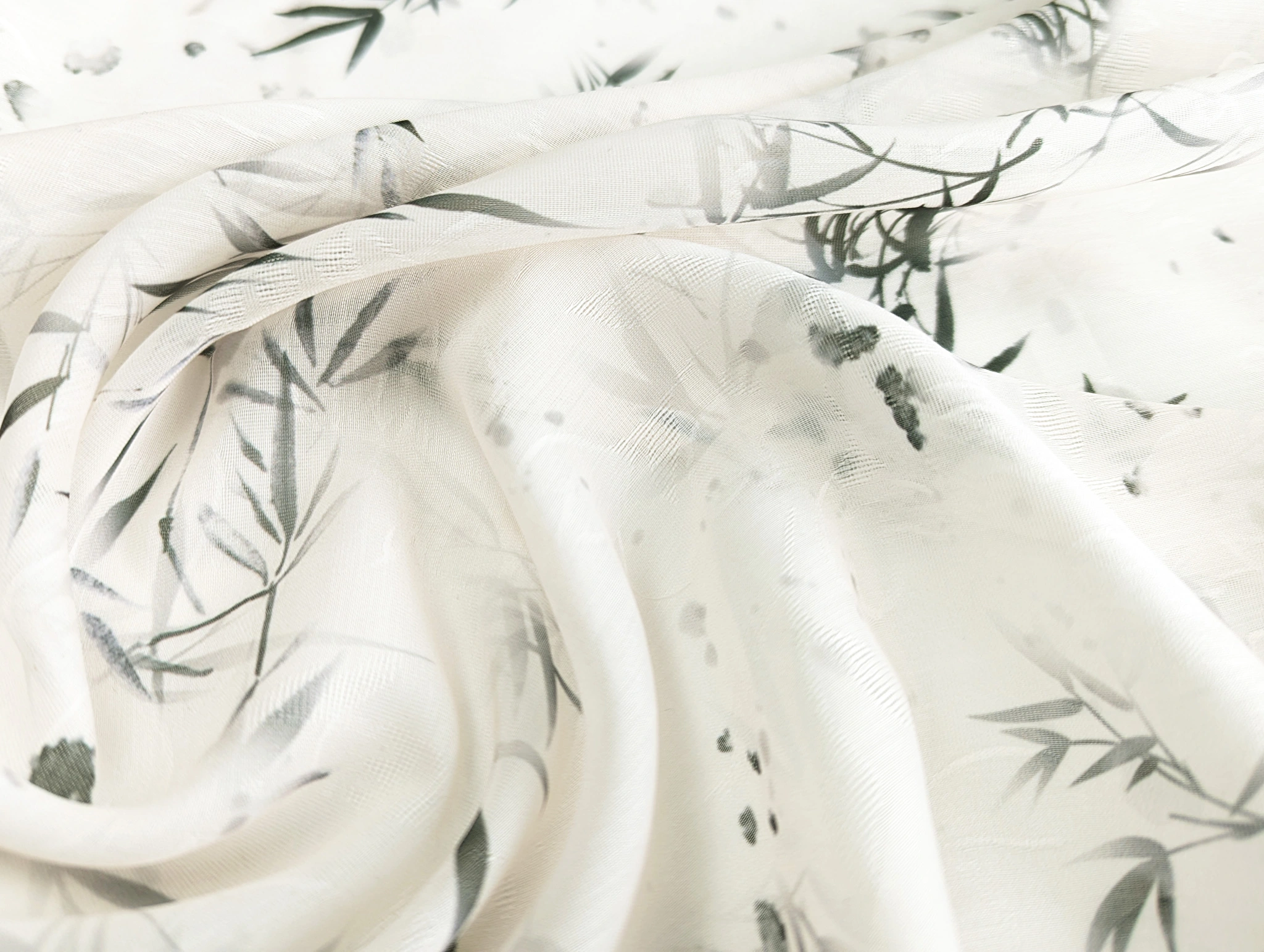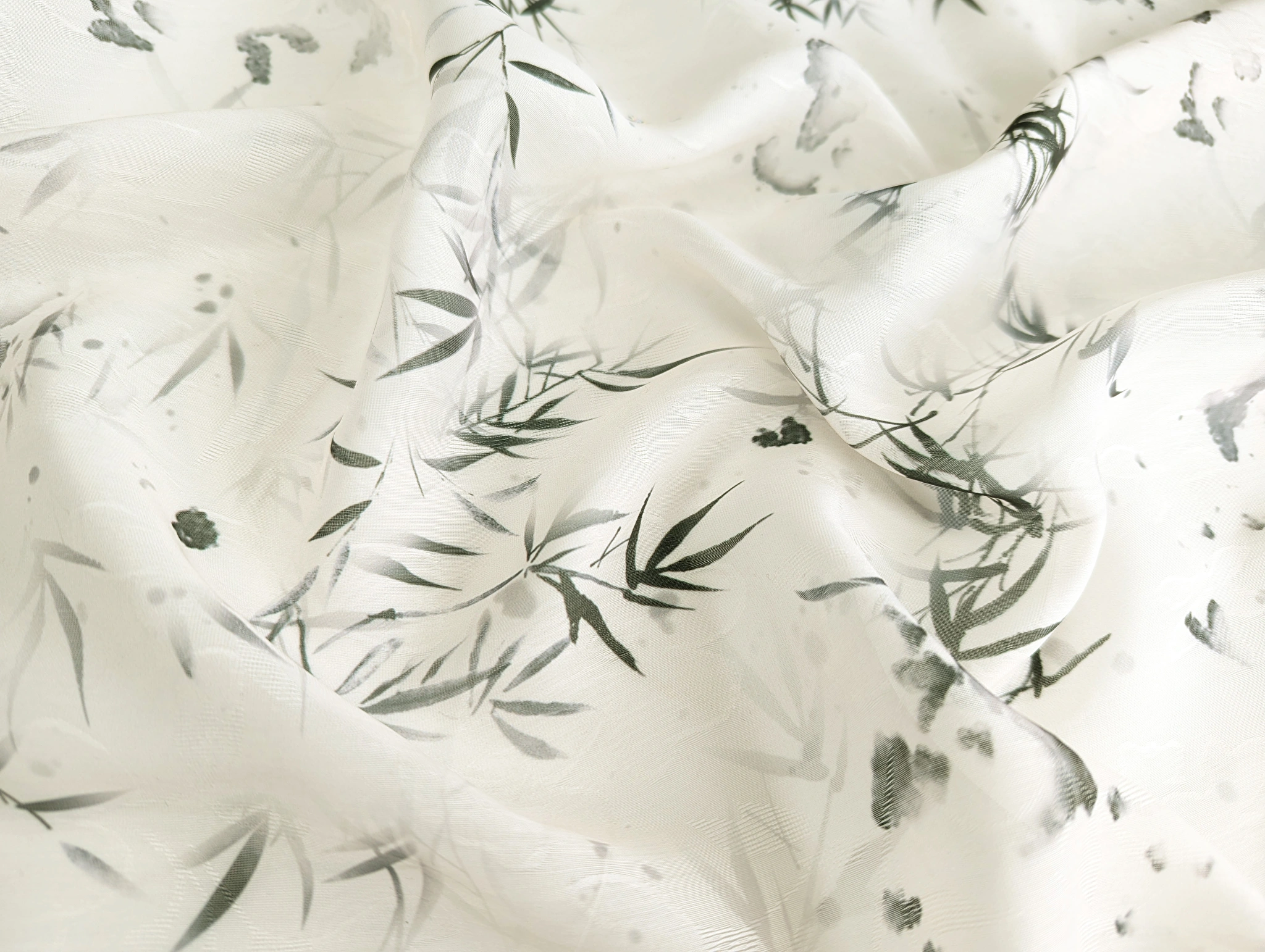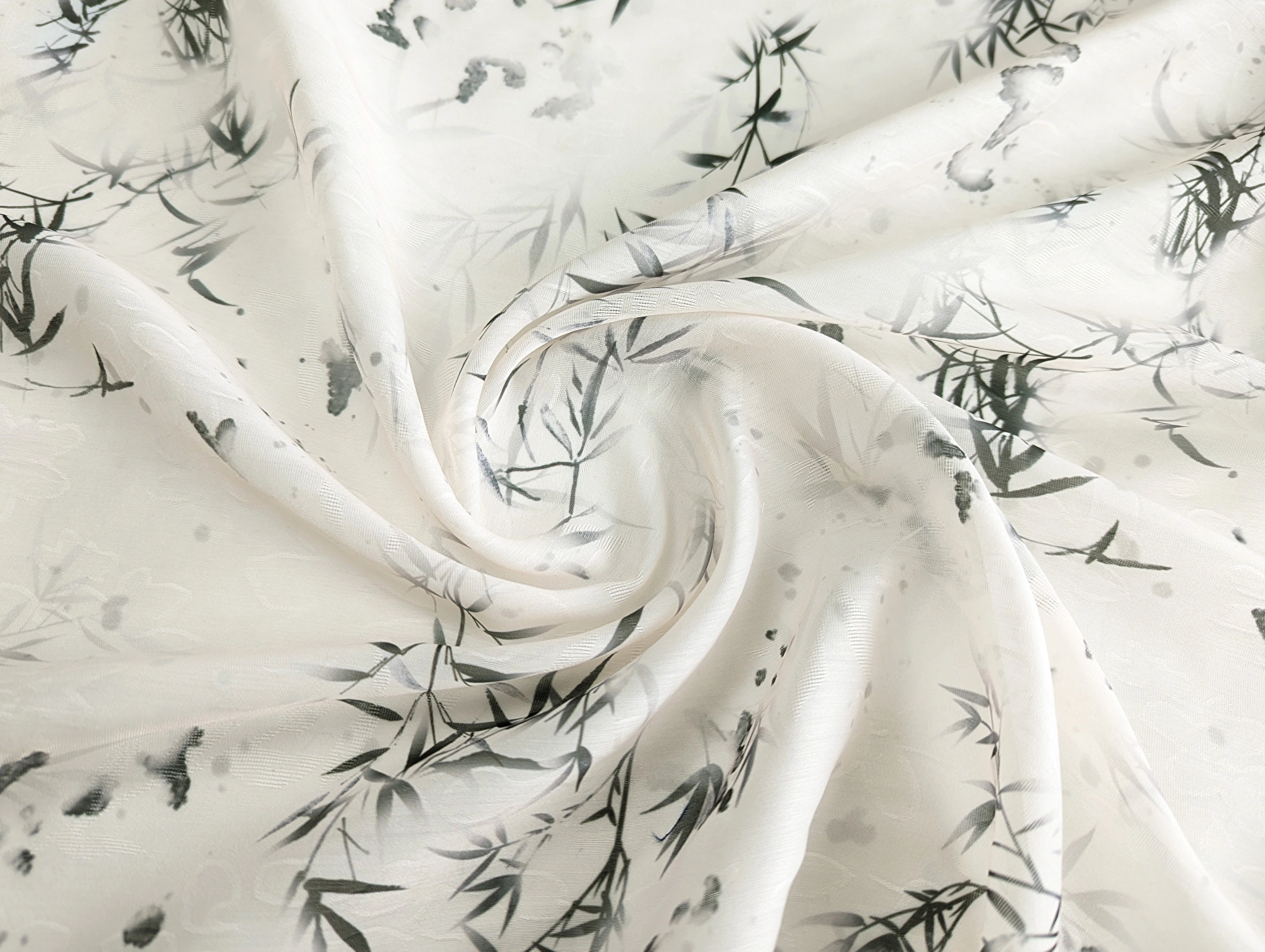 Органза жаккард - тонкий, легкий, полупрозрачный материал с жаккардовым плетением, создающим на поверхности ткани флористические узоры. Ткань неэластичная, слегка сминается, при драпировке сборки и складки образуют мягкую и воздушную форму. Полотно тактильно мягкое и комфортное.
