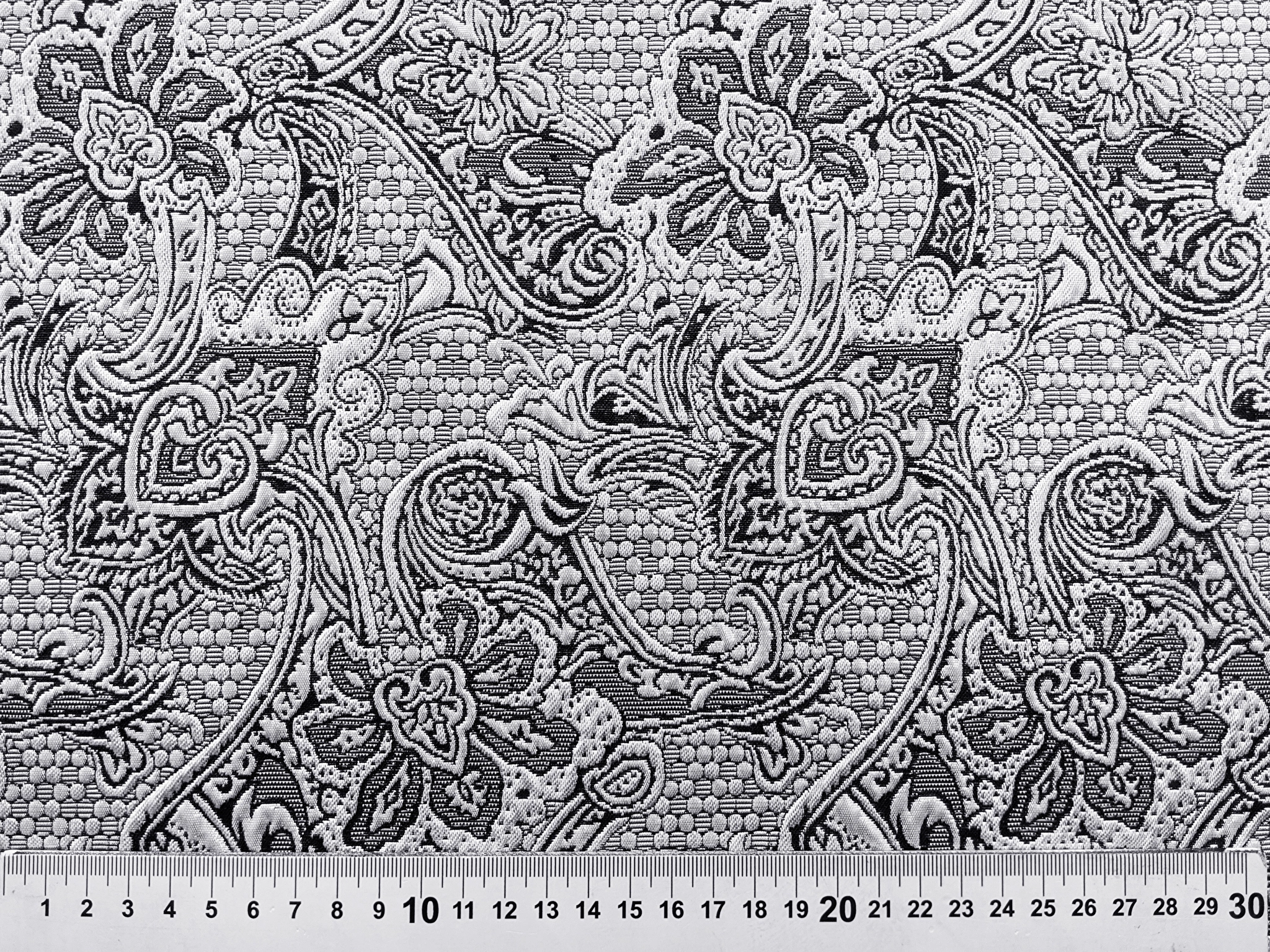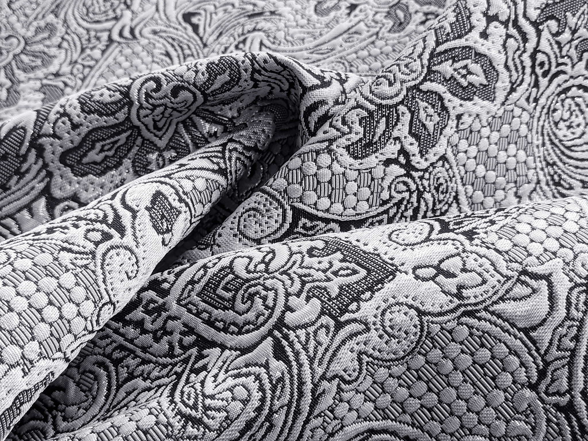 Ткань имеет структурный рисунок и люрексовые нити, что делает ее нарядной. Полотно не мнется, не тянется, хорошо драпируется, образуя стойкую складку.