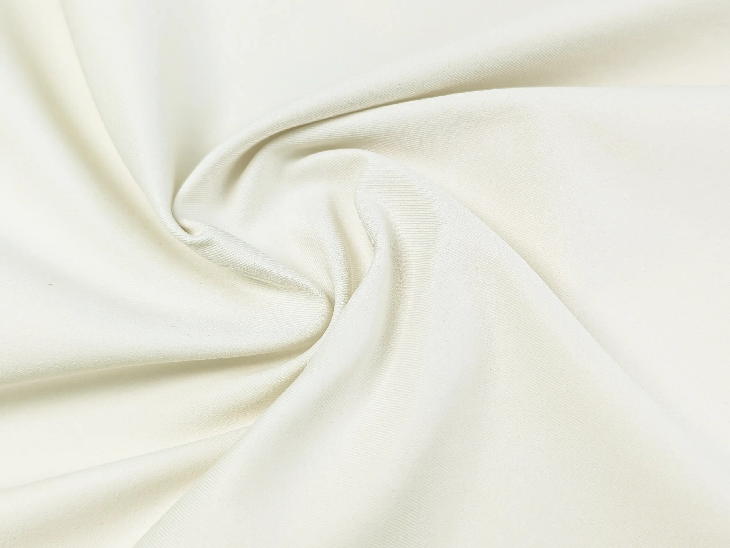 Лицевая сторона имеет выразительный полированный блеск и диагональную структуру. Ткань слегка тянется по ширине, слабо сминается, хорошо драпируется, образуя мягкие воздушные складки. Полотно плотное, не имеет силуэтного просвета даже в молочном цвете. Неприхотливо в уходе, но рекомендован деликатный режим стирки.
