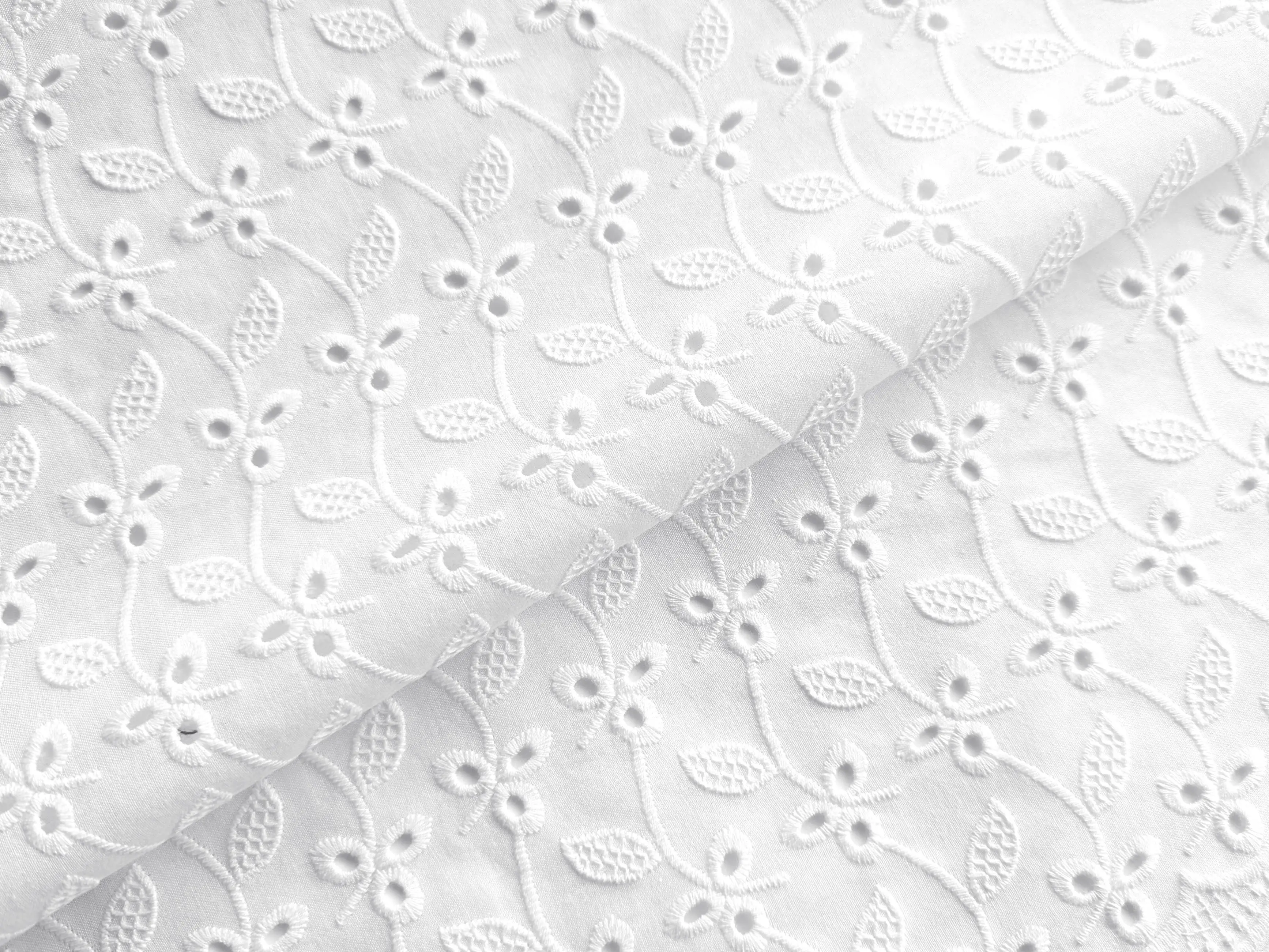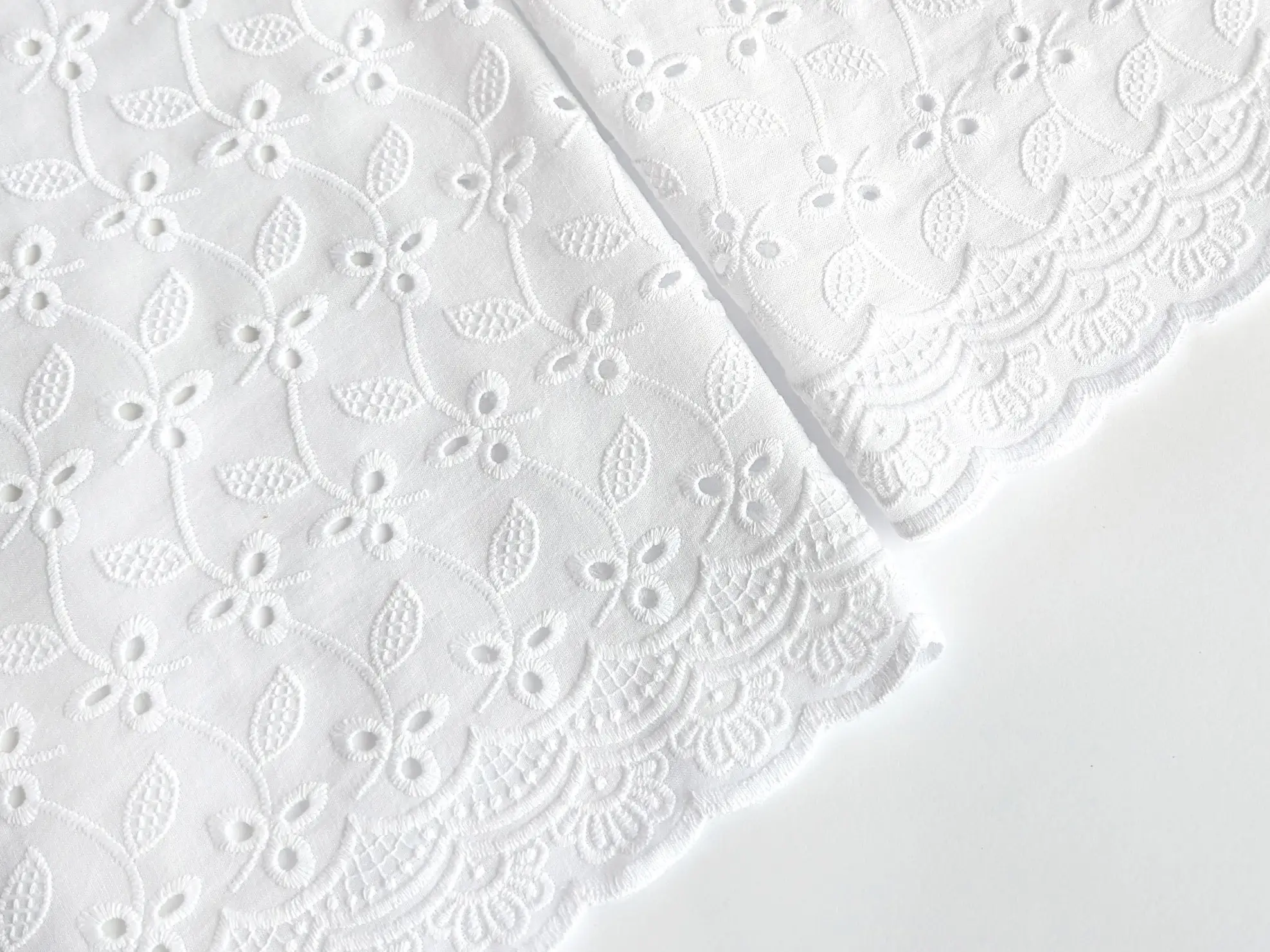 Прошва с двухсторонним фестоном - легкий хлопчатобумажный материал с фигурным прорезным рисунком и цветочной вышивкой. Полотно дополнено декоративной купонной обработкой по краям с обеих сторон. Благодаря фестону край полотна выглядит аккуратно и завершённо, не нуждаясь в дополнительной обработке. Ткань без эластана, склонна к сминанию, в драпировке сохраняет легкость и объем. За счет сквозной перфорации материал обладает легкой прозрачностью, поэтому в ряде изделий рекомендуется использовать подкладку.