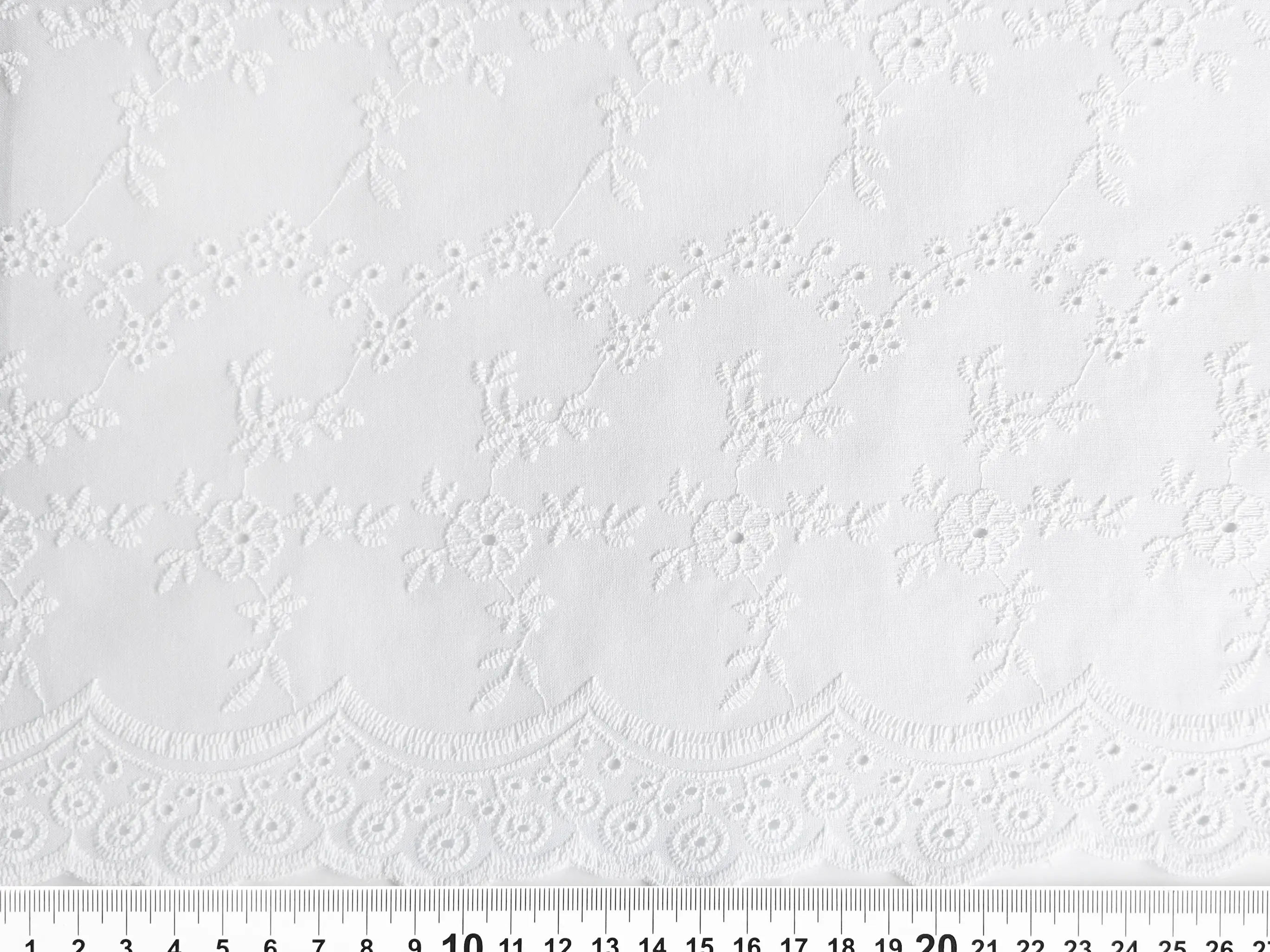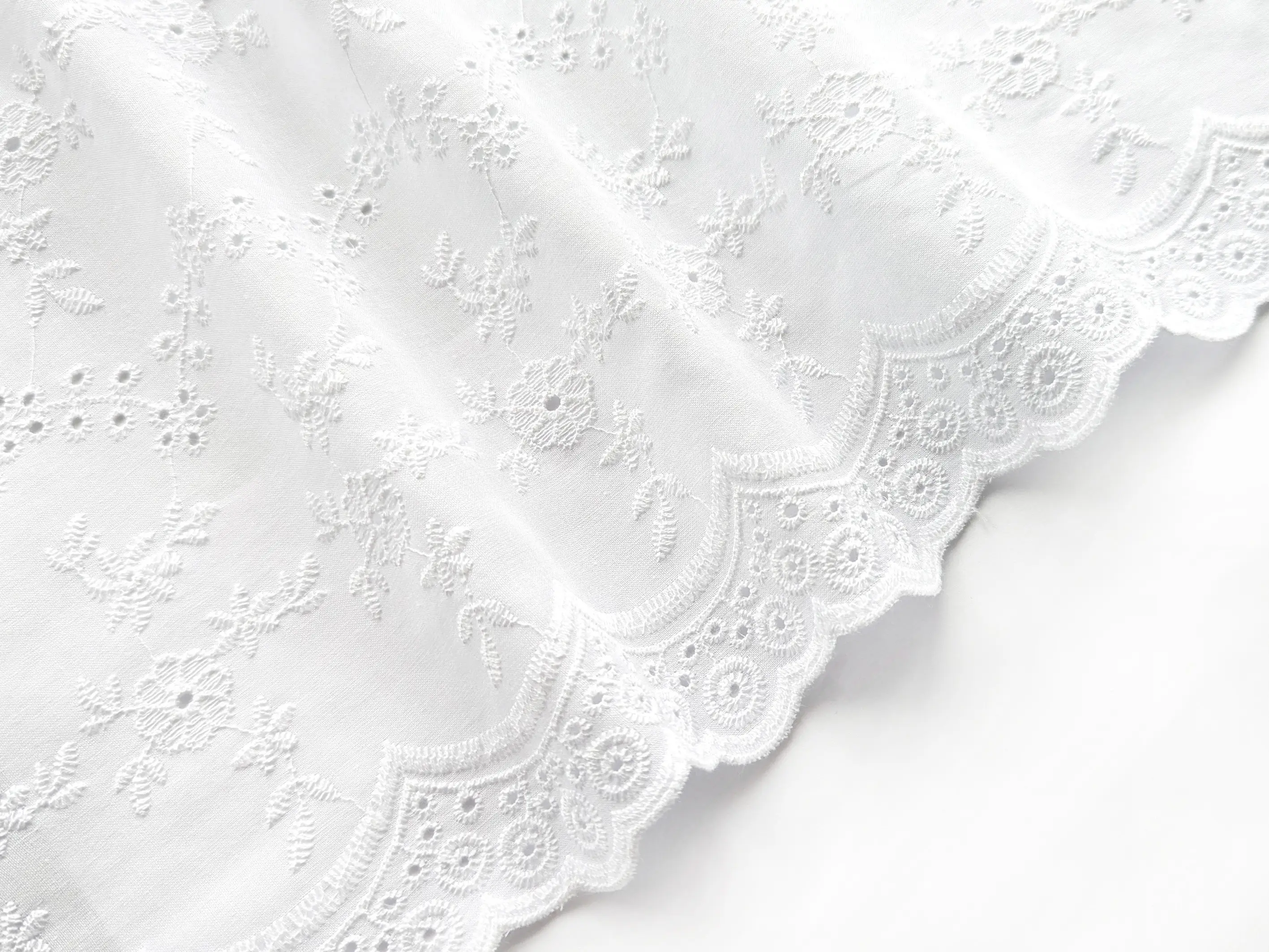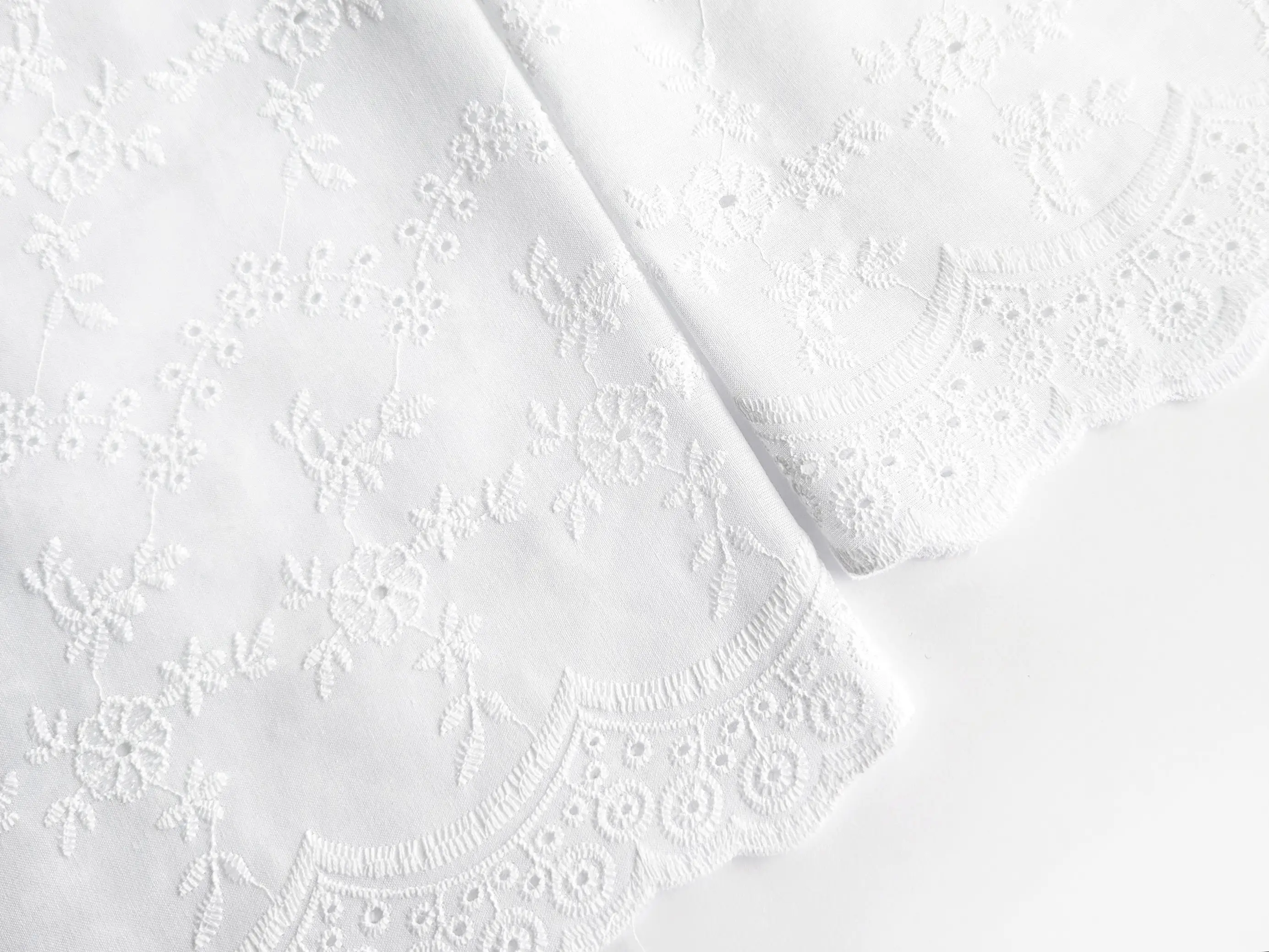 Прошва с двухсторонним фестоном - легкий хлопчатобумажный материал с фигурным прорезным рисунком и цветочной вышивкой. Полотно дополнено декоративной купонной обработкой по краям с обеих сторон. Благодаря фестону край полотна выглядит аккуратно и завершённо, не нуждаясь в дополнительной обработке. Ткань без эластана, склонна к сминанию, в драпировке сохраняет легкость и объем. За счет сквозной перфорации материал обладает легкой прозрачностью, поэтому в ряде изделий рекомендуется использовать подкладку.