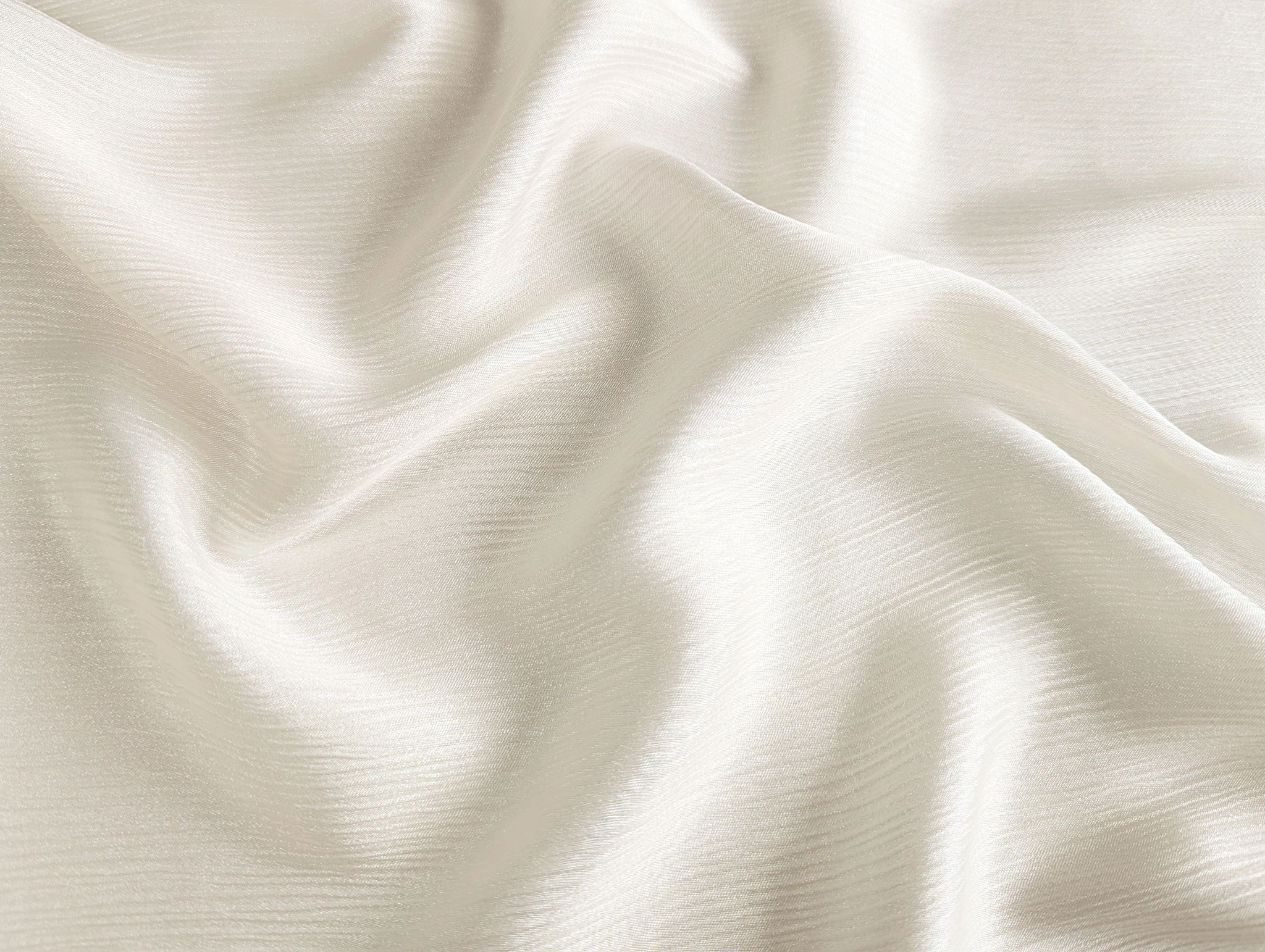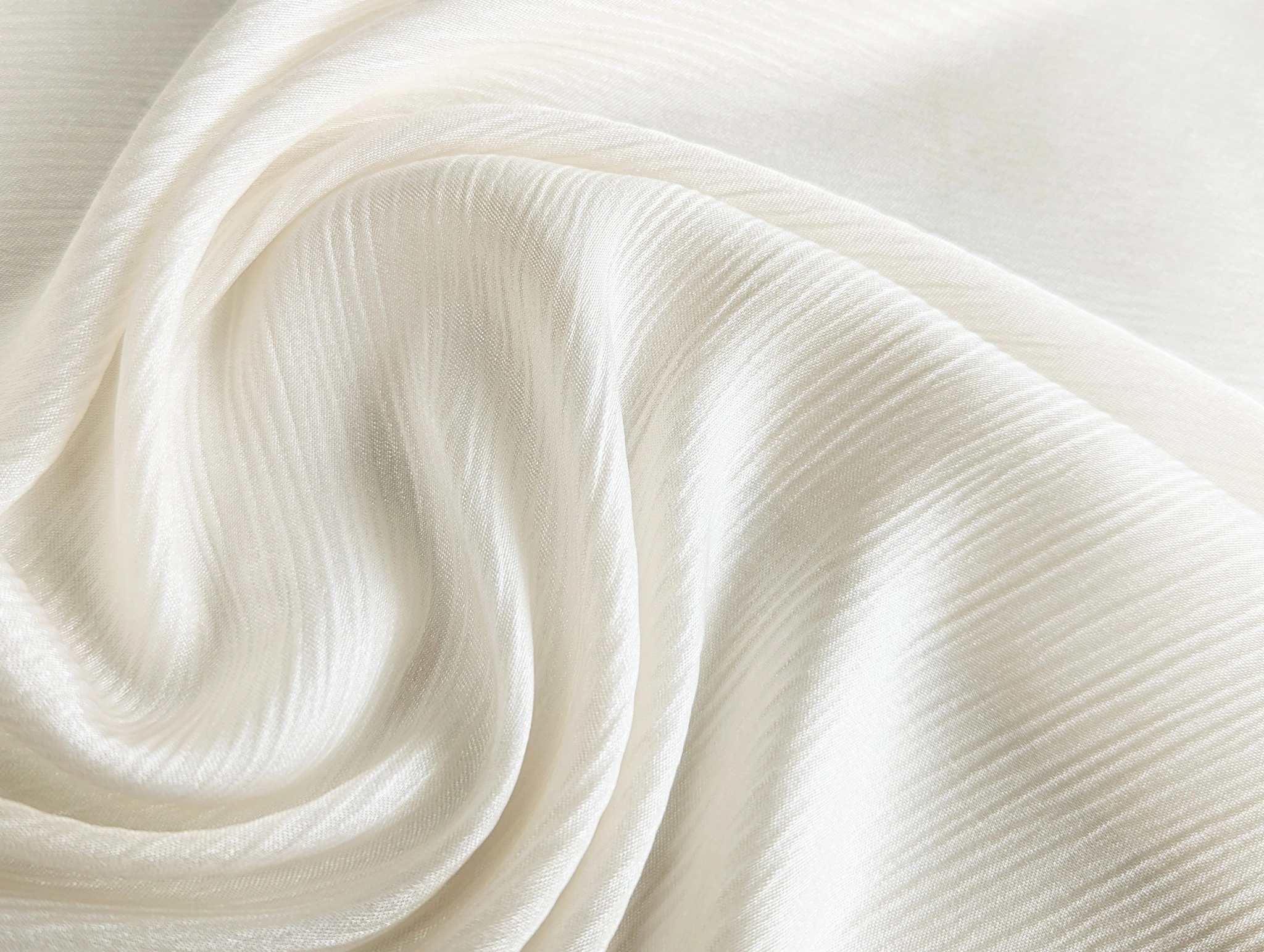 Сатин жатий - м'який, ковзний, тактильно ніжний матеріал з благородним сатиновим блиском і жатою структурою. Рельєфний візерунок, у вигляді складок, спрямований уздовж полотна. Під час драпірування тканина лягає в м'які складки, не мнеться, присутня технічна розтяжність по ширині полотна, світлі відтінки мають легкий силуетний просвіт.