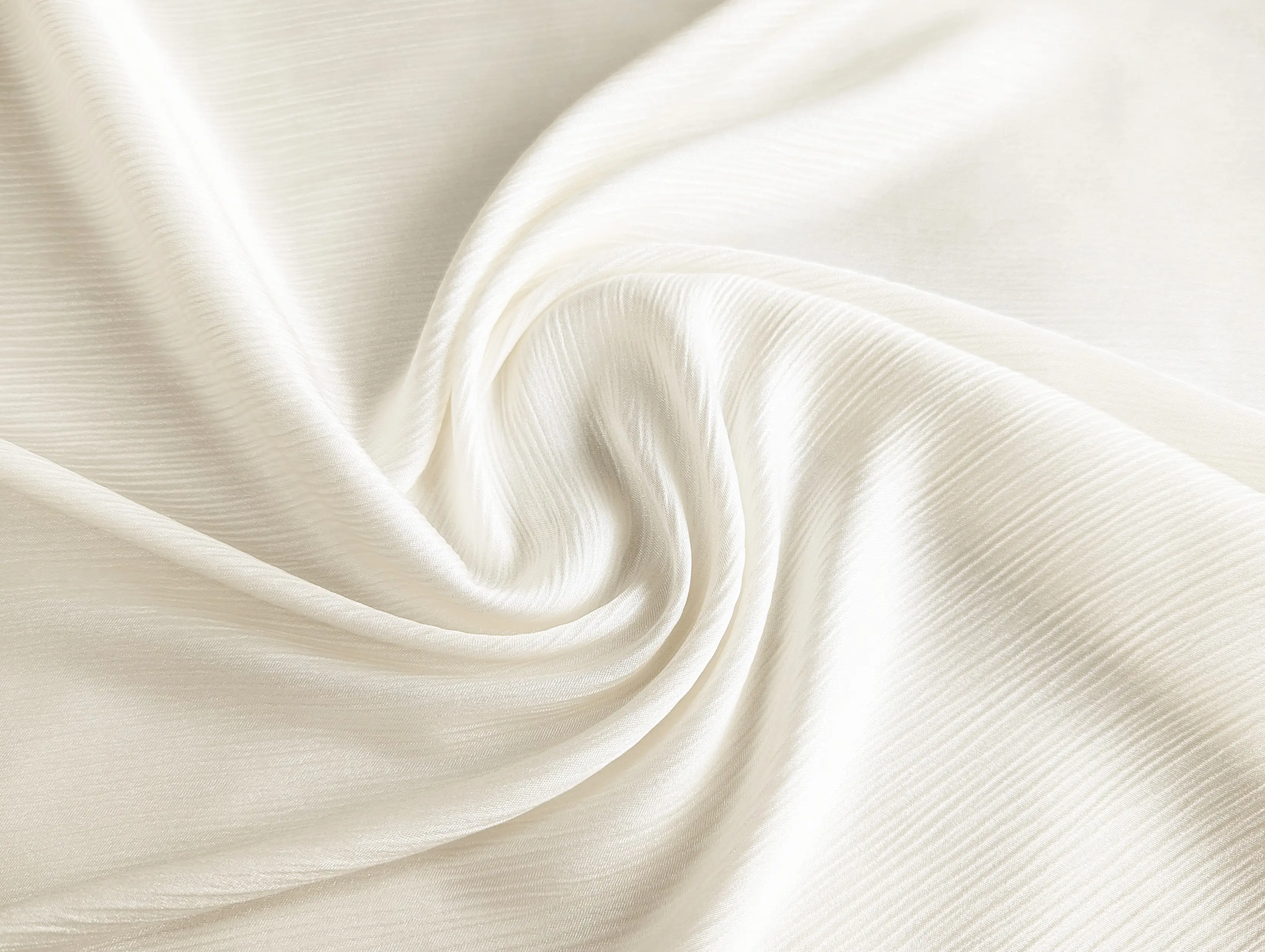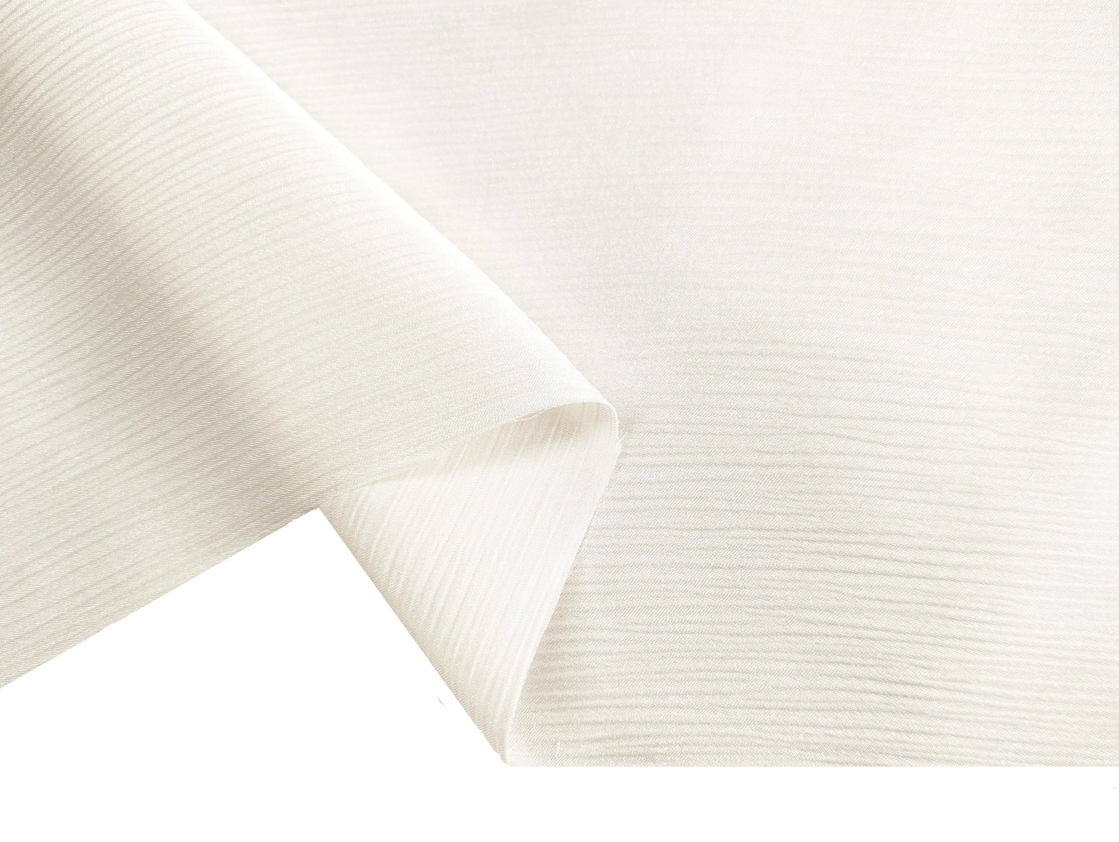 Сатин жатый - мягкий, скользящий, тактильно нежный материал с благородным сатиновым блеском и жатой структурой. Рельефный узор, в виде складок, направлен вдоль полотна. При драпировке ткань ложится в мягкие складки, не мнется, присутствует техническая растяжимость по ширине полотна, светлые оттенки имеют легкий силуэтный просвет.