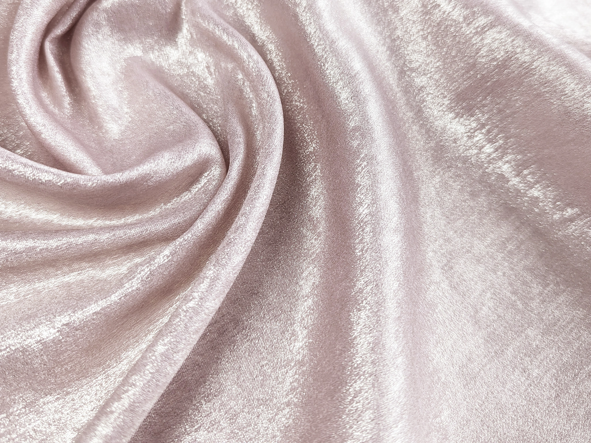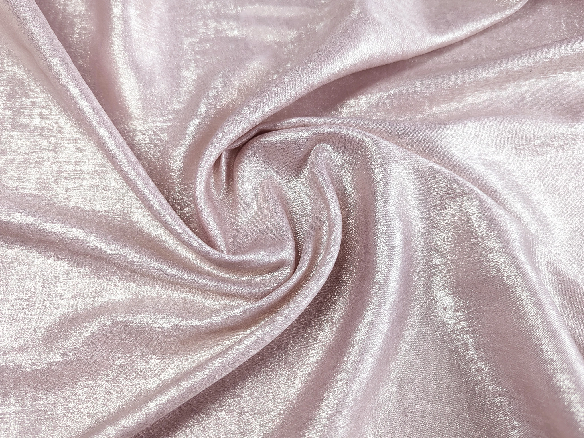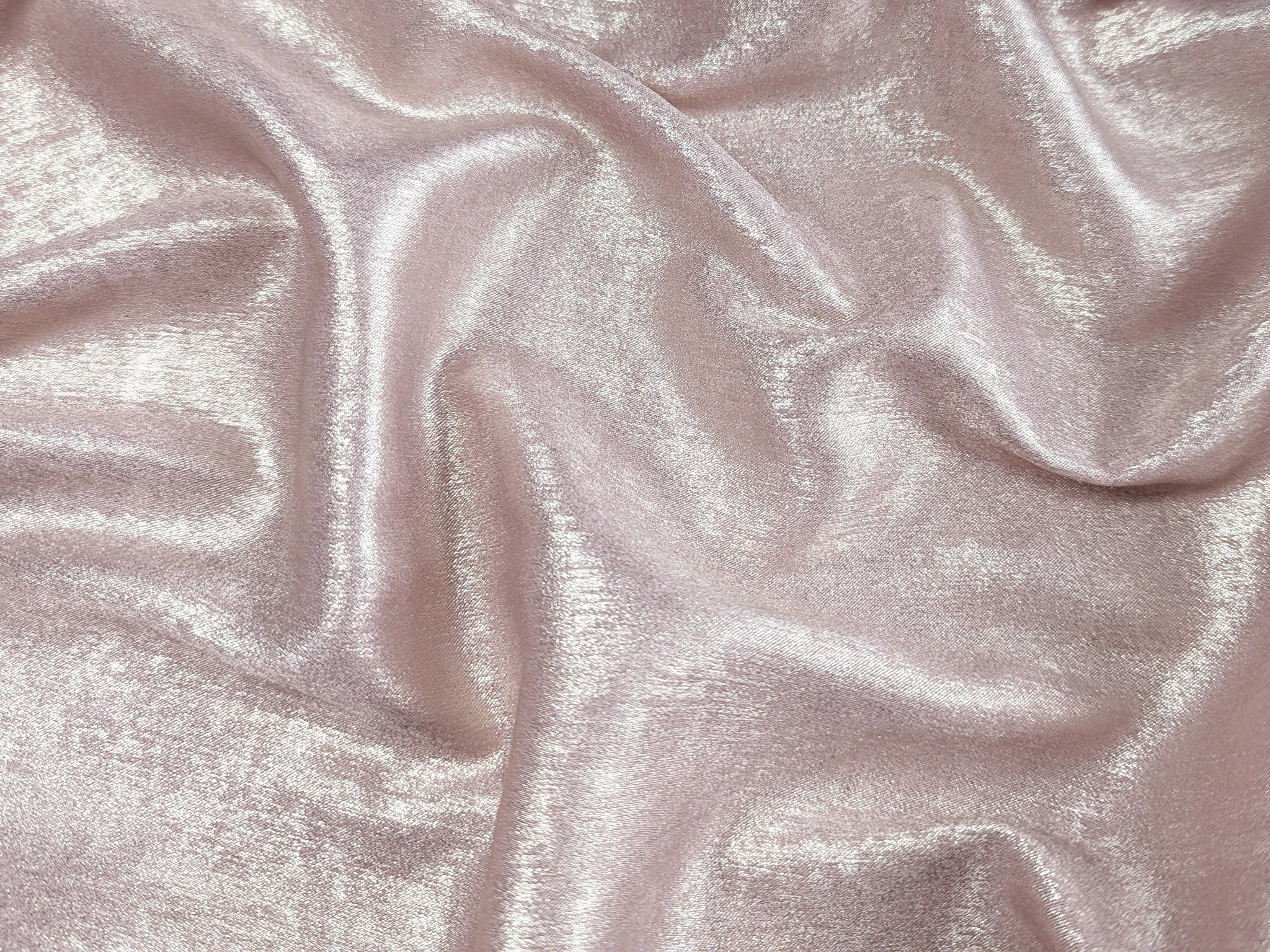 Сатин Шиммер - тонкий, легкий, струящийся материал. Вплетенная металлизированная нить формирует на поверхности ткани неравномерный переливающийся эффект сияния, изнаночная сторона однотонная, гладкая, матовая. На ощупь материал слегка шероховатый, но при этом тактильно приятный, не эластичный, на теле не просвечивает, не сминается, при драпировке формируются плавные, мягкие складки.