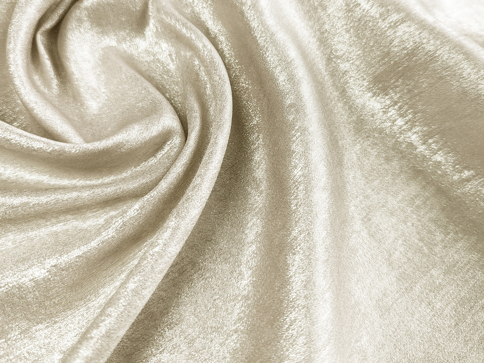 Сатин Шиммер - тонкий, легкий, струящийся материал. Вплетенная металлизированная нить формирует на поверхности ткани неравномерный переливающийся эффект сияния, изнаночная сторона однотонная, гладкая, матовая. На ощупь материал слегка шероховатый, но при этом тактильно приятный, не эластичный, на теле не просвечивает, не сминается, при драпировке формируются плавные, мягкие складки.