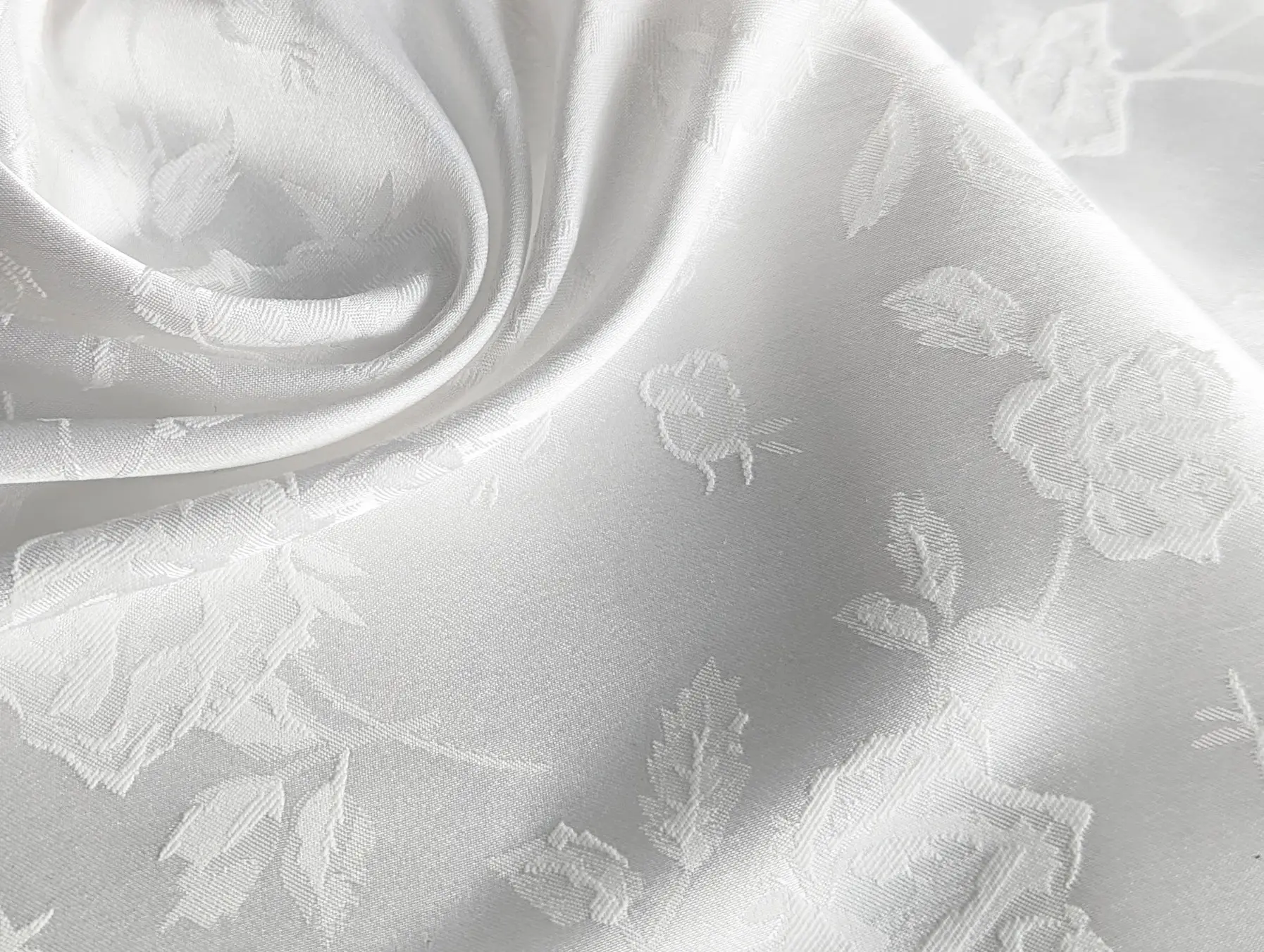 Сатин жаккард - тонкая, легкая, гладкая ткань с фактурным жаккардовым рисунком и благородным сатиновым блеском. Тактильно материал мягкий, скользящий и шелковистый. Ткань не сминаемая, легкая эластичность присутствует по ширине полотна, светлые оттенки имеют легкий силуэтный просвет. При драпировке укладывается в мягкие складки.