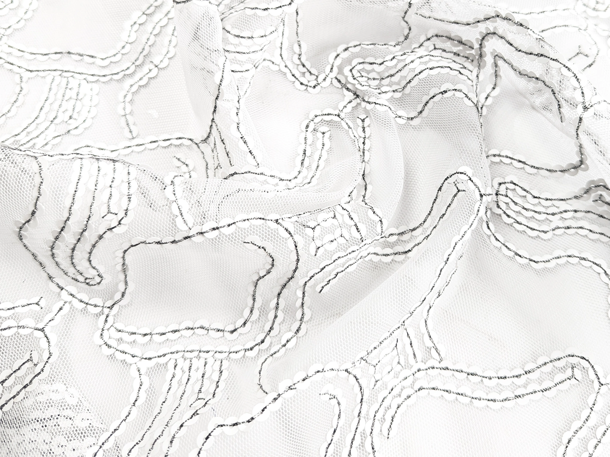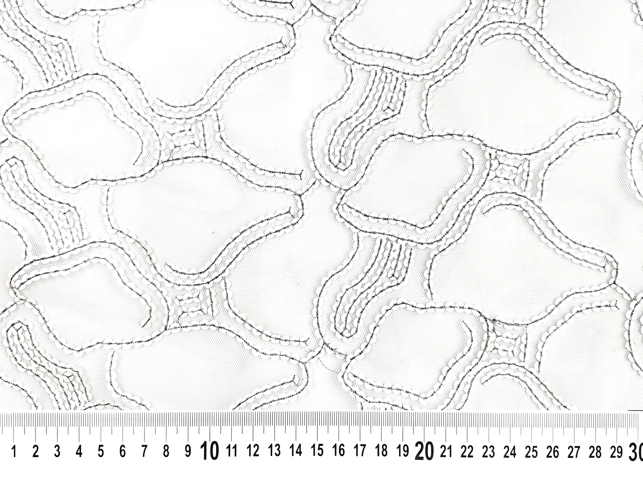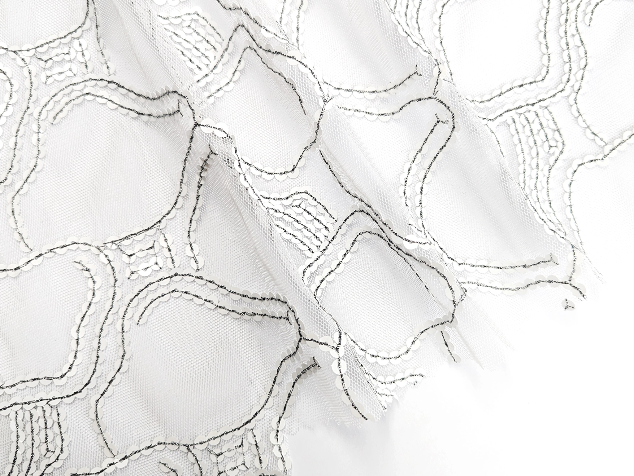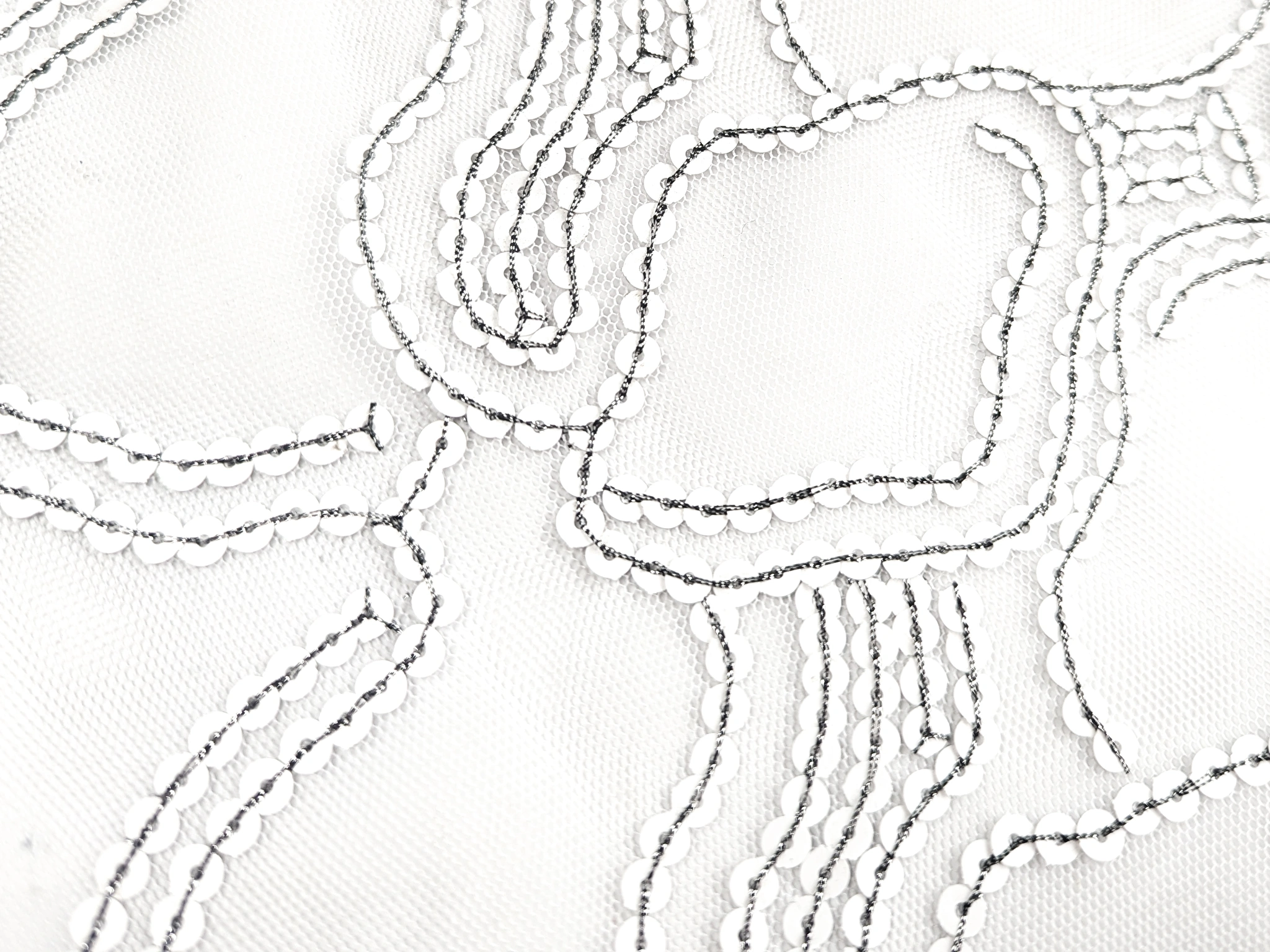 Белая декорированная сетка с узором из пайетки пришитой темной контрастной нитью с люрексом, сетка не стрейчевая, с не завершеным краем.