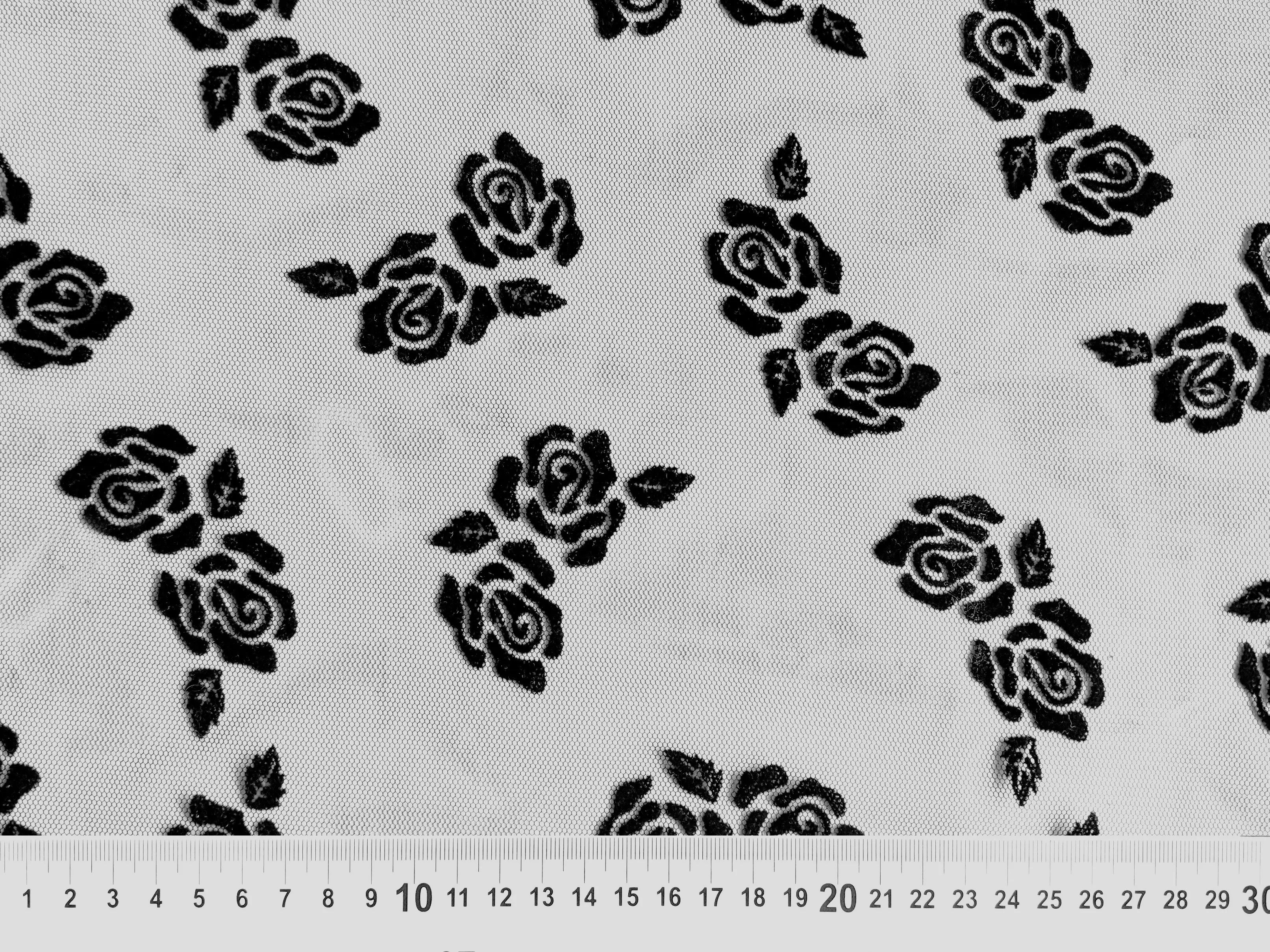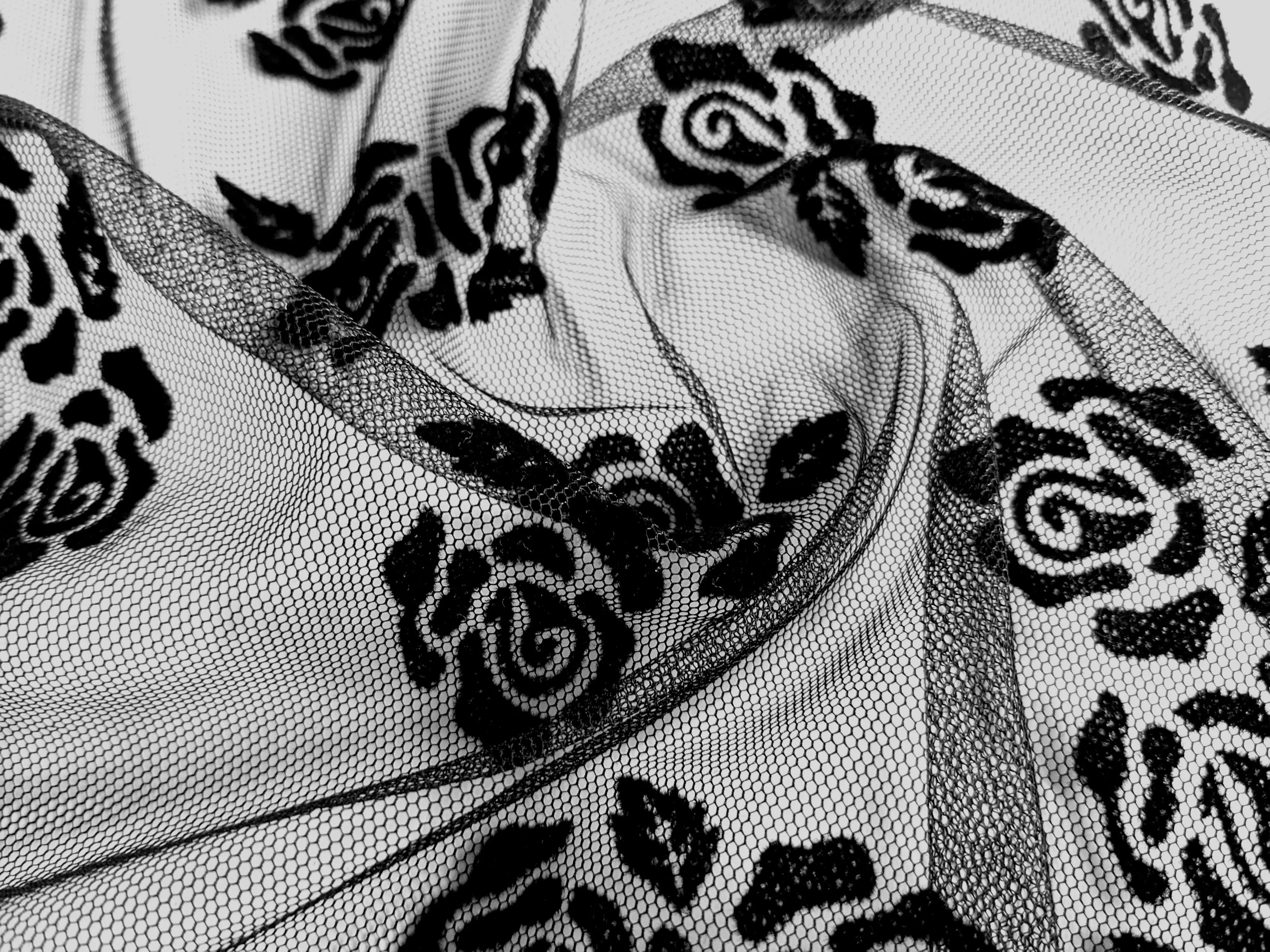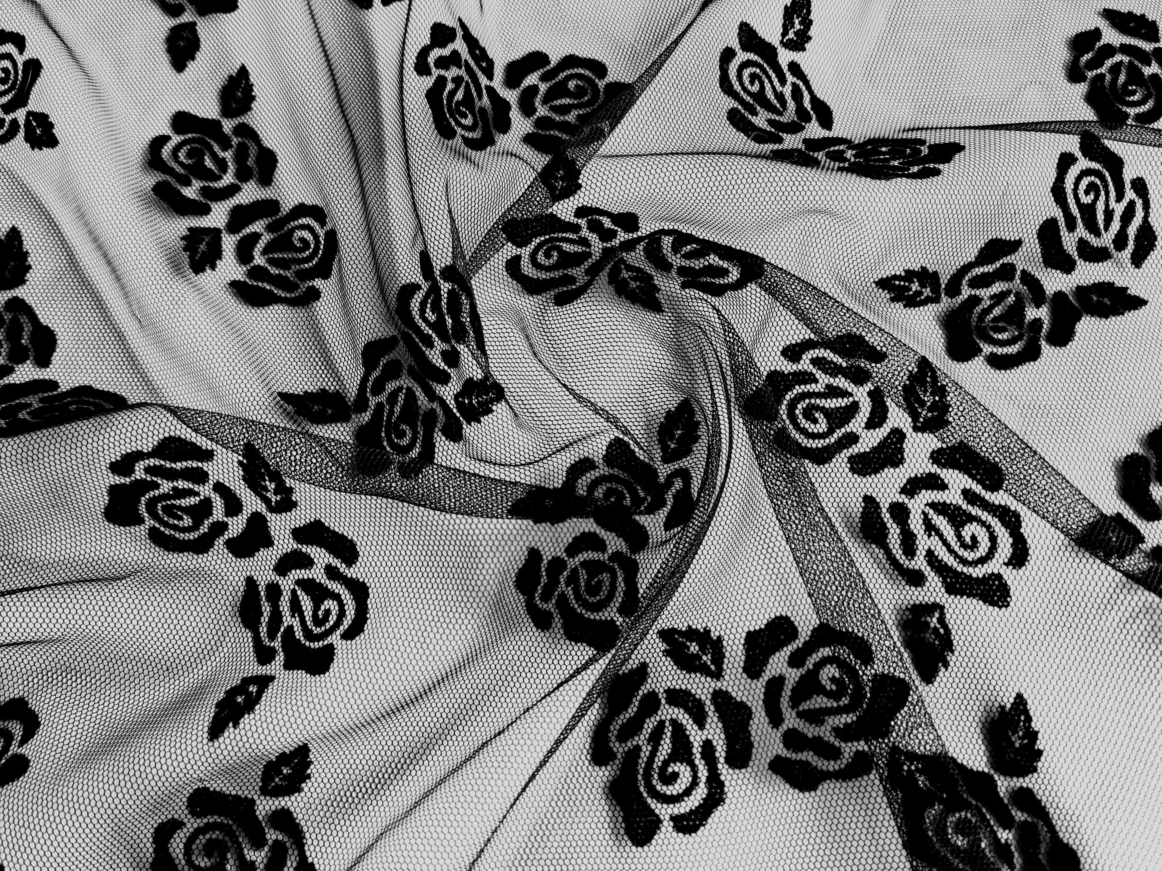 Черная сетка с флоком станет отличным дополнением в пошиве любого наряда, будь то вечернее платье, блуза или костюм в спортивном стиле.