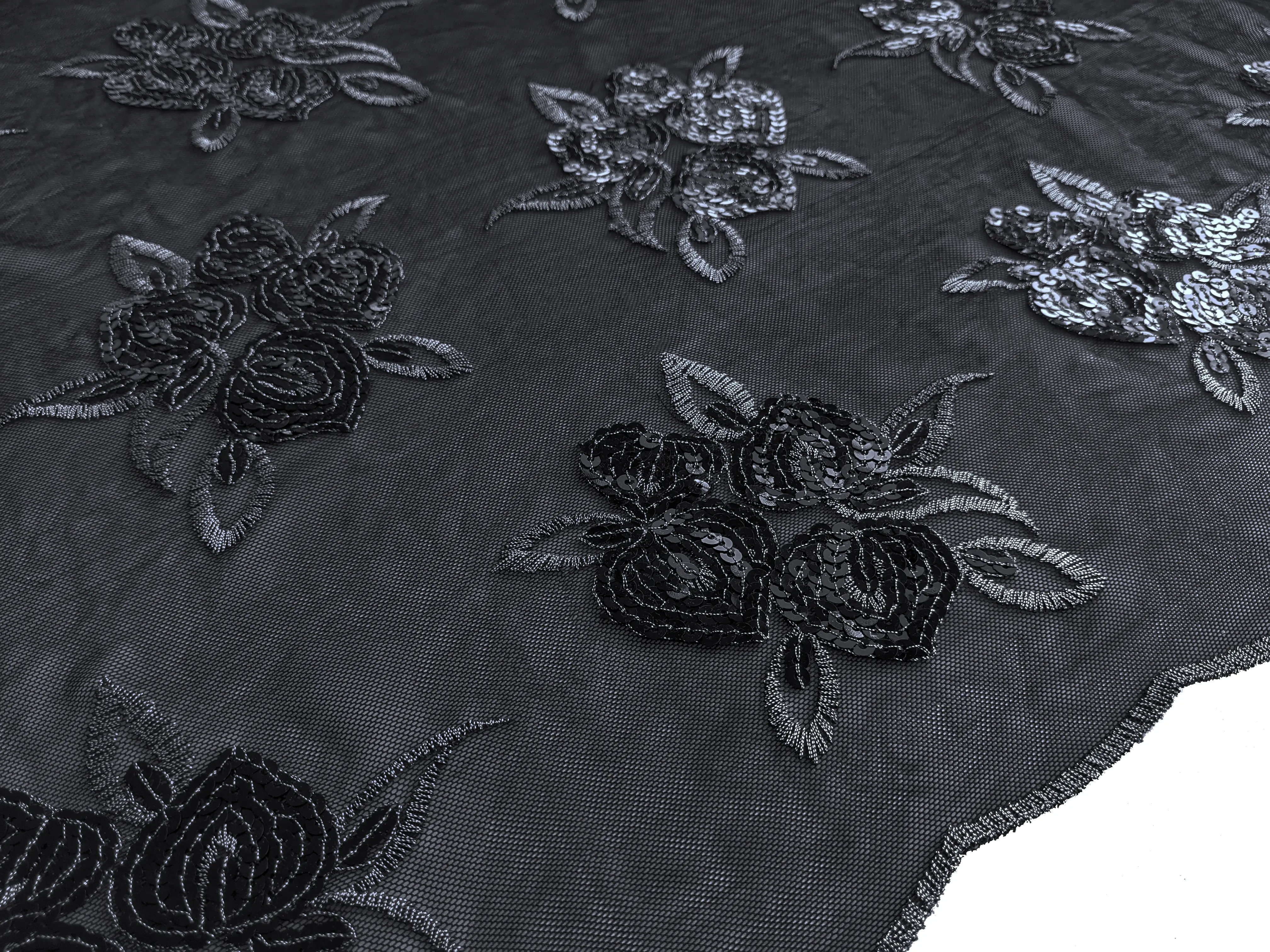 Черная сетка декорирована цветочным букетом с пайетками, сетка стрейчевая, с завершеным краем.