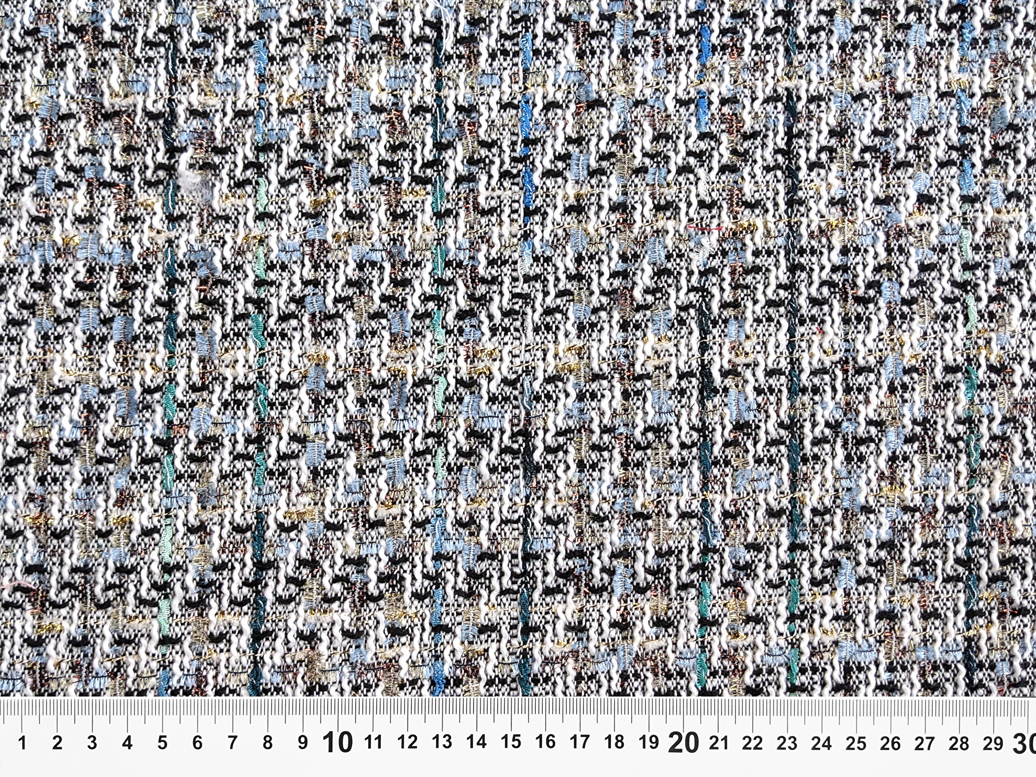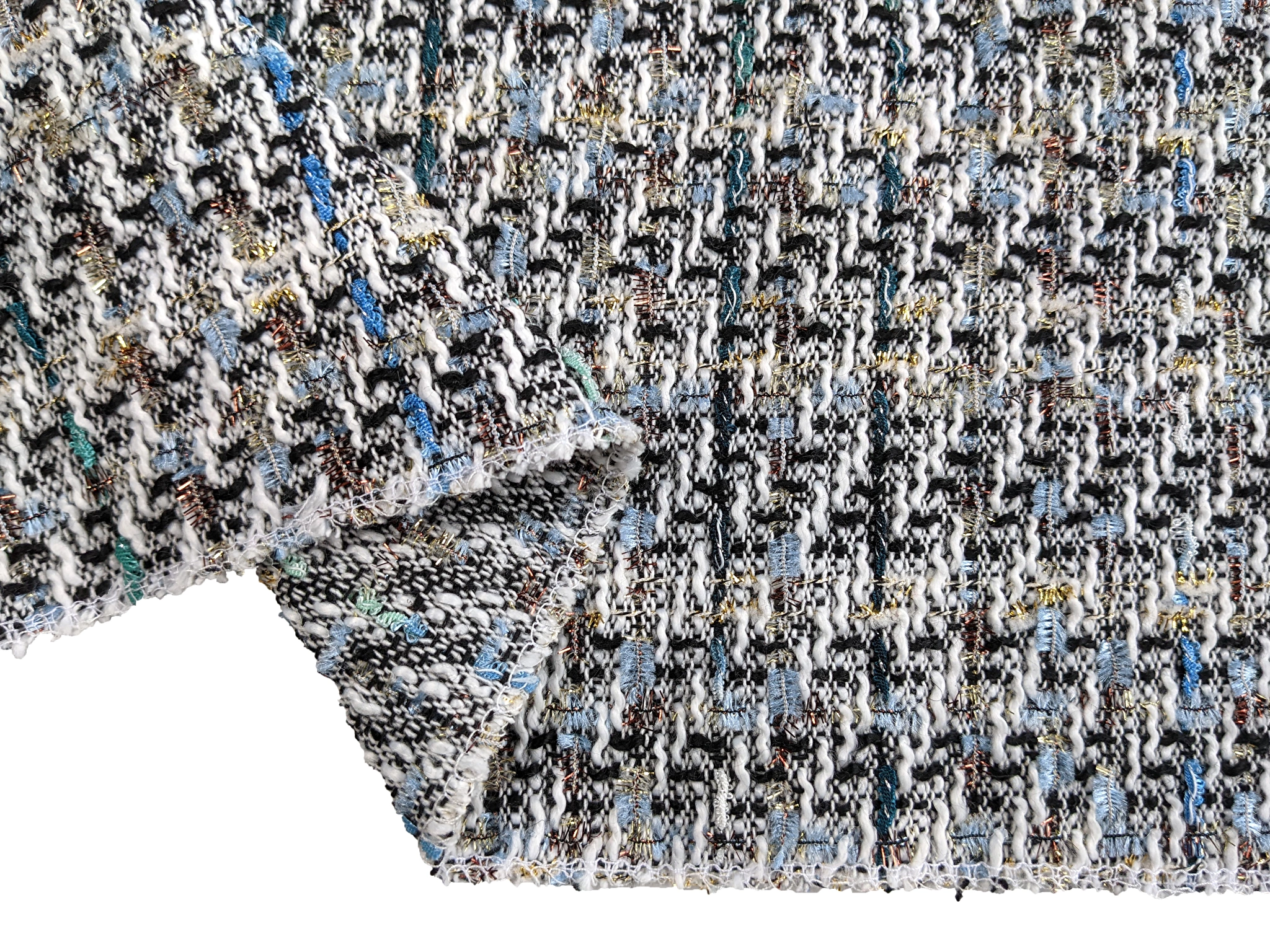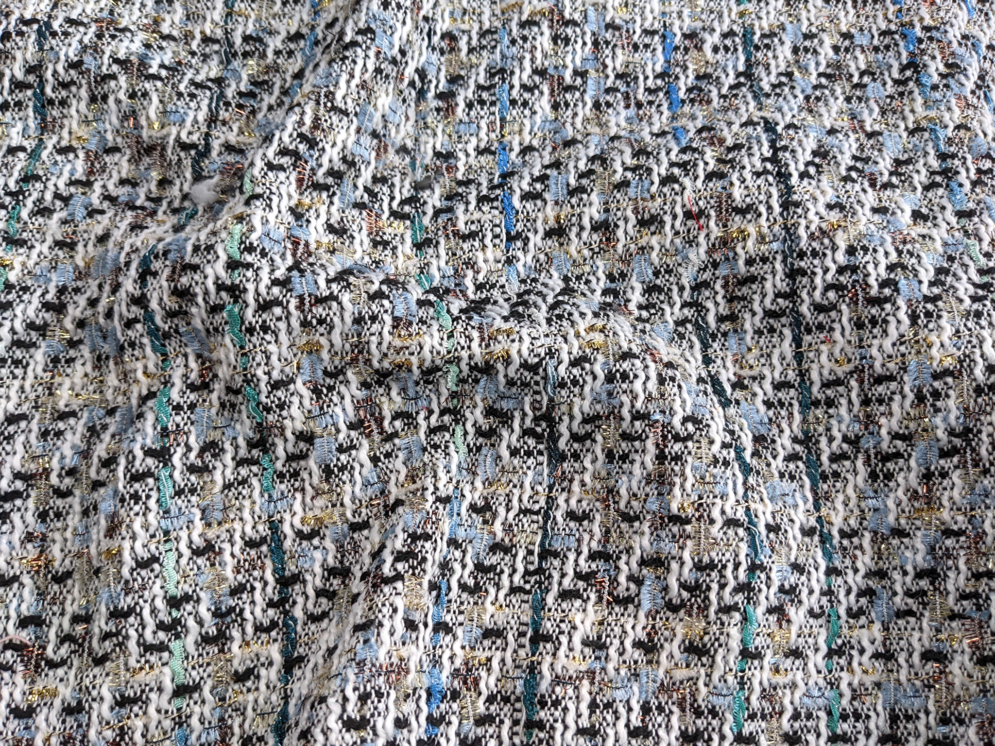 Шанель твид очень приятная на ощупь ткань, мягкая, износоустойчивая, теплая. По всему полотну вплетена люрексовая нить. Изнанка ткани не колется. Полотно плотное, но не тяжелое, не сминается, не деформируется и не растягивается. Жаккардовая структура полотна позволяет создавать бахрому, как яркий дополнительный элемент изделия. Женские костюмы, жакеты, пальто добавят вашему образу женственности и элегантности.