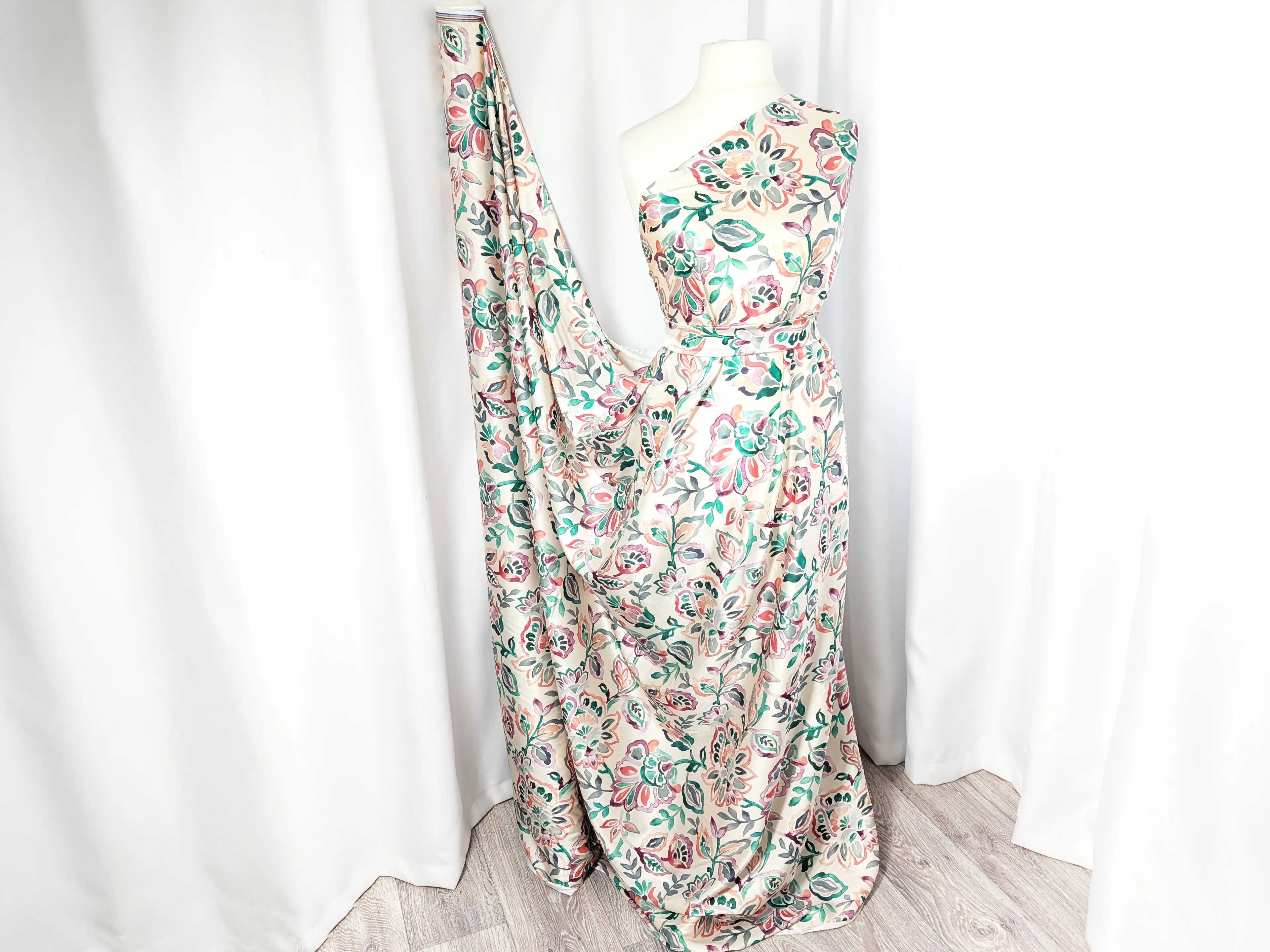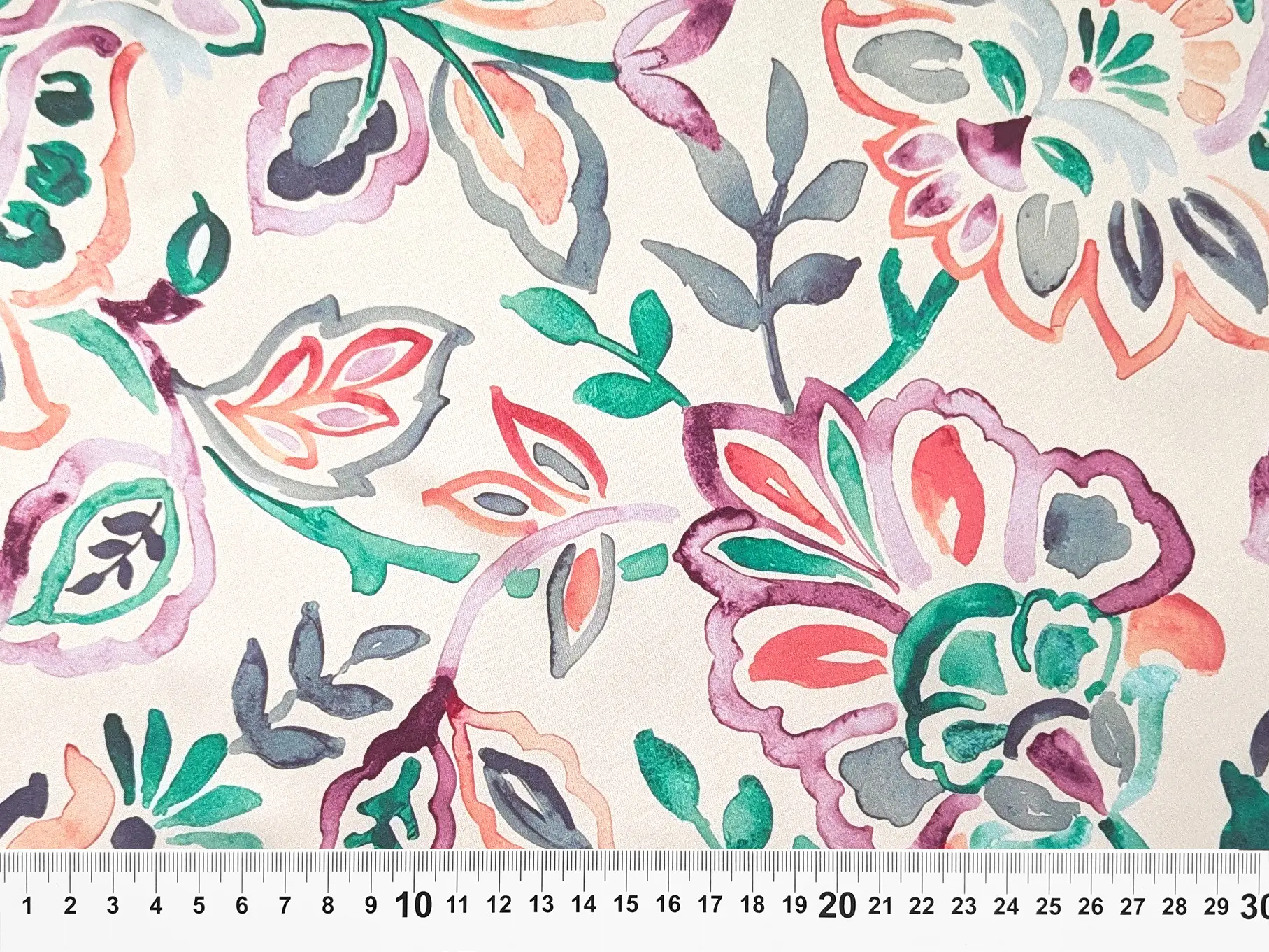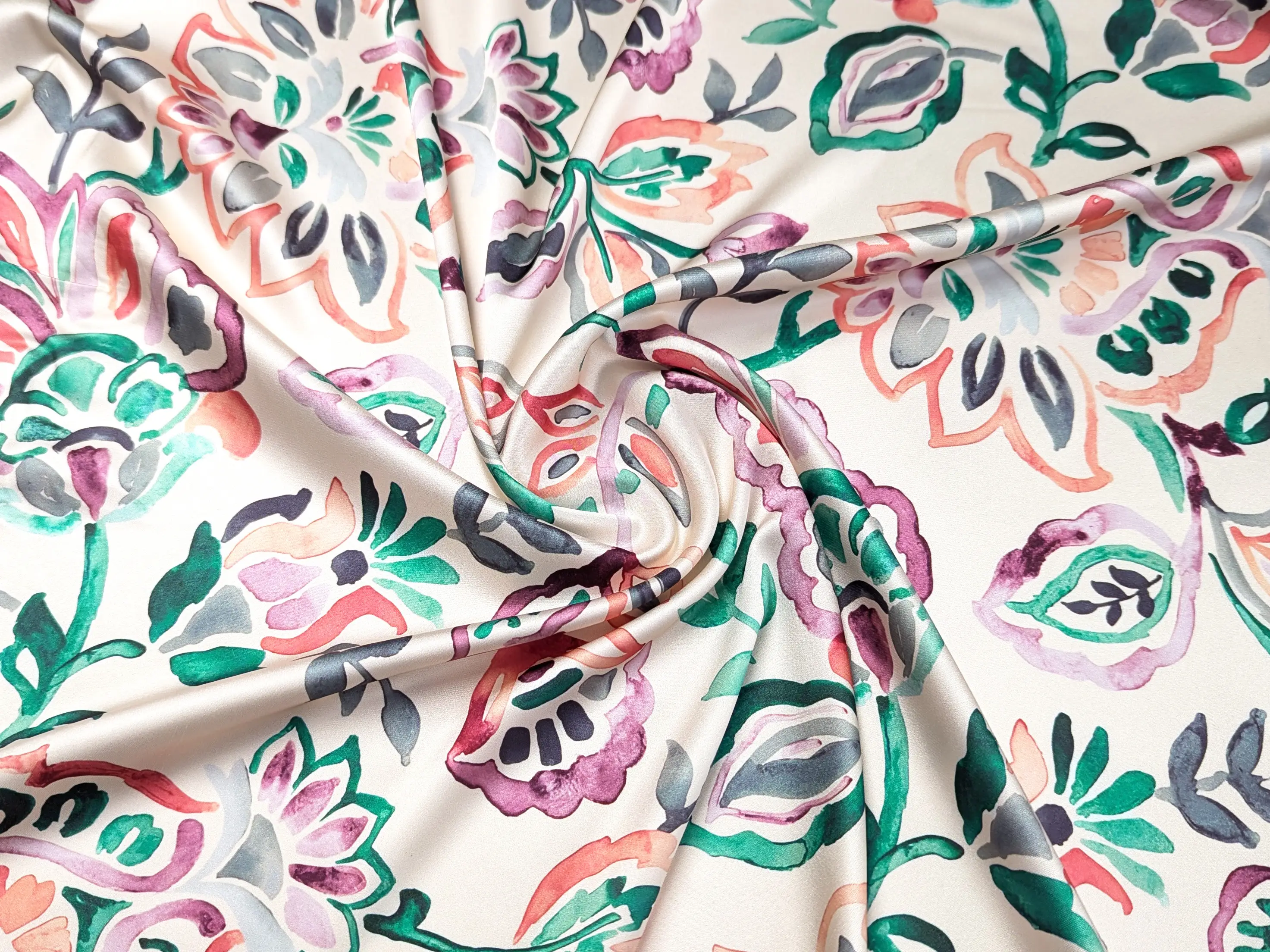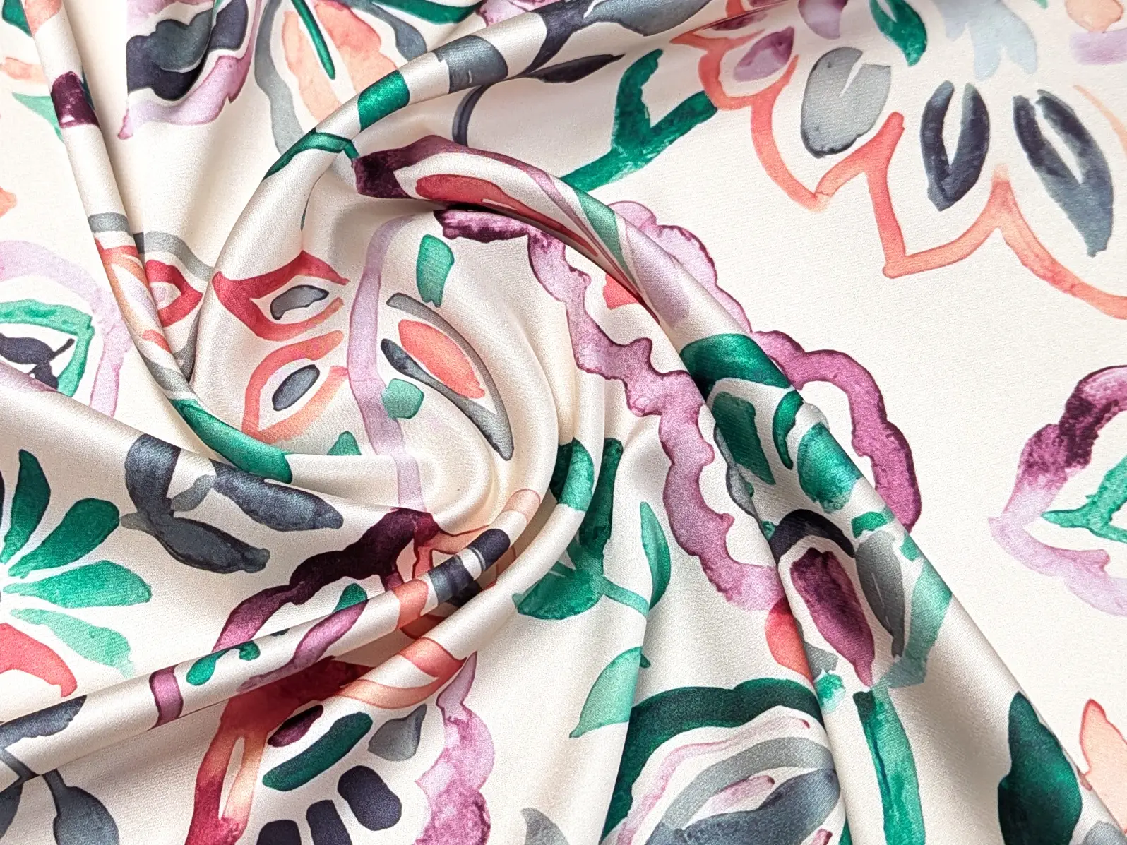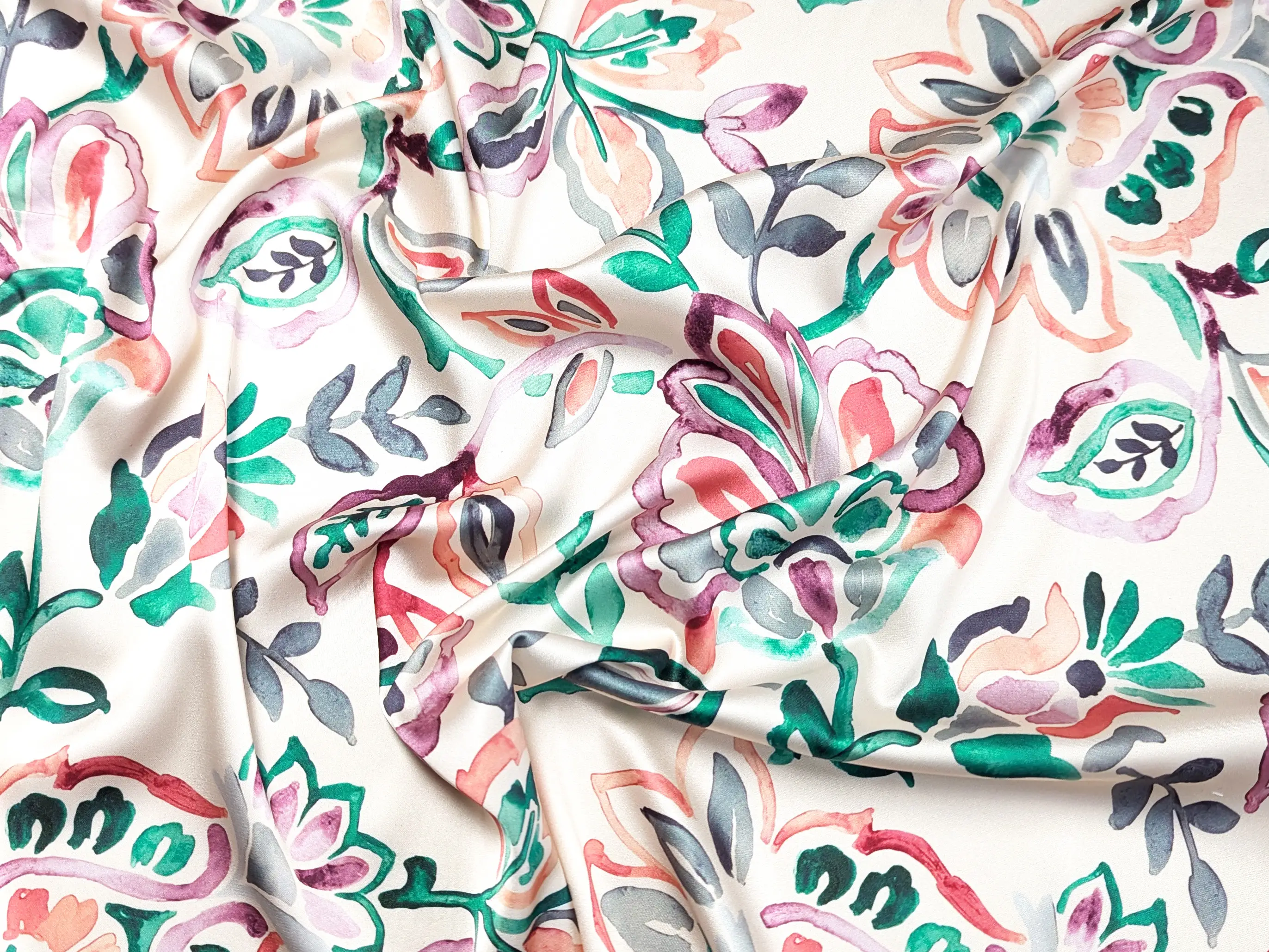 Шелк Армани акварельный сад, изумрудный с коралловым