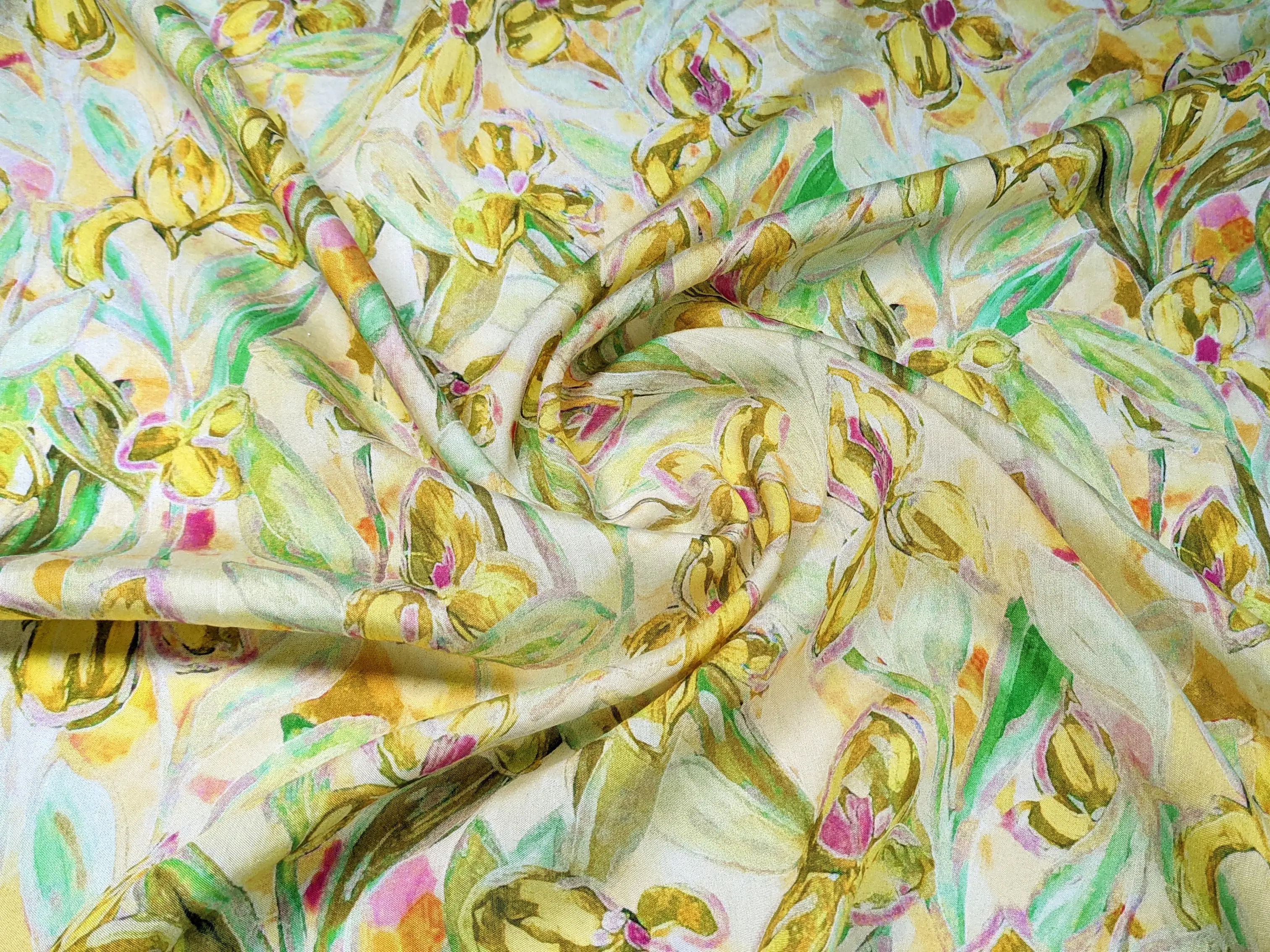 Шелк вискоза цветочные узоры, лимонный с салатовым