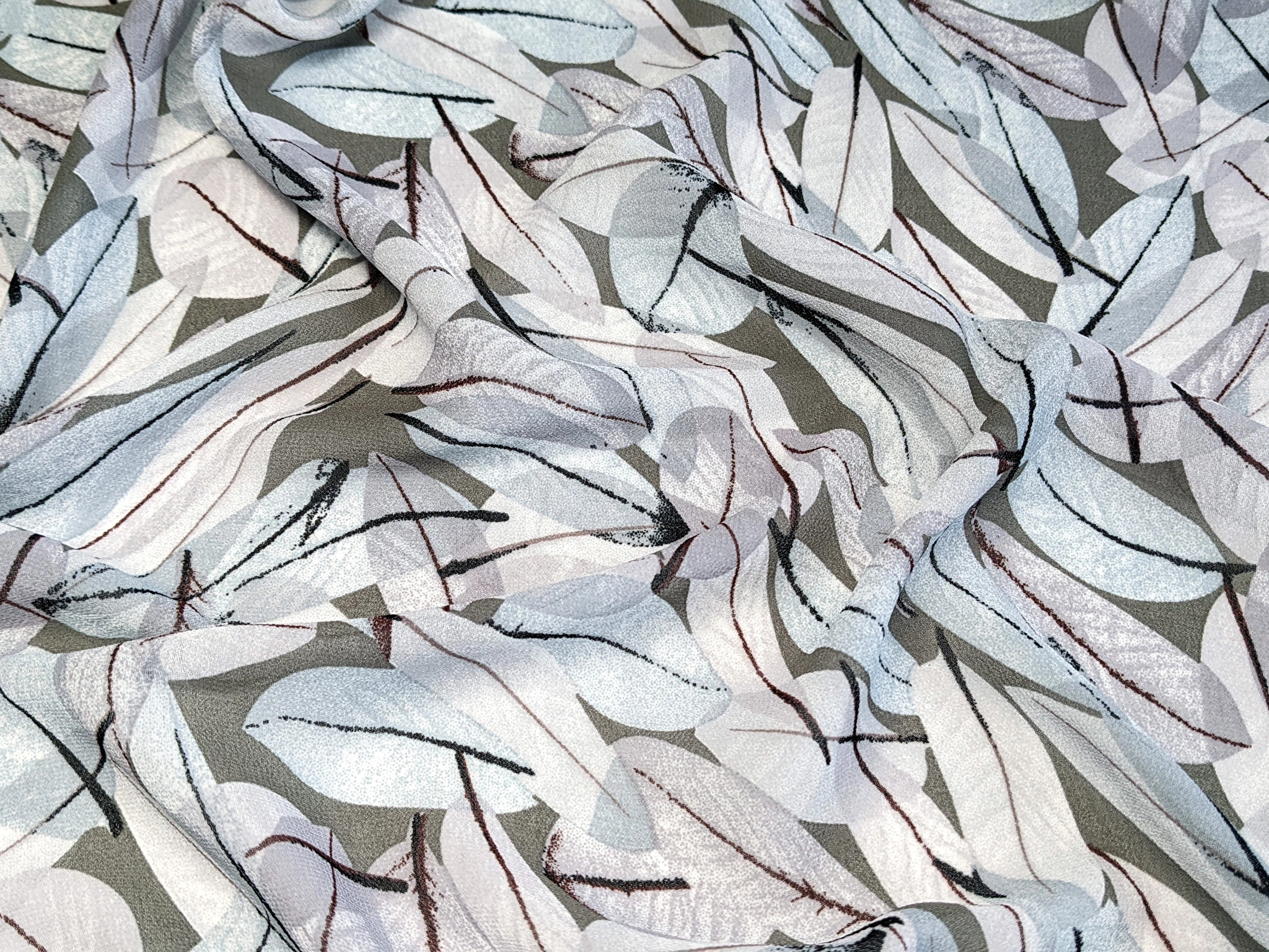 Принтованный креп-шифон - это полупрозрачная шероховатая ткань. Ткань красиво драпируется. Стирать и гладить изделия из крепа- шифона стоит с осторожностью, выбирая деликатные режимы. Полотно очень прочное благодаря туго переплетённым нитям. Для пошива платьев рекомендуем приобрести легкую подкладочную ткань.