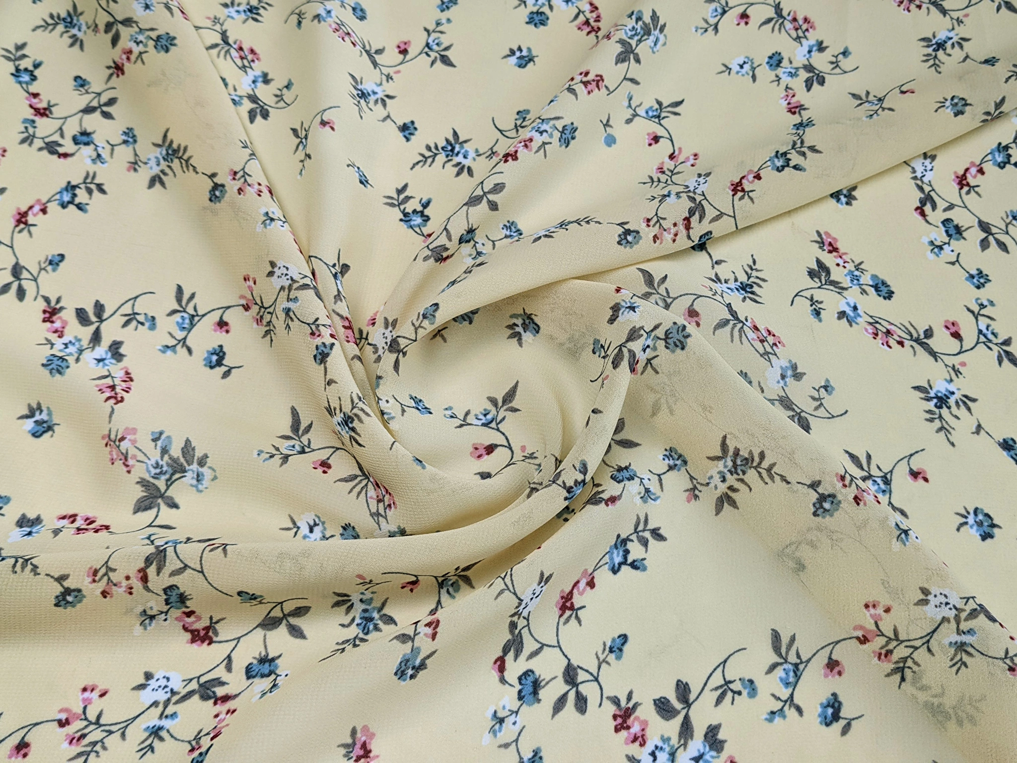 Принтованный креп-шифон - это полупрозрачная шероховатая ткань. Ткань красиво драпируется. Стирать и гладить изделия из крепа- шифона стоит с осторожностью, выбирая деликатные режимы. Полотно очень прочное благодаря туго переплетённым нитям. Для пошива платьев рекомендуем приобрести легкую подкладочную ткань.