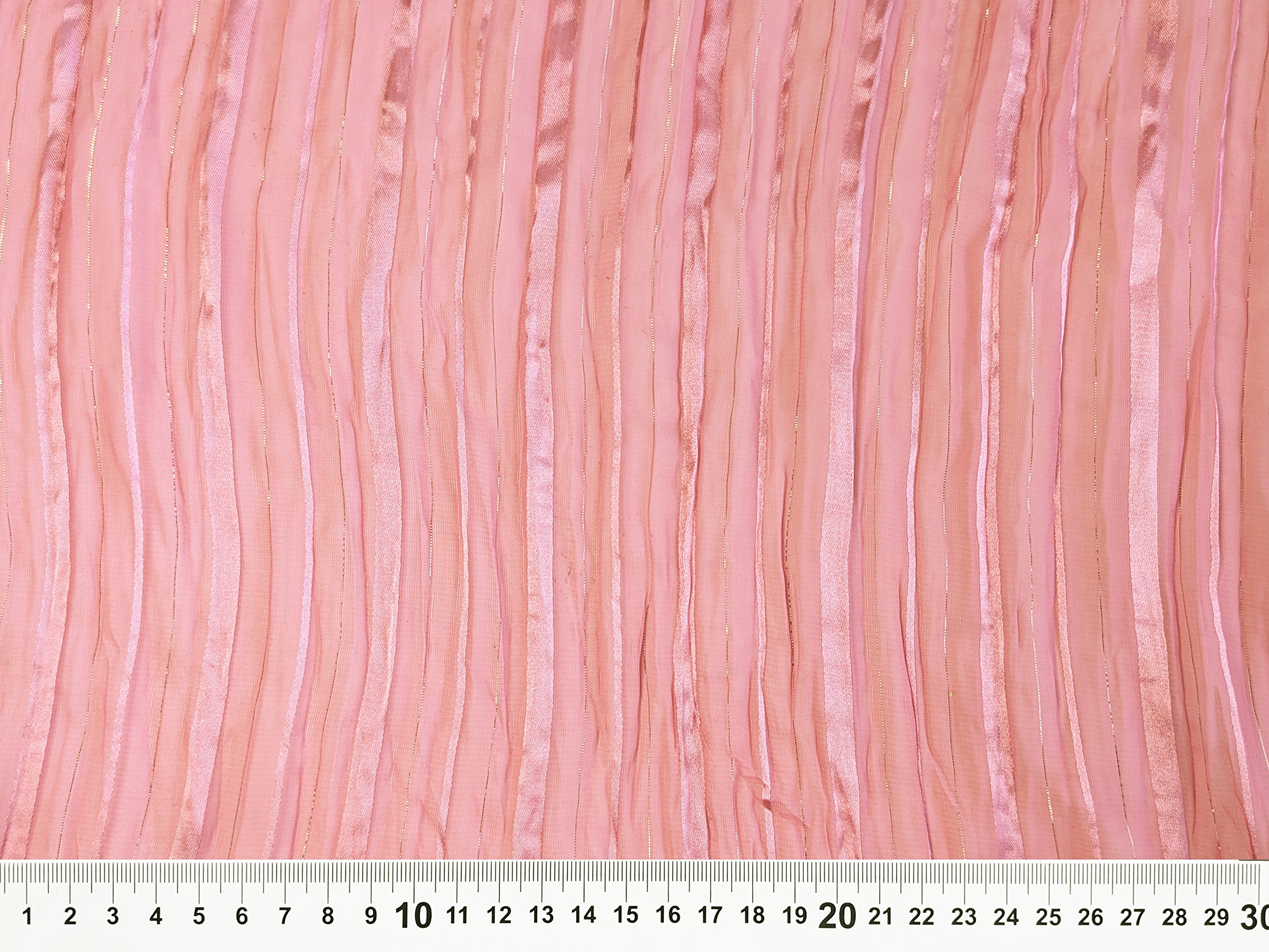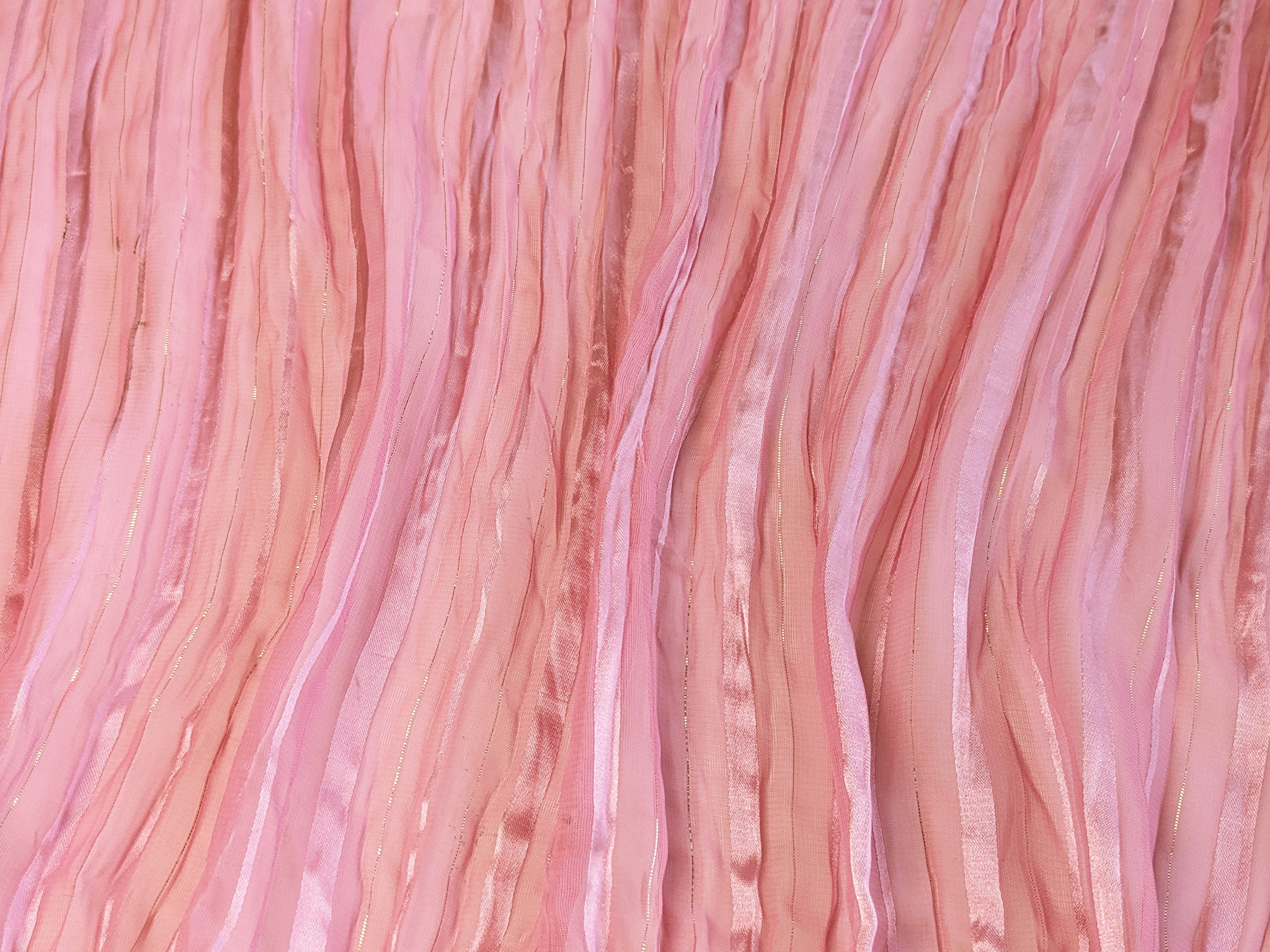 Шифон с люрексом - легкий, тонкий, полупрозрачный материал с поджатой структурой. Люрексовые нити вплетены в структуру полотна, лицевую сторону украшают тонкие атласные полоски. Полотно не мнется, не тянется, просвечивает. Для пошива некоторых изделий требуется подкладочная ткань.